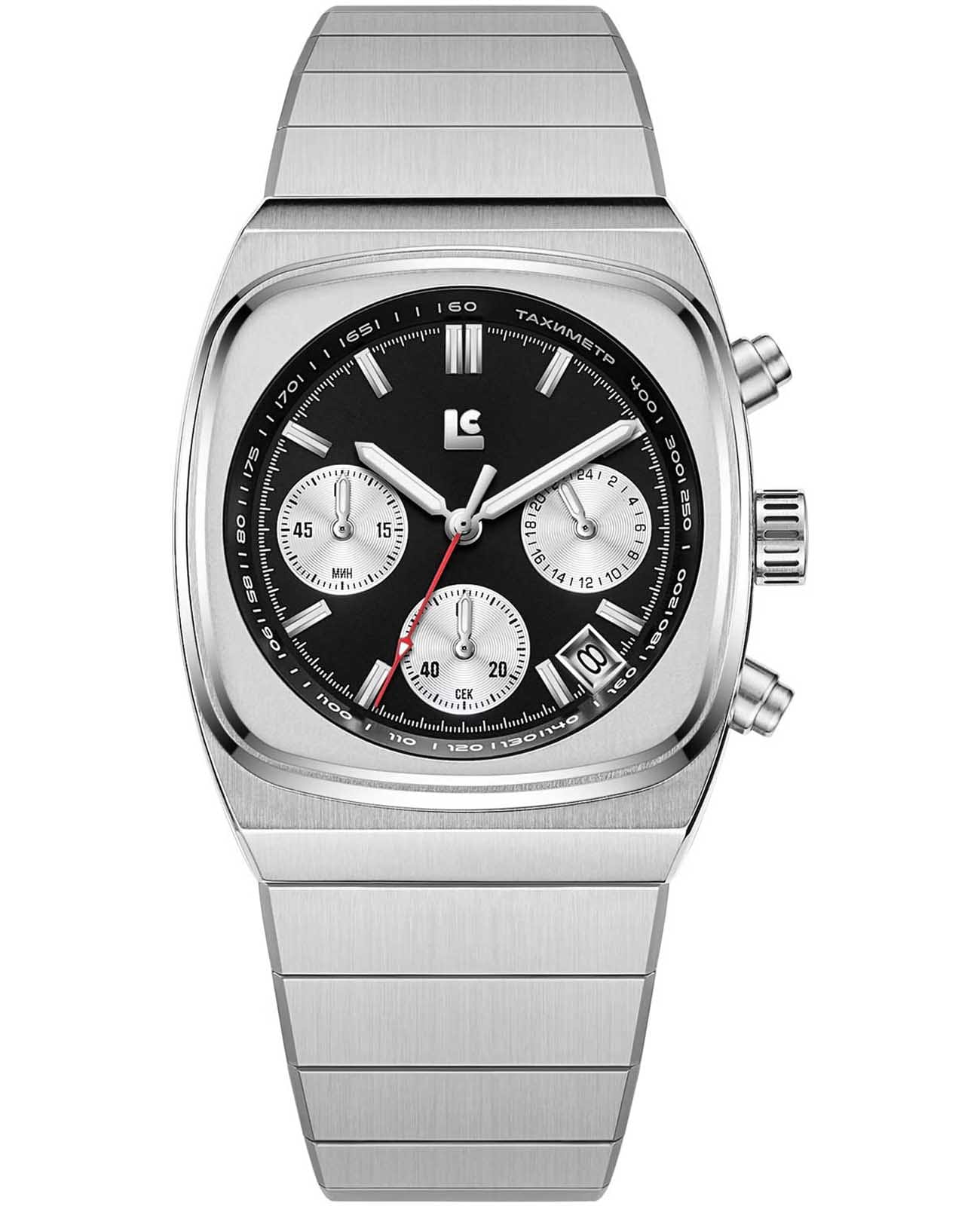 Lincor 4151B-2 — часы с хронографомХронографФункция позволяет измерять отрезки времени с особой точностью: часы, минуты, секунды. Верным признаком хронографа является наличие на циферблате 3 дополнительных окошек-счётчиков. и секундомеромСекундомерСекундоме́р — прибор, способный измерять интервалы времени с точностью до долей секунды., рассчитанные на ежедневное ношение. Корпус из серебристой нержавеющей стали размером 36 × 44 мм дополняет стальной браслет с застёжкой-бабочкой с кнопкамиЗастёжка "бабочка"Такой вид застёжки дополняется предохранителями, помогающими избежать случайного раскрытия браслета. Обладают изящным исполнением. , обеспечивающей надёжную фиксацию. Циферблат с контрастными стрелками и метками, покрытыми люминесцентным покрытиемЛюминесцентное покрытиеПозволяет считывать показания времени в темноте. Производители наносят на стрелки, часовые индексы, безель или поверхность циферблата светонакопительный состав, дающий холодное свечение., позволяет легко считывать время при низком освещении. Сапфировое стеклоСапфировое стеклоПрочный и надёжный материал из кристалла сапфира синтетического происхождения, характеризующийся особой твёрдостью и устойчивостью к царапинам и повреждениям. с антибликовым покрытиемАнтибликовое покрытиеСлой оксида металла в 0,13-0,3 микрон, благодаря которому стекло часов не бликует и не отражает свет. Антибликовое покрытие уменьшает отражение света в 10 раз, обеспечивая отличную читаемость показателей циферблата. защищает поверхность от царапин и отражений. На внешнем кольце расположена шкала тахиметраТахиметрРазмеченная шкала, располагается на ободке или безеле часов. Тахиметр позволяет рассчитать скорость на определённом участке пути, расстояние измеряется в километрах или милях., а окошко даты — между 4 и 5 часами. Водозащита 50 метров предотвращает попадание брызг и дождя, плавание не предусмотрено.
