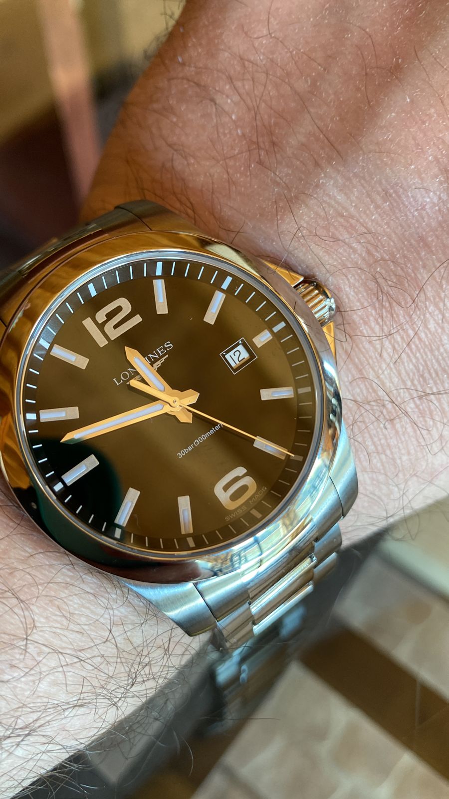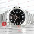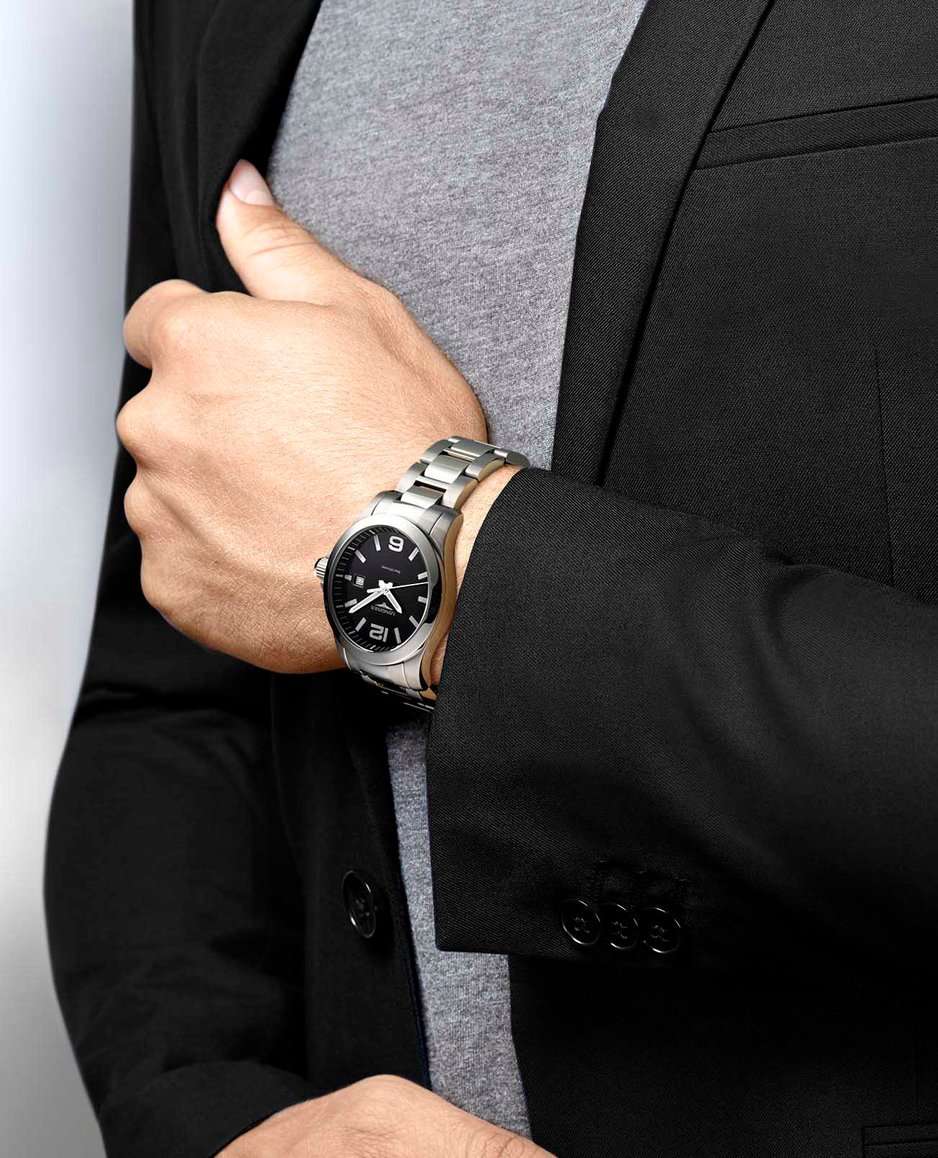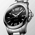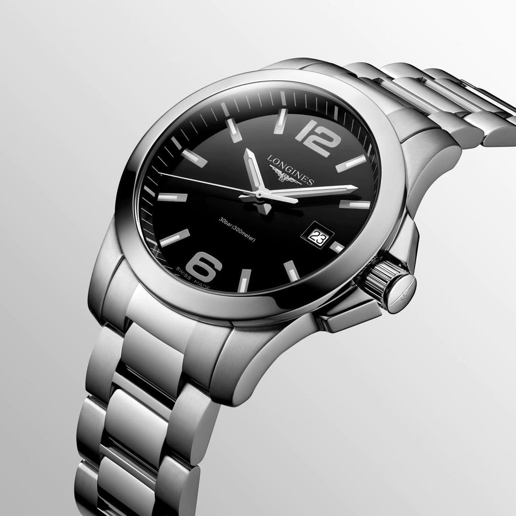 Часы Longines Conquest L3.759.4.58.6 сочетают спортивную элегантность и высокую функциональность, характерные для коллекции Conquest. Корпус диаметром 41 мм выполнен из нержавеющей стали с водозащитой до 30 бар (300 метров). Завинчивающаяся заводная головка и задняя крышка подчёркивают надёжность. Чёрный лакированный циферблат с полированной отделкой оснащён накладными арабскими цифрами и индексами, индексы с люминесцентным покрытиемЛюминесцентное покрытиеПозволяет считывать показания времени в темноте. Производители наносят на стрелки, часовые индексы, безель или поверхность циферблата светонакопительный состав, дающий холодное свечение., а также окошком даты в положении «3 часа». Циферблат защищён сапфировым стекломСапфировое стеклоПрочный и надёжный материал из кристалла сапфира синтетического происхождения, характеризующийся особой твёрдостью и устойчивостью к царапинам и повреждениям. с антибликовым покрытиемАнтибликовое покрытиеСлой оксида металла в 0,13-0,3 микрон, благодаря которому стекло часов не бликует и не отражает свет. Антибликовое покрытие уменьшает отражение света в 10 раз, обеспечивая отличную читаемость показателей циферблата.. Модель оснащена кварцевым механизмом Longines L157 с функцией индикации окончания срока службы батареи EOLEOLПредставляет собой систему, уведомляющую владельца часов о необходимости замены элемента питания. За 2 недели до полного разряда батарейки секундная стрелка перестаёт ходить чётко и начинает перепрыгивать на 3-4 деления.. Окошко даты расположено в позиции «3 часа». Браслет из нержавеющей стали с застёжкой бабочкойЗастёжка "бабочка"Такой вид застёжки дополняется предохранителями, помогающими избежать случайного раскрытия браслета. Обладают изящным исполнением. и механизмом открытия с кнопками обеспечивает комфортное и надёжное ношение. Эти часы идеально подходят для тех, кто ценит надёжность, спортивный стиль и элегантность.