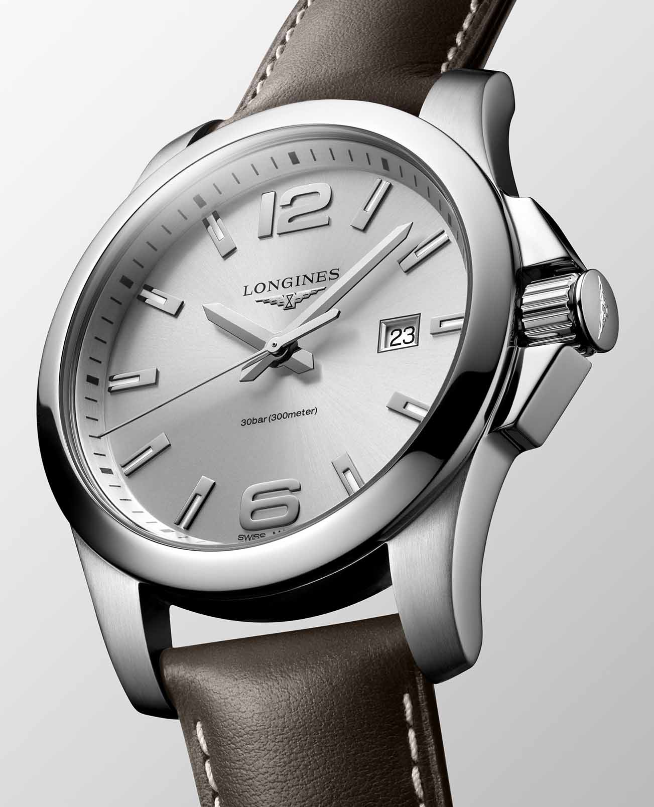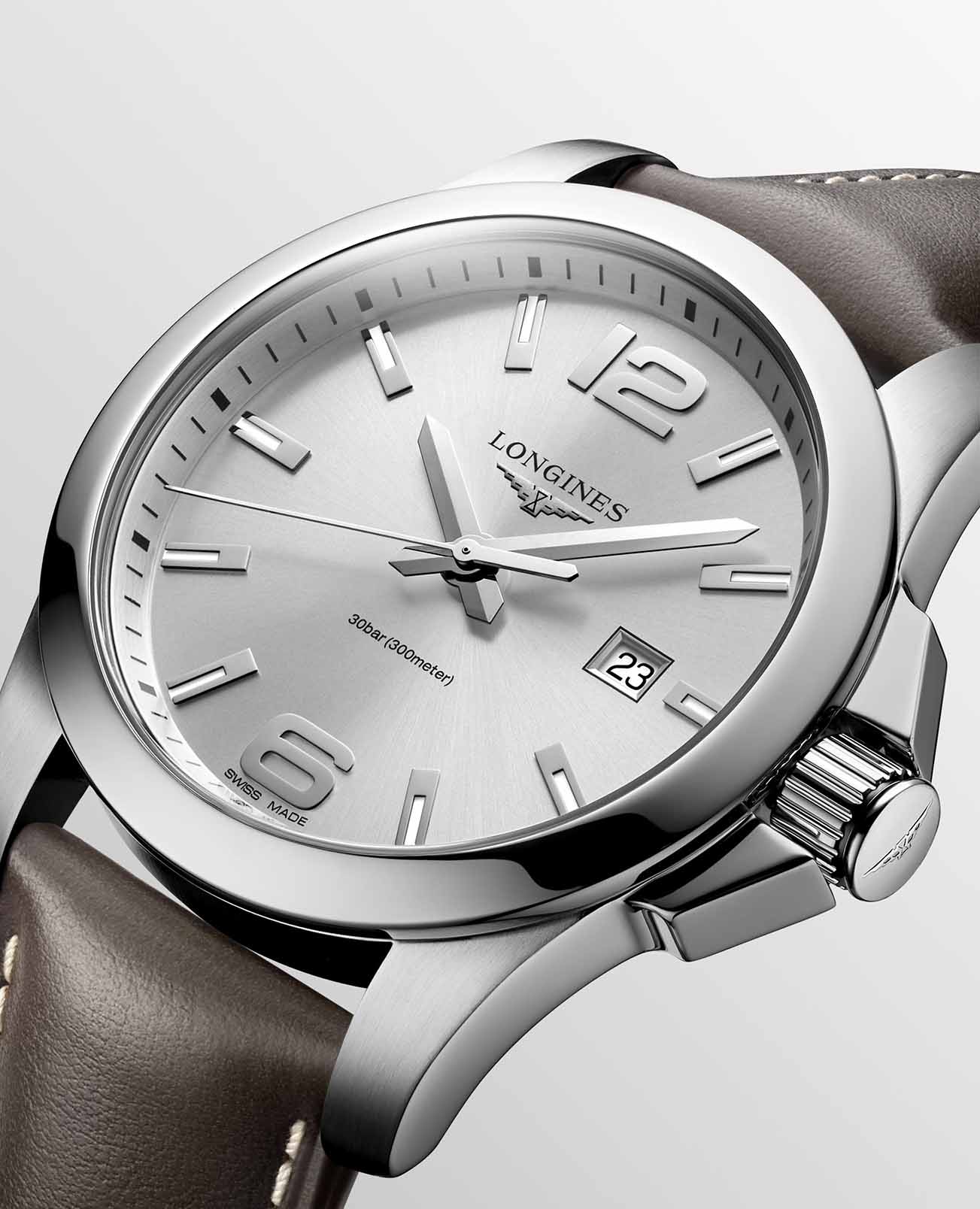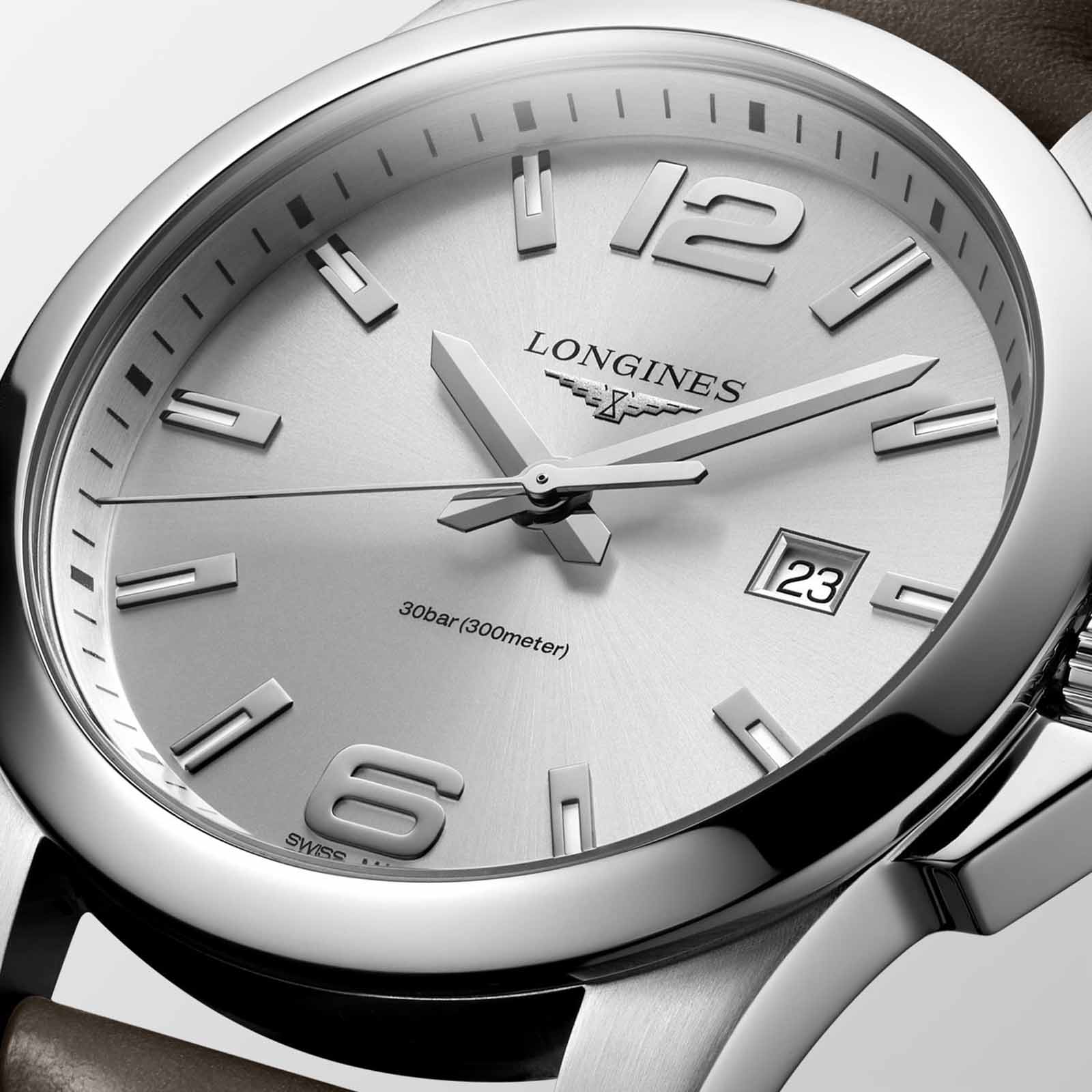 Часы Longines Conquest (артикул L37604765) сочетают спортивную элегантность и высокую функциональность, характерные для коллекции Conquest. Корпус диаметром 43 мм выполнен из нержавеющей стали с водозащитой до 30 бар (300 метров). Завинчивающаяся заводная головка и задняя крышка подчёркивают надёжность. Серебристый циферблат с солнечным узором оснащён накладными арабскими цифрами и индексами, стрелками с люминесцентным покрытиемЛюминесцентное покрытиеПозволяет считывать показания времени в темноте. Производители наносят на стрелки, часовые индексы, безель или поверхность циферблата светонакопительный состав, дающий холодное свечение., а также окошком даты в положении «3 часа». Циферблат защищён сапфировым стекломСапфировое стеклоПрочный и надёжный материал из кристалла сапфира синтетического происхождения, характеризующийся особой твёрдостью и устойчивостью к царапинам и повреждениям. с антибликовым покрытием.