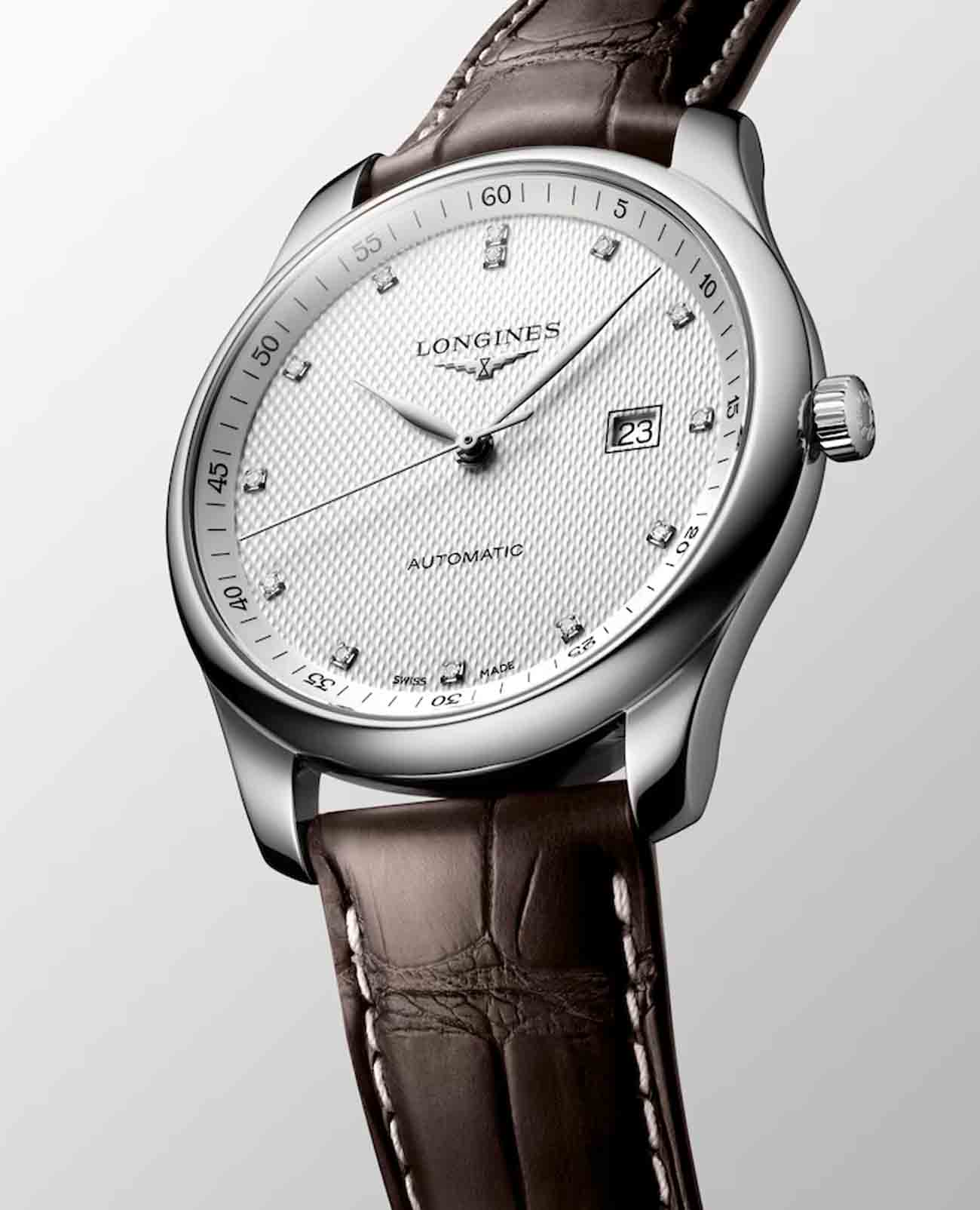 Швейцарские механические часы Longines Master Collection L2.893.4.77.3. Сапфировое стеклоСапфировое стеклоПрочный и надёжный материал из кристалла сапфира синтетического происхождения, характеризующийся особой твёрдостью и устойчивостью к царапинам и повреждениям. устойчивое к появлению царапин, обладающее высокой прозрачностью. Корпус часов изготовлен из нержавеющей стали. Циферблат с 13 бриллиантами группы Top Wesselton VS-SI общим весом 0.059 карата. Окошко даты в положении 3 часа. Автоматический механизм с частотой баланса 25 200 полуколебаний в час и запасом хода, которого хватает примерно на 72 часа работы. Класс водозащиты: 30 метров, позволит защитить корпус от случайных брызг или капель дождя. Ремешок из кожи аллигатора на застёжке «бабочка» с кнопкамиЗастёжка "бабочка"Такой вид застёжки дополняется предохранителями, помогающими избежать случайного раскрытия браслета. Обладают изящным исполнением. .