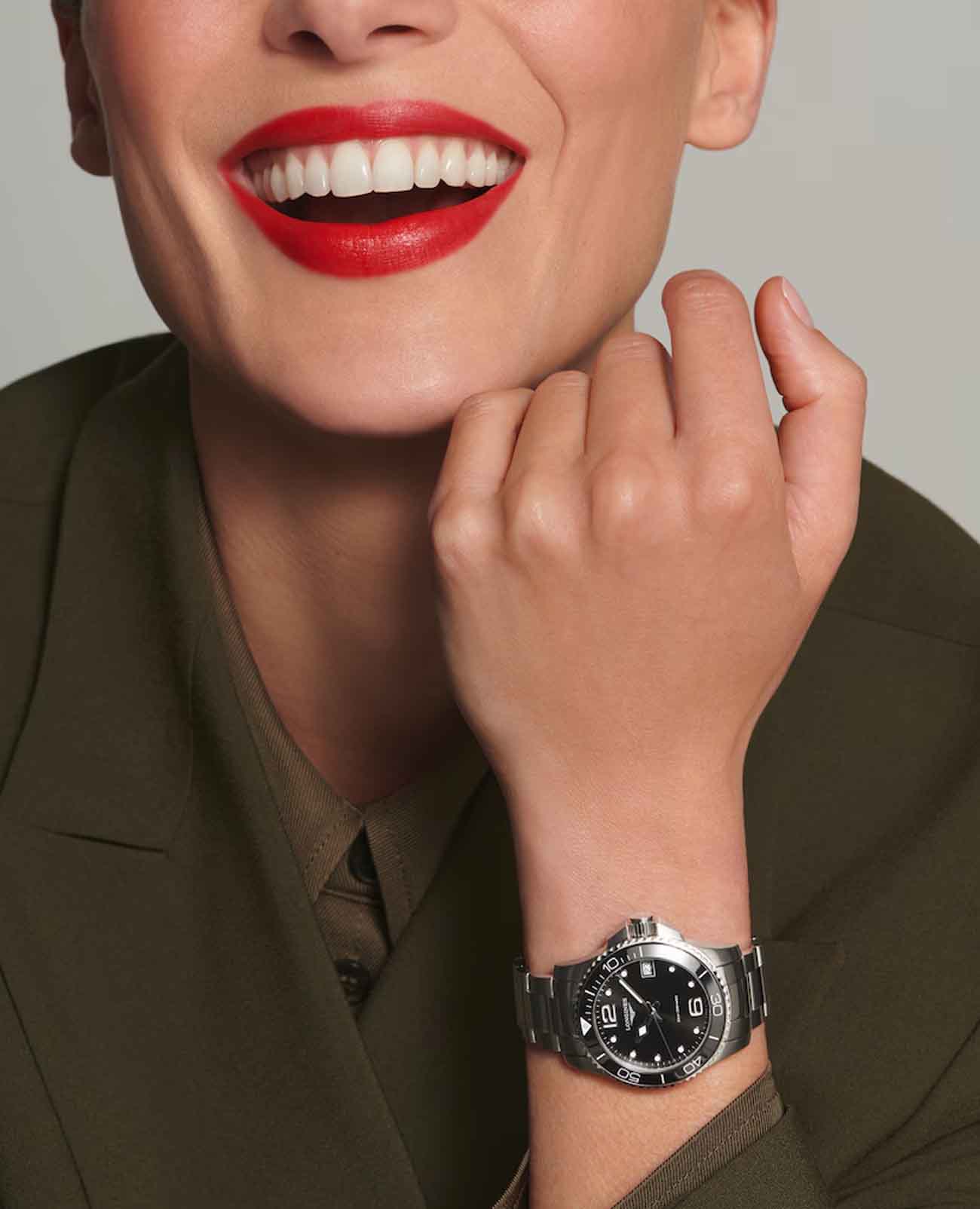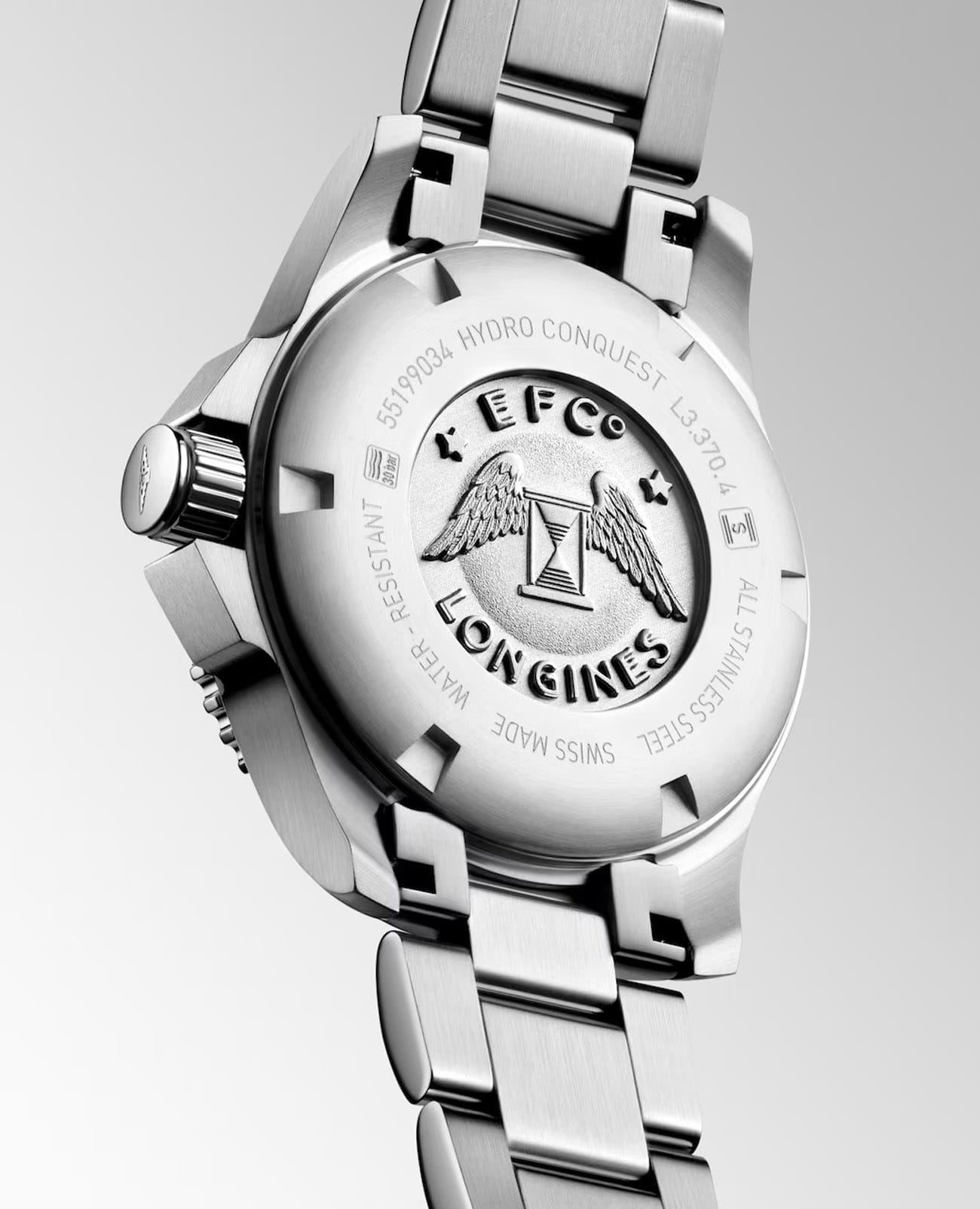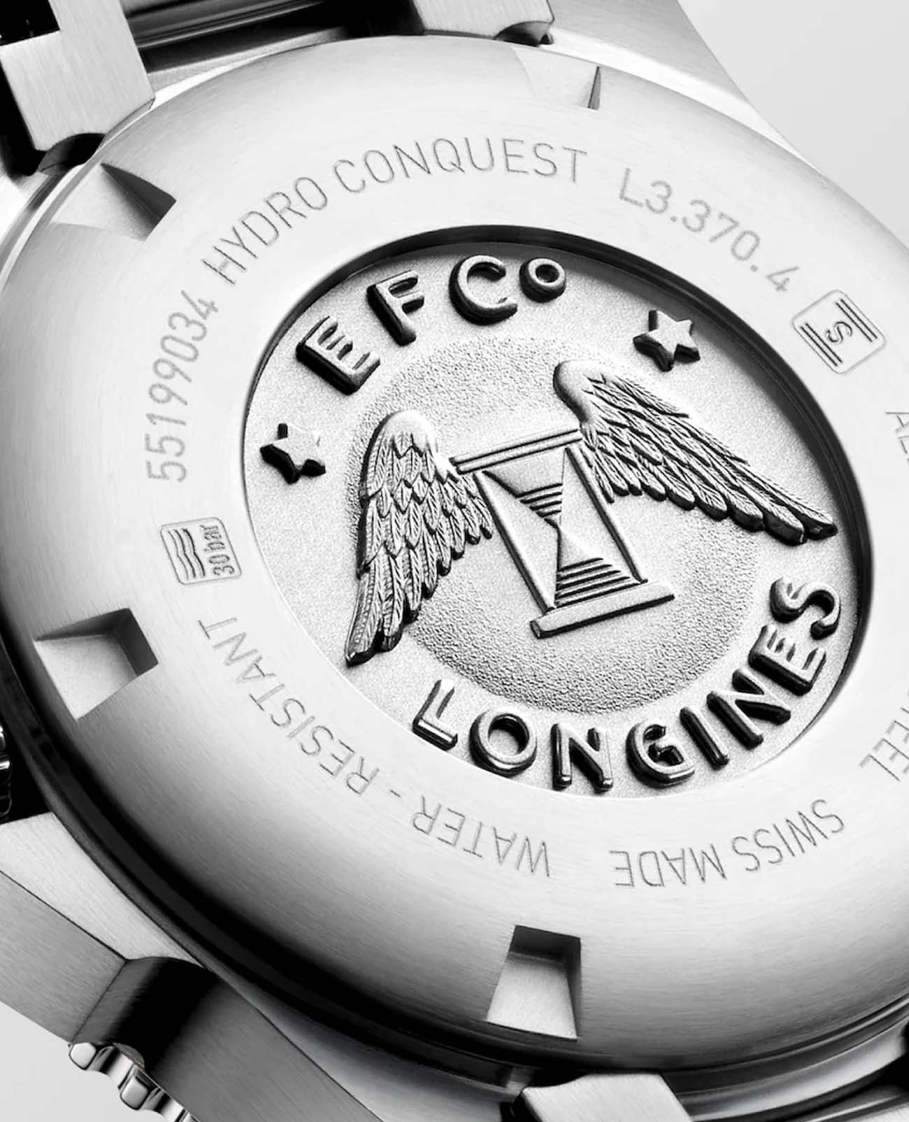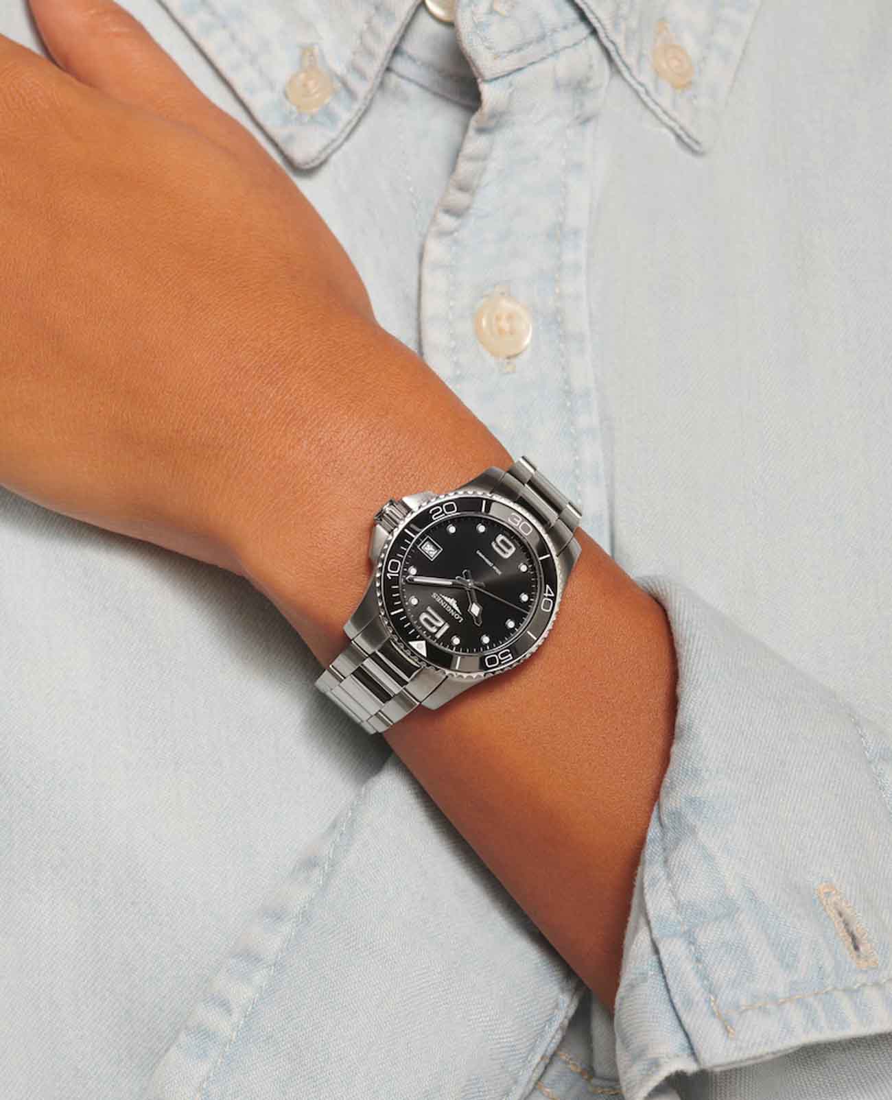 Женские швейцарские часы для дайвинга Longines HydroConquest L3.370.4.56.6, кварцевый механизм с высокой точностью. Сапфировое стеклоСапфировое стеклоПрочный и надёжный материал из кристалла сапфира синтетического происхождения, характеризующийся особой твёрдостью и устойчивостью к царапинам и повреждениям. с многослойным антибликовым покрытием с обеих сторон, устойчивое к появлению царапин, обладающее высокой прозрачностью. Корпус часов изготовлен из стали. Вращающийся безельБезельВнешний ободок, закрепляющий стекло. В спортивных часах так называется поворотное кольцо с делениями на циферблате, выполняет роль таймера – замеряет отрезки времени на шкале. Неподвижный безель – элемент декора. Однонаправленно вращающийся безель на дайверских часах позволяет фиксировать моменты погружения и выныривания на поверхность. из стали и керамики, защищенный от царапин, никогда не изнашивается и не выцветает. Стрелки и метки с люминесцентным покрытиемЛюминесцентное покрытиеПозволяет считывать показания времени в темноте. Производители наносят на стрелки, часовые индексы, безель или поверхность циферблата светонакопительный состав, дающий холодное свечение.. Окошко даты находится в положении 3 часов. Класс водозащиты: 300 метров, позволит плавать, нырять и заниматься другими водными видами спорта. Стальной браслет на раскладной застёжкеРаскладная застёжкаТакой тип застёжки используется только на браслетах из металла. Она никогда не раскрывается полностью, происходит разделение на 2 и более частей. Раскладывающая застёжка снизит вероятность потери часов к минимуму..
