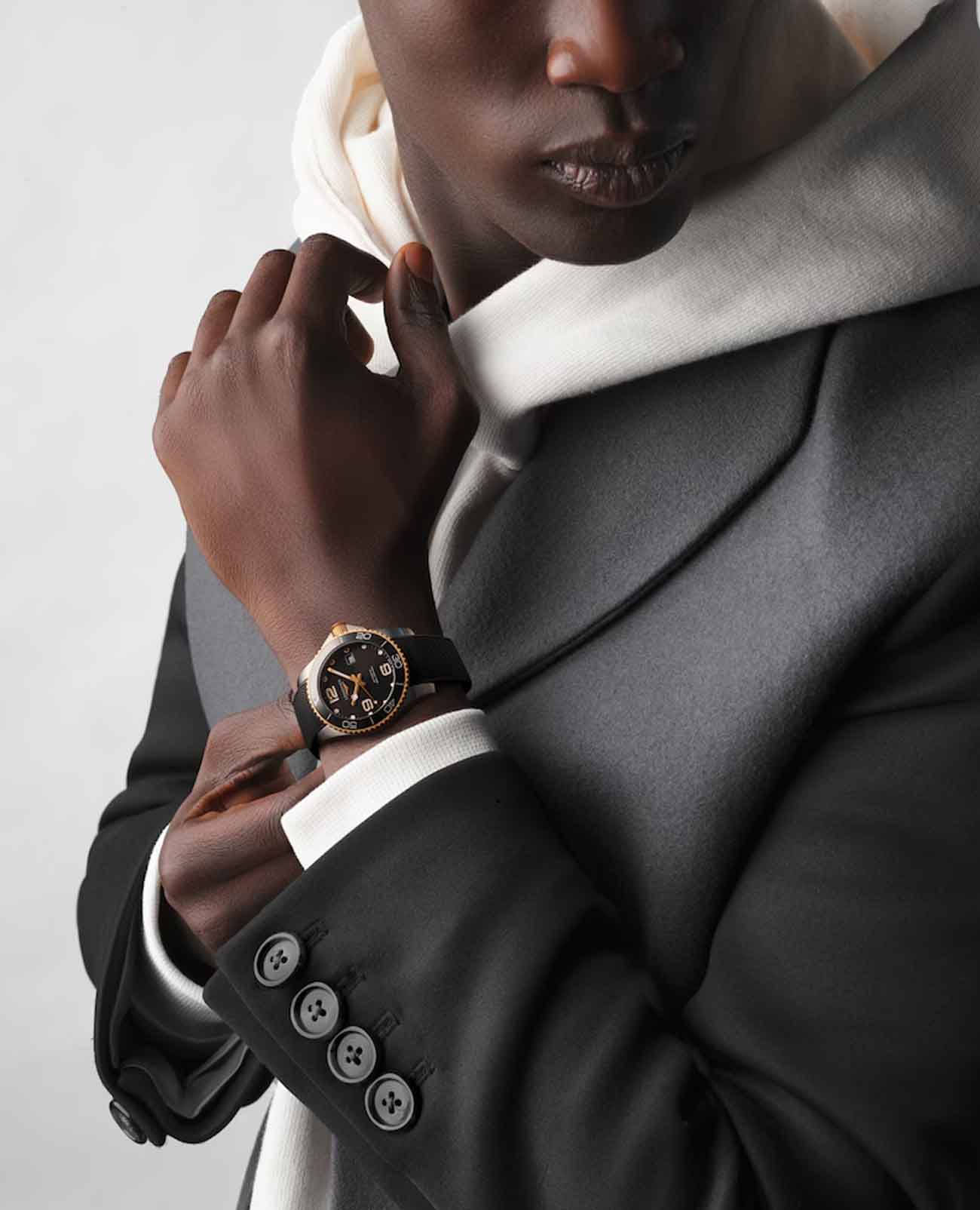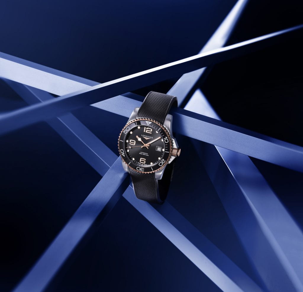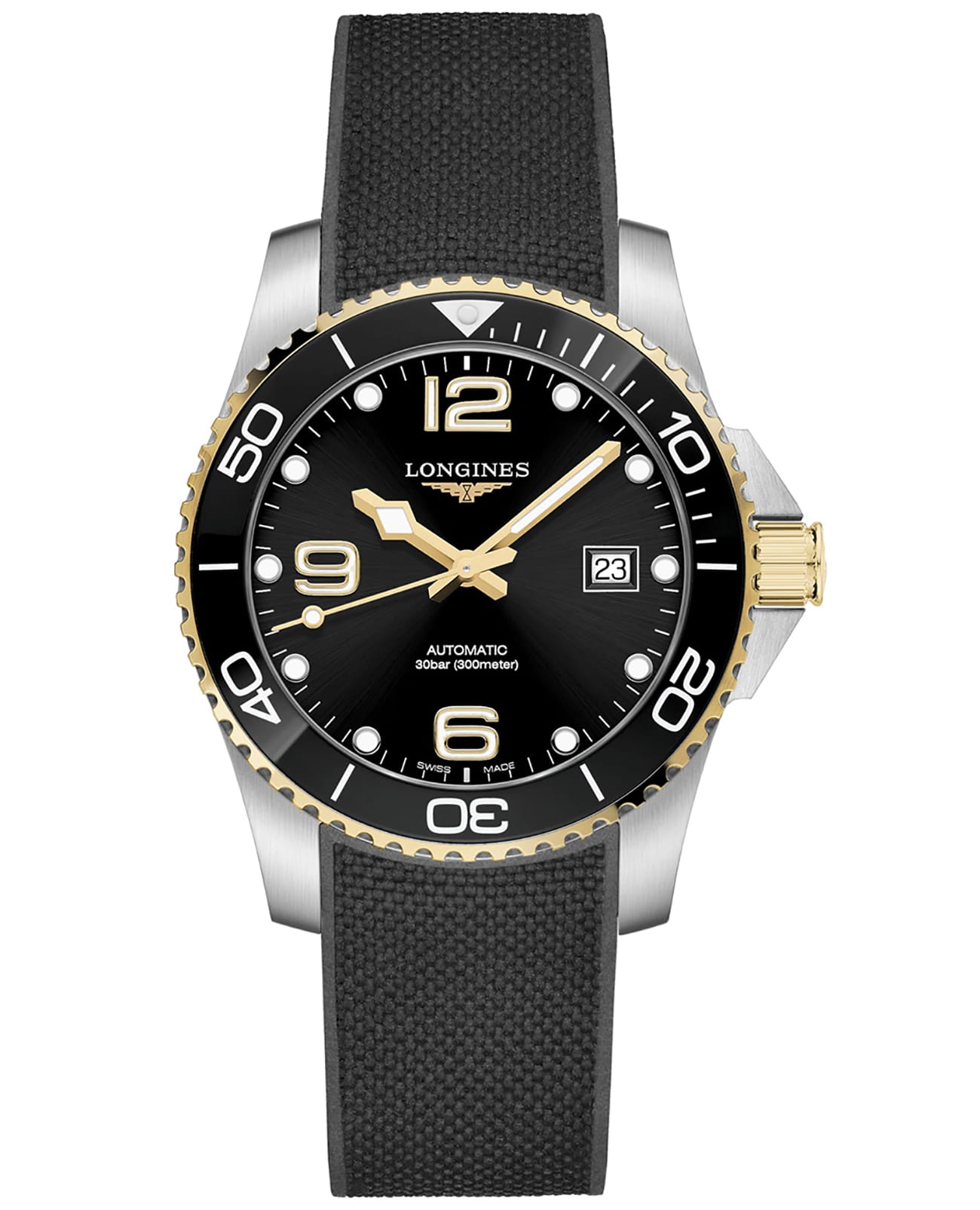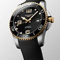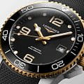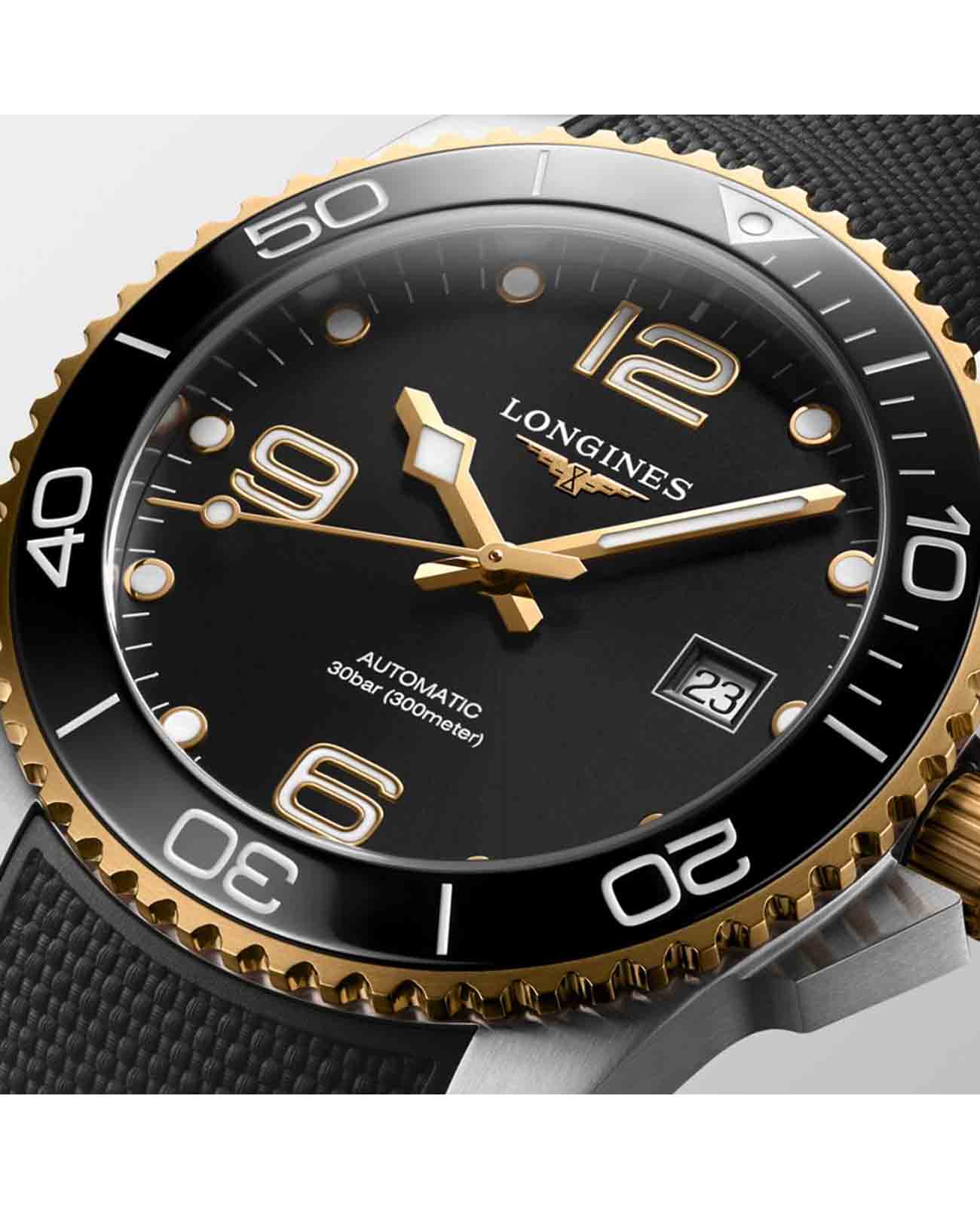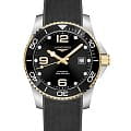 Мужские механические швейцарские часы с автоподзаводом Longines HydroConquest L3.781.3.56.9. Сапфировое стеклоСапфировое стеклоПрочный и надёжный материал из кристалла сапфира синтетического происхождения, характеризующийся особой твёрдостью и устойчивостью к царапинам и повреждениям. с антибликовым покрытием, устойчивое к мелким механическим повреждениям. Корпус часов изготовлен из нержавеющей стали. Вращающийся стальной безельБезельВнешний ободок, закрепляющий стекло. В спортивных часах так называется поворотное кольцо с делениями на циферблате, выполняет роль таймера – замеряет отрезки времени на шкале. Неподвижный безель – элемент декора. Однонаправленно вращающийся безель на дайверских часах позволяет фиксировать моменты погружения и выныривания на поверхность. с люминесцентным покрытиемЛюминесцентное покрытиеПозволяет считывать показания времени в темноте. Производители наносят на стрелки, часовые индексы, безель или поверхность циферблата светонакопительный состав, дающий холодное свечение. Superluminova из нержавеющей стали с PVD-покрытиемPVDУльтратонкое покрытие наносится в технике вакуумного напыления, сочетает в себе нитрид титана особой прочности со слоем золота или оксида хрома. Несёт в себе декоративную или защитную функцию. и керамики, защищенный от царапин, никогда не изнашивается и не выцветает. Стрелки и метки с люминесцентным покрытиемЛюминесцентное покрытиеПозволяет считывать показания времени в темноте. Производители наносят на стрелки, часовые индексы, безель или поверхность циферблата светонакопительный состав, дающий холодное свечение.. Окошко даты находится в положении 3 часа. Класс водозащиты: 300 метров, позволит плавать, нырять и заниматься другими водными видами спорта. Каучуковый ремешок на раскладной застёжкеРаскладная застёжкаТакой тип застёжки используется только на браслетах из металла. Она никогда не раскрывается полностью, происходит разделение на 2 и более частей. Раскладывающая застёжка снизит вероятность потери часов к минимуму. с удлинением для дайверов.