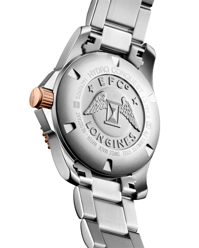 Мужские механические швейцарские часы с автоподзаводом Longines HydroConquest L3.781.3.58.7. Сапфировое стеклоСапфировое стеклоПрочный и надёжный материал из кристалла сапфира синтетического происхождения, характеризующийся особой твёрдостью и устойчивостью к царапинам и повреждениям. с антибликовым покрытием, устойчивое к мелким механическим повреждениям. Корпус часов изготовлен из нержавеющей стали. Вращающийся стальной безельБезельВнешний ободок, закрепляющий стекло. В спортивных часах так называется поворотное кольцо с делениями на циферблате, выполняет роль таймера – замеряет отрезки времени на шкале. Неподвижный безель – элемент декора. Однонаправленно вращающийся безель на дайверских часах позволяет фиксировать моменты погружения и выныривания на поверхность. с люминесцентным покрытиемЛюминесцентное покрытиеПозволяет считывать показания времени в темноте. Производители наносят на стрелки, часовые индексы, безель или поверхность циферблата светонакопительный состав, дающий холодное свечение. Superluminova из нержавеющей стали с PVD-покрытиемPVDУльтратонкое покрытие наносится в технике вакуумного напыления, сочетает в себе нитрид титана особой прочности со слоем золота или оксида хрома. Несёт в себе декоративную или защитную функцию. и керамики, защищенный от царапин, никогда не изнашивается и не выцветает. Стрелки и метки с люминесцентным покрытиемЛюминесцентное покрытиеПозволяет считывать показания времени в темноте. Производители наносят на стрелки, часовые индексы, безель или поверхность циферблата светонакопительный состав, дающий холодное свечение.. Окошко даты находится в положении 3 часа. Класс водозащиты: 300 метров, позволит плавать, нырять и заниматься другими водными видами спорта. Стальной браслет с частичным PVD-покрытиемPVDУльтратонкое покрытие наносится в технике вакуумного напыления, сочетает в себе нитрид титана особой прочности со слоем золота или оксида хрома. Несёт в себе декоративную или защитную функцию. на раскладной застёжкеРаскладная застёжкаТакой тип застёжки используется только на браслетах из металла. Она никогда не раскрывается полностью, происходит разделение на 2 и более частей. Раскладывающая застёжка снизит вероятность потери часов к минимуму. с удлинением для дайверов.