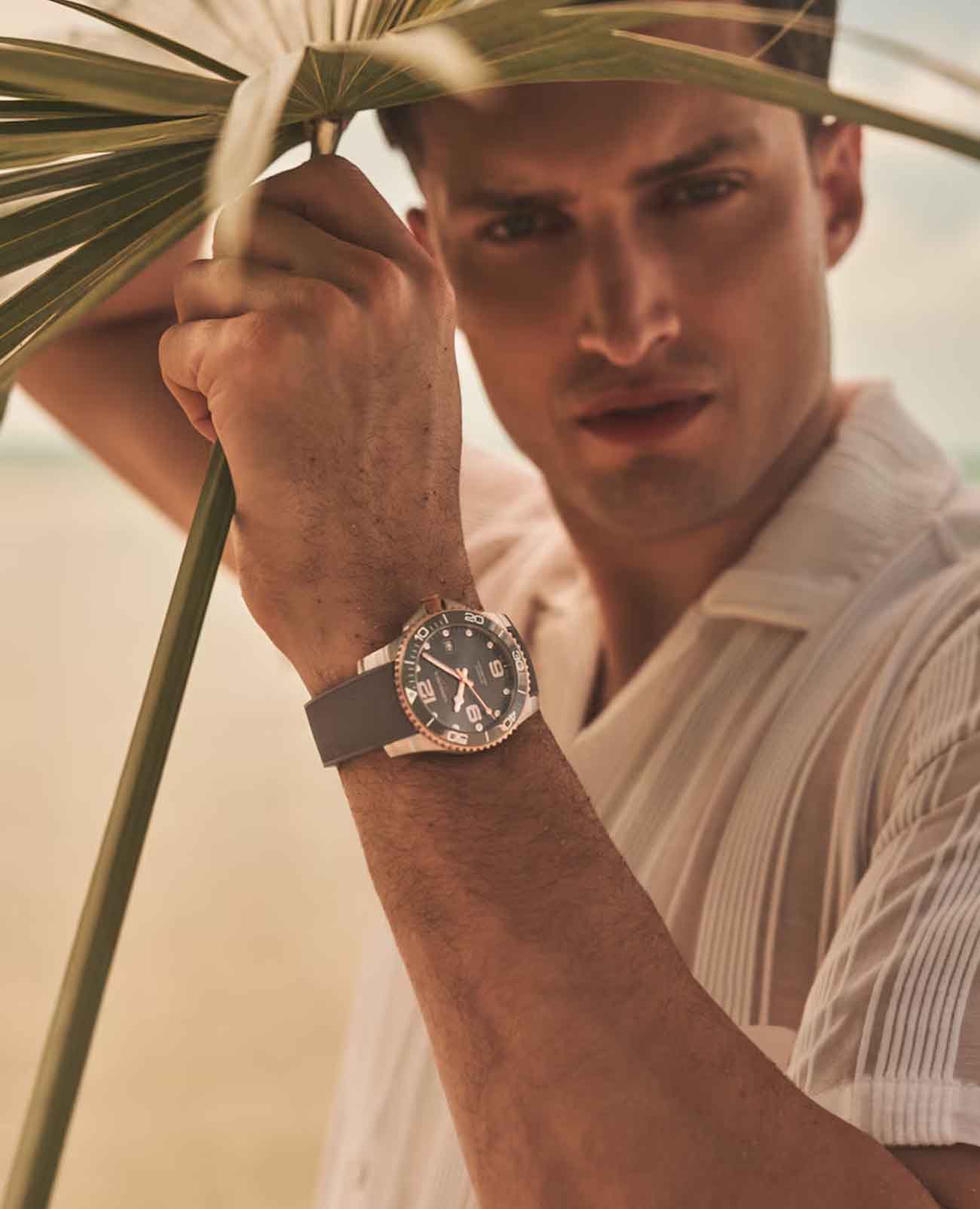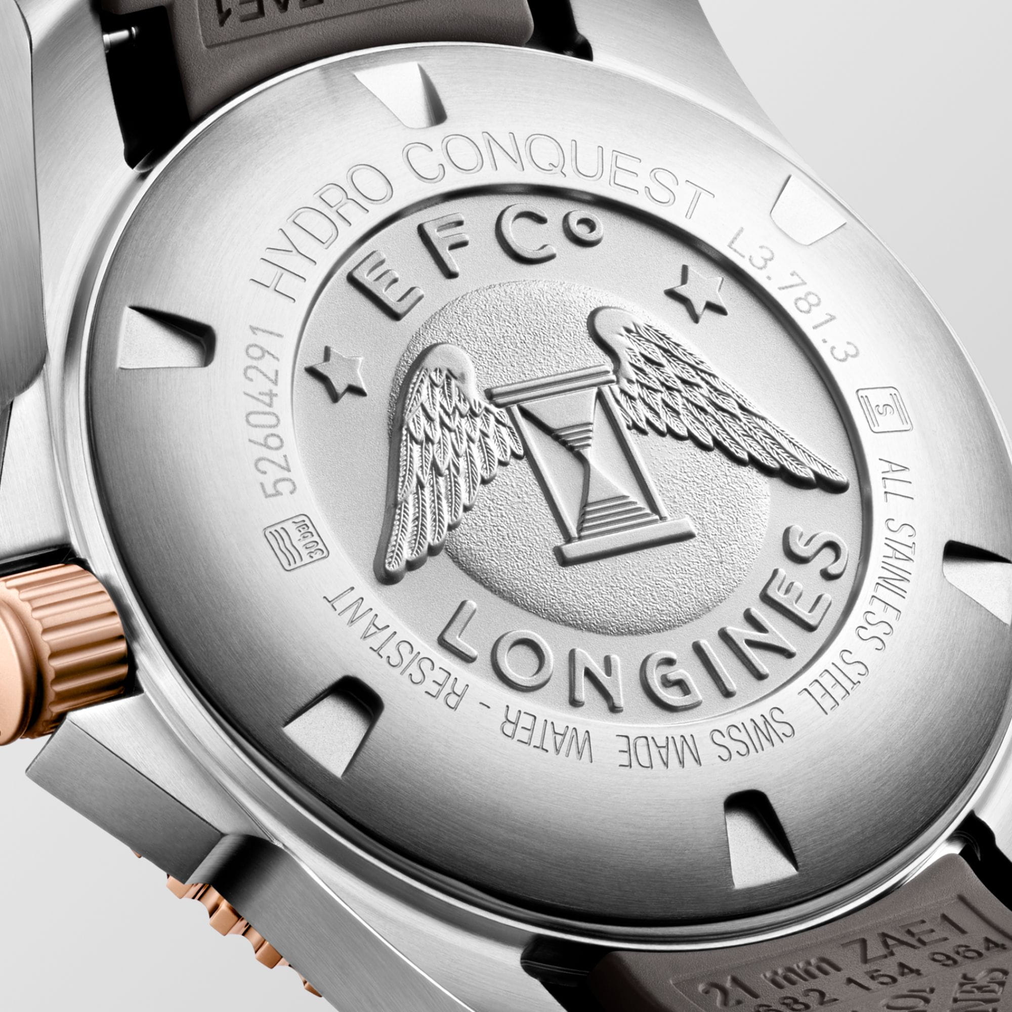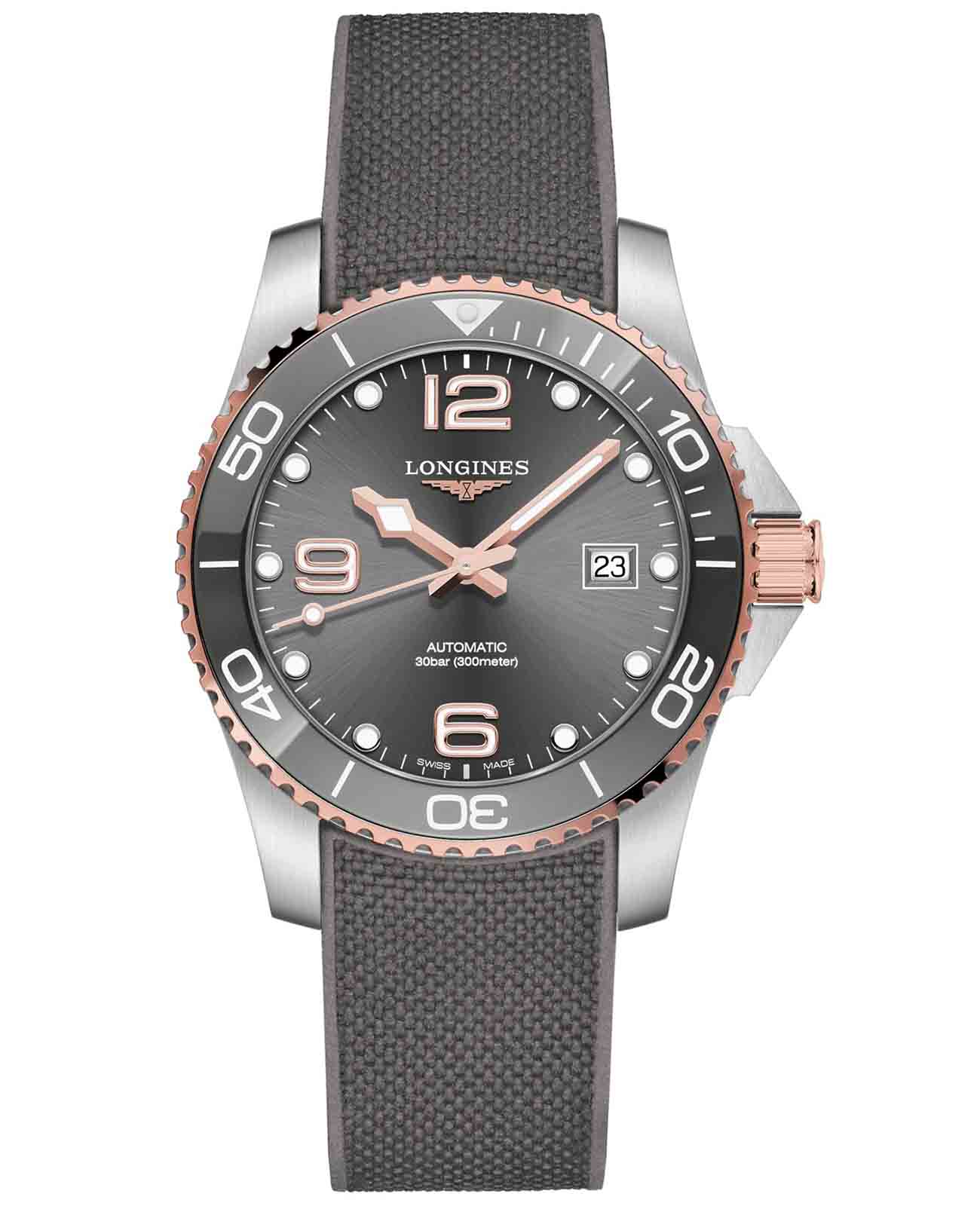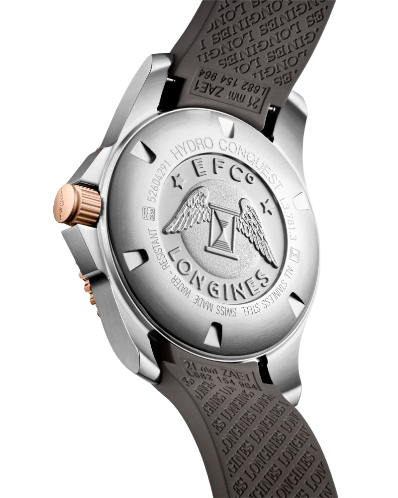 Мужские механические швейцарские часы с автоподзаводом Longines HydroConquest L3.781.3.78.9. Сапфировое стеклоСапфировое стеклоПрочный и надёжный материал из кристалла сапфира синтетического происхождения, характеризующийся особой твёрдостью и устойчивостью к царапинам и повреждениям. с антибликовым покрытием, устойчивое к мелким механическим повреждениям. Корпус часов изготовлен из нержавеющей стали. Вращающийся стальной безельБезельВнешний ободок, закрепляющий стекло. В спортивных часах так называется поворотное кольцо с делениями на циферблате, выполняет роль таймера – замеряет отрезки времени на шкале. Неподвижный безель – элемент декора. Однонаправленно вращающийся безель на дайверских часах позволяет фиксировать моменты погружения и выныривания на поверхность. с люминесцентным покрытиемЛюминесцентное покрытиеПозволяет считывать показания времени в темноте. Производители наносят на стрелки, часовые индексы, безель или поверхность циферблата светонакопительный состав, дающий холодное свечение. Superluminova из нержавеющей стали с PVD-покрытиемPVDУльтратонкое покрытие наносится в технике вакуумного напыления, сочетает в себе нитрид титана особой прочности со слоем золота или оксида хрома. Несёт в себе декоративную или защитную функцию. и керамики, защищенный от царапин, никогда не изнашивается и не выцветает. Стрелки и метки с люминесцентным покрытиемЛюминесцентное покрытиеПозволяет считывать показания времени в темноте. Производители наносят на стрелки, часовые индексы, безель или поверхность циферблата светонакопительный состав, дающий холодное свечение.. Окошко даты находится в положении 3 часа. Класс водозащиты: 300 метров, позволит плавать, нырять и заниматься другими водными видами спорта. Каучуковый ремешок на раскладной застёжкеРаскладная застёжкаТакой тип застёжки используется только на браслетах из металла. Она никогда не раскрывается полностью, происходит разделение на 2 и более частей. Раскладывающая застёжка снизит вероятность потери часов к минимуму. с удлинением для дайверов.