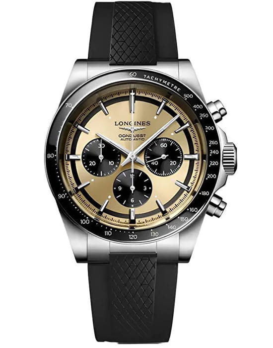 Мужские швейцарские механические часы- хронографХронографФункция позволяет измерять отрезки времени с особой точностью: часы, минуты, секунды. Верным признаком хронографа является наличие на циферблате 3 дополнительных окошек-счётчиков. Longines Conquest L3.835.4.32.9. Сапфировое стеклоСапфировое стеклоПрочный и надёжный материал из кристалла сапфира синтетического происхождения, характеризующийся особой твёрдостью и устойчивостью к царапинам и повреждениям. с многослойным антибликовым покрытием с обеих сторон, устойчивое к появлению царапин, обладающее высокой прозрачностью. Корпус часов изготовлен из стали. Неподвижный безельБезельВнешний ободок, закрепляющий стекло. В спортивных часах так называется поворотное кольцо с делениями на циферблате, выполняет роль таймера – замеряет отрезки времени на шкале. Неподвижный безель – элемент декора. Однонаправленно вращающийся безель на дайверских часах позволяет фиксировать моменты погружения и выныривания на поверхность. из стали и керамики, защищенный от царапин, никогда не изнашивается и не выцветает. Шкала тахиметраТахиметрРазмеченная шкала, располагается на ободке или безеле часов. Тахиметр позволяет рассчитать скорость на определённом участке пути, расстояние измеряется в километрах или милях.. На циферблате расположены три дополнительных циферблата. Стрелки и метки с люминесцентным покрытиемЛюминесцентное покрытиеПозволяет считывать показания времени в темноте. Производители наносят на стрелки, часовые индексы, безель или поверхность циферблата светонакопительный состав, дающий холодное свечение.. Класс водозащиты: 100 метров, позволит плавать, нырять и заниматься другими водными видами спорта. Каучуковый браслет на раскладной застёжкеРаскладная застёжкаТакой тип застёжки используется только на браслетах из металла. Она никогда не раскрывается полностью, происходит разделение на 2 и более частей. Раскладывающая застёжка снизит вероятность потери часов к минимуму..