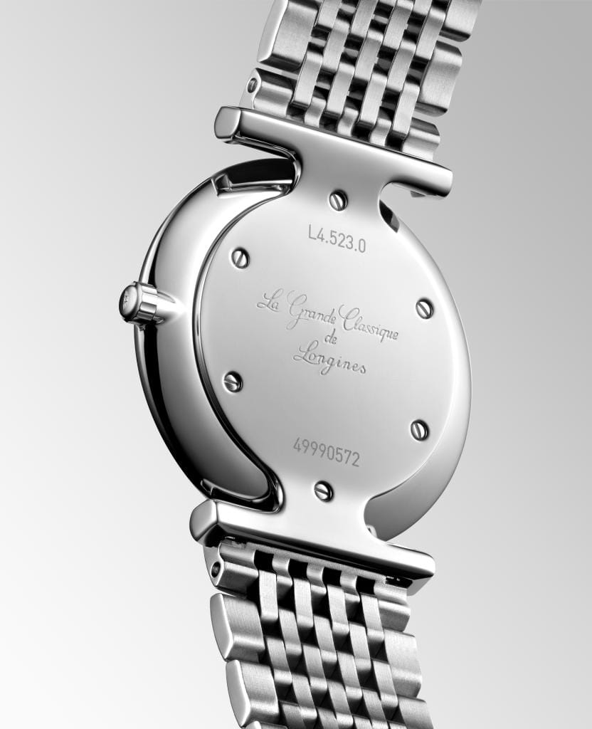 Женские швейцарские часы Longines La Grande Classique L4.523.0.11.6, кварцевый механизм с высокой точностью. Сапфировое стеклоСапфировое стеклоПрочный и надёжный материал из кристалла сапфира синтетического происхождения, характеризующийся особой твёрдостью и устойчивостью к царапинам и повреждениям. устойчивое к появлению царапин, обладающее высокой прозрачностью. Корпус часов изготовлен из стали. БезельБезельВнешний ободок, закрепляющий стекло. В спортивных часах так называется поворотное кольцо с делениями на циферблате, выполняет роль таймера – замеряет отрезки времени на шкале. Неподвижный безель – элемент декора. Однонаправленно вращающийся безель на дайверских часах позволяет фиксировать моменты погружения и выныривания на поверхность. часов декорирован 44 бриллиантами общим весом 0.369 карата. Циферблат украшают нарисованные римские цифры. Класс водозащиты: 30 метров, позволит защитить корпус от случайных брызг или капель дождя. Стальной браслет на застёжке-бабочке с кнопкамиЗастёжка "бабочка"Такой вид застёжки дополняется предохранителями, помогающими избежать случайного раскрытия браслета. Обладают изящным исполнением. .