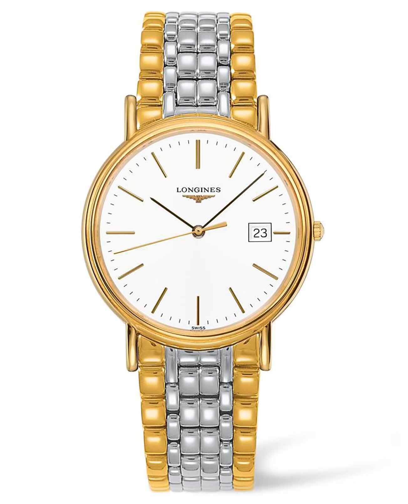 Мужские швейцарские часы Longines Presence L4.790.2.12.7 – образец классического стиля. Белый матовый циферблат идеально сочетается с браслетом с жёлтым PVD-покрытиемPVDУльтратонкое покрытие наносится в технике вакуумного напыления, сочетает в себе нитрид титана особой прочности со слоем золота или оксида хрома. Несёт в себе декоративную или защитную функцию.. Корпус из нержавеющей стали 316L надёжно защищает швейцарский кварцевый механизм L157 от повреждений. Дополнительные функции: календарь, индикатор EOLEOLПредставляет собой систему, уведомляющую владельца часов о необходимости замены элемента питания. За 2 недели до полного разряда батарейки секундная стрелка перестаёт ходить чётко и начинает перепрыгивать на 3-4 деления.. Производство и сборка: Швейцария.