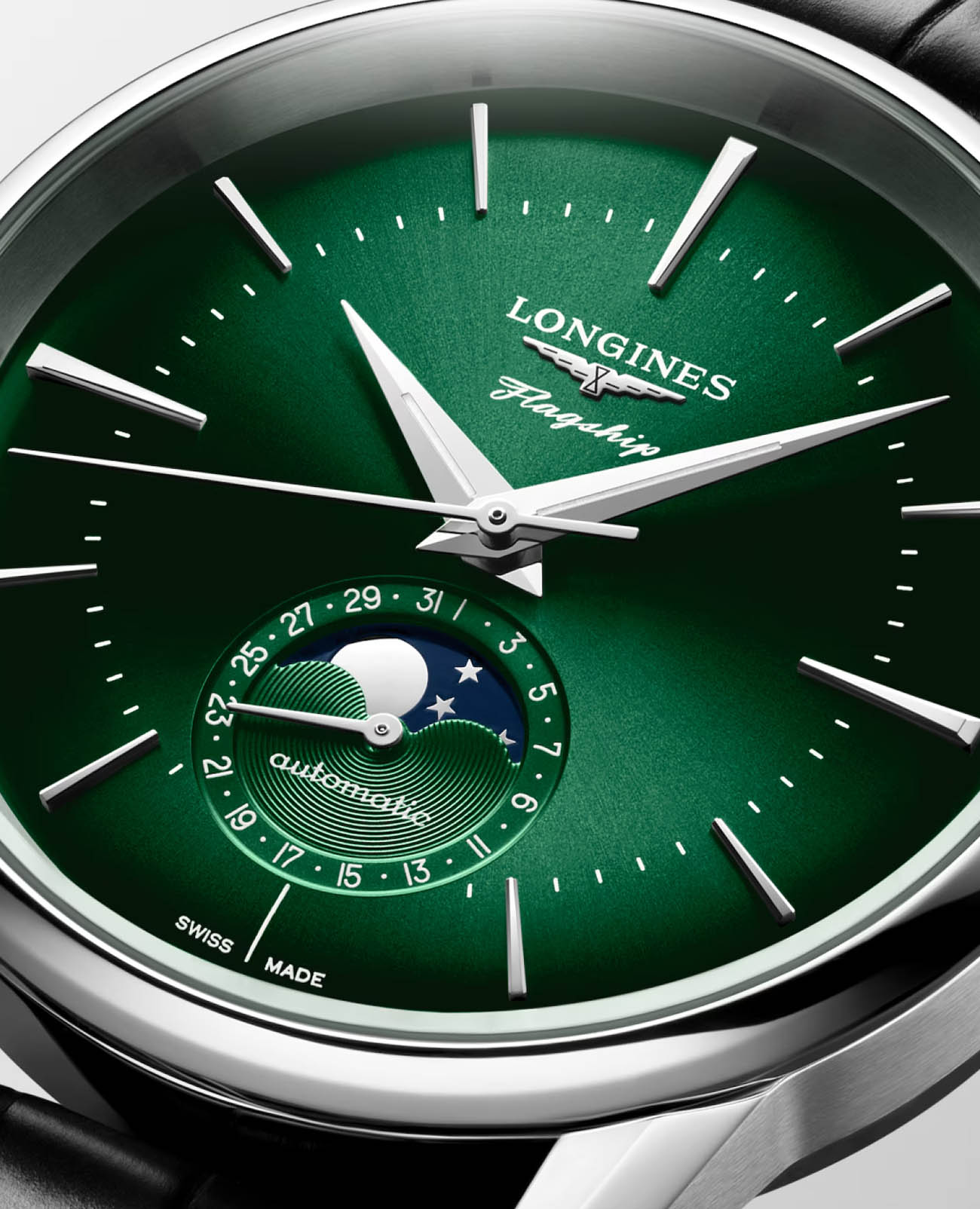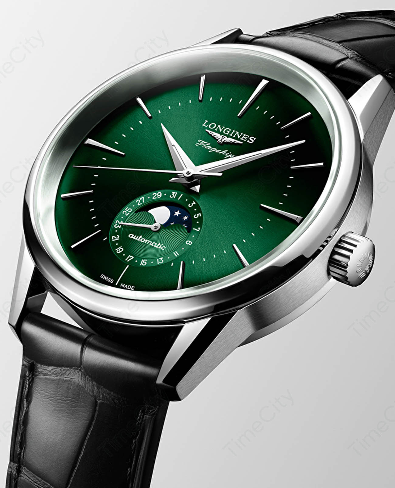 Мужские швейцарские механические часы с автоподзаводом Longines Flagship Heritage L4.815.4.02.2. Корпус часов изготовлен из нержавеющей стали. Сапфировое стеклоСапфировое стеклоПрочный и надёжный материал из кристалла сапфира синтетического происхождения, характеризующийся особой твёрдостью и устойчивостью к царапинам и повреждениям. повышенной прозрачности, устойчивое к мелким механическим повреждениям. Дата и индикатор фазы луны на дополнительном циферблате. Стрелки с люминесцентным покрытиемЛюминесцентное покрытиеПозволяет считывать показания времени в темноте. Производители наносят на стрелки, часовые индексы, безель или поверхность циферблата светонакопительный состав, дающий холодное свечение. Super-LumiNova. Класс водозащиты: 30 метров, позволит защитить корпус от случайных брызг или капель дождя. Ремешок из кожи аллигатора на стандартной застёжке.