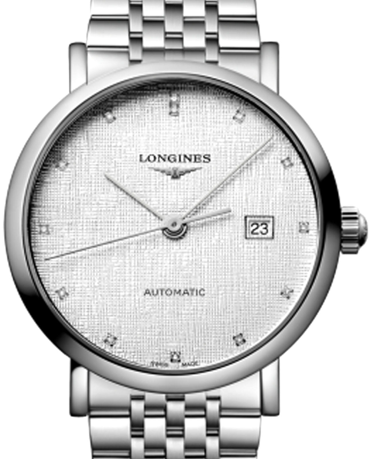 Изысканные мужские часы Longines Elegant Collection L4.910.4.79.6 — это воплощение спокойной роскоши и вечного стиля. Все элементы циферблата подчеркивают элегантность и классический вкус модели. Корпус часов изготовлен из нержавеющей стали, диаметром 39 мм. Защиту циферблата обеспечивает прочное сапфировое стеклоСапфировое стеклоПрочный и надёжный материал из кристалла сапфира синтетического происхождения, характеризующийся особой твёрдостью и устойчивостью к царапинам и повреждениям. с антибликовым покрытиемАнтибликовое покрытиеСлой оксида металла в 0,13-0,3 микрон, благодаря которому стекло часов не бликует и не отражает свет. Антибликовое покрытие уменьшает отражение света в 10 раз, обеспечивая отличную читаемость показателей циферблата. гарантирующее четкость показаний. Циферблат украшен 13 бриллиантами Top Wesselton VS-SI общим весом 0,032 карата. Автоматический механизм L888 обеспечивает высокую точность и простоту использования. Водостойкость до 30 метров позволит плавать, нырять и заниматься другими водными видами спорта. Изысканный браслет выполнен из нержавеющей стали на застёжке-бабочке с кнопкамиЗастёжка "бабочка"Такой вид застёжки дополняется предохранителями, помогающими избежать случайного раскрытия браслета. Обладают изящным исполнением. , обеспечивающей комфортное ношение и надёжную фиксацию на запястье. Окошко даты в положении 3 часа. Коллекция The Elegant Collection сочетает в себе классическую элегантность и современный подход к дизайну, делая эти часы универсальным аксессуаром — как для торжественных случаев, так и для повседневной жизни.