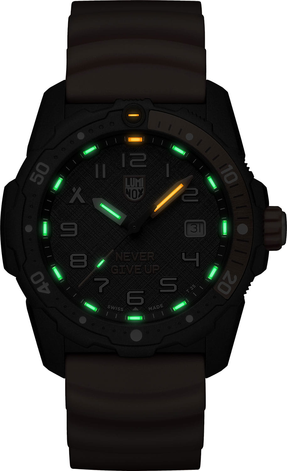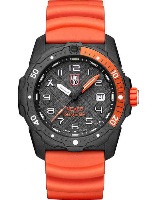 Luminox XB.3729.NGU — мужская модель из серии Survival Sea 3720, созданная для экстремальных условий с акцентом на надёжность и максимальную функциональность. Корпус диаметром 42 мм выполнен из прочного углеродного композита Carbon Core GuardCarbon Core Guard Новейшая структура корпуса, разработанная Casio. Полиуретановая пластина дополнительно усилена карбоновыми вставками, что придаёт специальную защиту от механических повреждений. Карбон отличается лёгкостью и прочностью., который сочетает лёгкость и устойчивость к ударам. Односторонний вращающийся безельБезельВнешний ободок, закрепляющий стекло. В спортивных часах так называется поворотное кольцо с делениями на циферблате, выполняет роль таймера – замеряет отрезки времени на шкале. Неподвижный безель – элемент декора. Однонаправленно вращающийся безель на дайверских часах позволяет фиксировать моменты погружения и выныривания на поверхность. с минутной шкалой позволяет точно контролировать время погружения. Защитную роль выполняет сапфировое стеклоСапфировое стеклоПрочный и надёжный материал из кристалла сапфира синтетического происхождения, характеризующийся особой твёрдостью и устойчивостью к царапинам и повреждениям. с антибликовым покрытиемАнтибликовое покрытиеСлой оксида металла в 0,13-0,3 микрон, благодаря которому стекло часов не бликует и не отражает свет. Антибликовое покрытие уменьшает отражение света в 10 раз, обеспечивая отличную читаемость показателей циферблата., обеспечивающим отличную читаемость под любым углом. В основе лежит швейцарский кварцевый механизм с индикацией часов, минут, секунд и даты. Водозащита 200 м (20 бар) соответствует стандартам дайверских часов. Стрелки и метки имеют люминесцентное покрытиеЛюминесцентное покрытиеПозволяет считывать показания времени в темноте. Производители наносят на стрелки, часовые индексы, безель или поверхность циферблата светонакопительный состав, дающий холодное свечение. и оснащены системой постоянной подсветки Luminox Light Technology, которая работает до 25 лет без подзарядки. Модель укомплектована полиуретановым ремешком яркого оттенка с классической застёжкой, что подчёркивает её спортивный и тактический характер. Лимитированная серия - 3720 экземпляров.