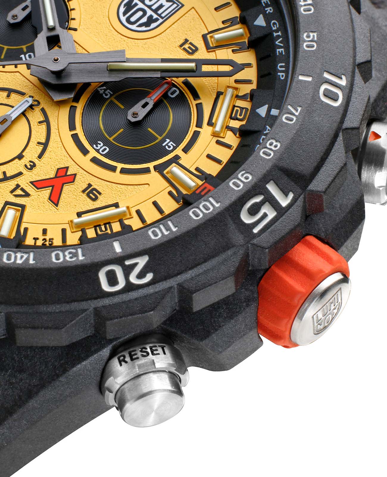 Мужские наручные часы-хронографХронографФункция позволяет измерять отрезки времени с особой точностью: часы, минуты, секунды. Верным признаком хронографа является наличие на циферблате 3 дополнительных окошек-счётчиков. Luminox Bear Grylls Survival Series XB.3745 разработаны для любителей активного образа жизни и экстремальных условий. Модель обладает круглым корпусом диаметром 45 мм, изготовленным из черного пластика, что обеспечивает исключительную прочность и легкость конструкции. Браслет выполнен из полиуретана черного цвета с текстурированной поверхностью, оснащен классической застежкой, гарантирующей комфортное ношение и безопасность. Циферблат украшен крупными индексами и стрелками с люминесцентным покрытиемЛюминесцентное покрытиеПозволяет считывать показания времени в темноте. Производители наносят на стрелки, часовые индексы, безель или поверхность циферблата светонакопительный состав, дающий холодное свечение., обеспечивающим отличную видимость в условиях недостаточной освещенности. Для защиты используется сапфировое стеклоСапфировое стеклоПрочный и надёжный материал из кристалла сапфира синтетического происхождения, характеризующийся особой твёрдостью и устойчивостью к царапинам и повреждениям. с антибликовым покрытиемАнтибликовое покрытиеСлой оксида металла в 0,13-0,3 микрон, благодаря которому стекло часов не бликует и не отражает свет. Антибликовое покрытие уменьшает отражение света в 10 раз, обеспечивая отличную читаемость показателей циферблата., которое не только защищает от царапин, но и обеспечивает четкое чтение времени при ярком свете. Часы работают на кварцевом механизме, который гарантирует точное время без необходимости подзаводки и имеет длительный срок службы батареи — около 3-4 лет. Модель также оснащена односторонним безелемБезельВнешний ободок, закрепляющий стекло. В спортивных часах так называется поворотное кольцо с делениями на циферблате, выполняет роль таймера – замеряет отрезки времени на шкале. Неподвижный безель – элемент декора. Однонаправленно вращающийся безель на дайверских часах позволяет фиксировать моменты погружения и выныривания на поверхность. с делениями для расчета времени погружения или выполнения других задач, а также функцией второго часового поясаВторой часовой поясФункция, позволяющая отображать время двух часовых поясов одновременно., что делает ее удобной для путешествий и международных перелетов. Водонепроницаемость часов достигает 300 метров (30 атмосфер), что позволяет использовать их во время плавания, дайвинга и других водных видов спорта. Luminox XB.3745 создан в сотрудничестве с Bear Grylls, сочетая в себе функциональность, надежность и стиль, необходимые для выживания в самых сложных условиях.