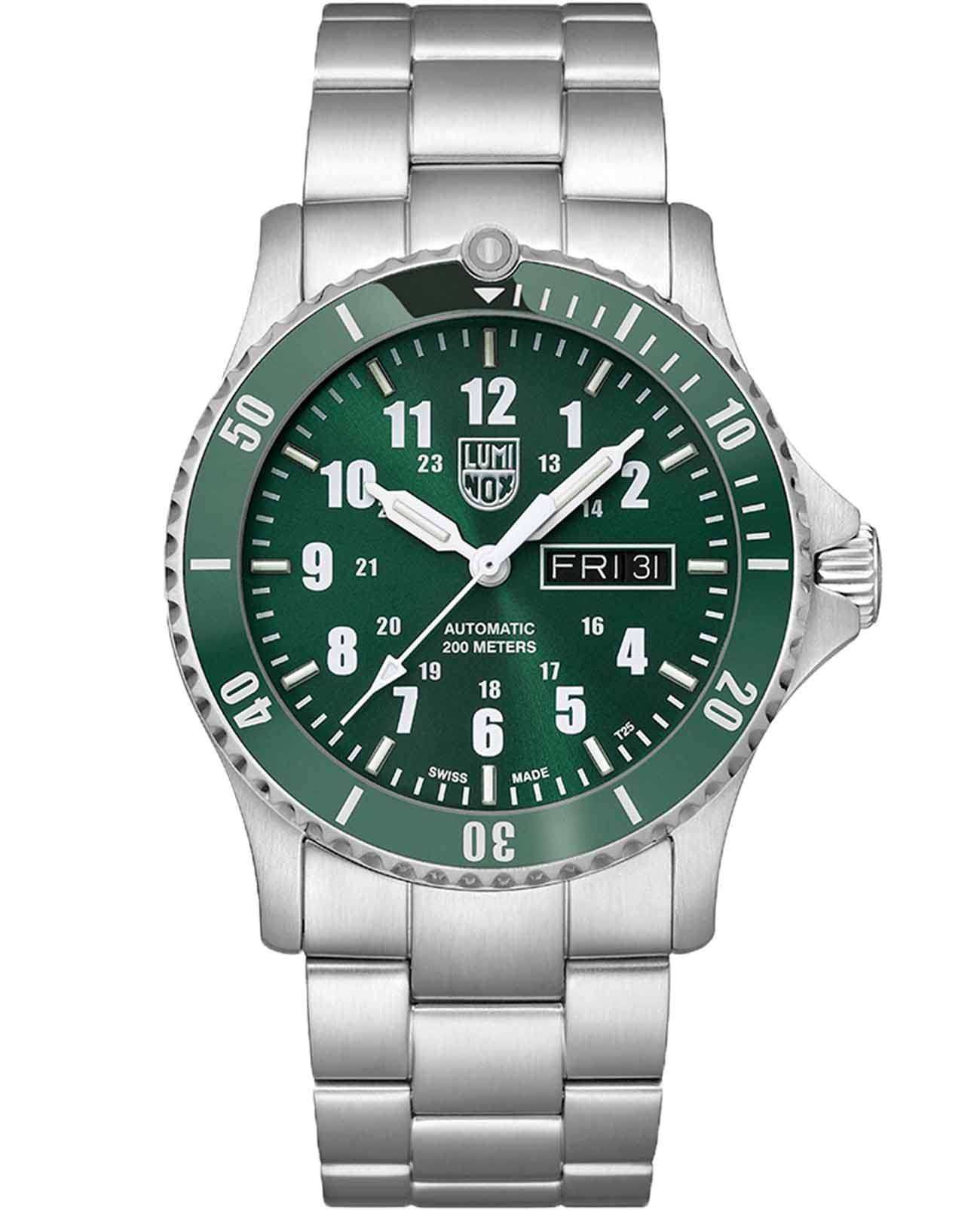 Часы Luminox XS.0937 — истинное воплощение швейцарского качества и современного стиля. Эти мужские часы, оснащённые механизмом с автоподзаводом, предлагают безупречную точность и надёжность, благодаря использованию калибра Sellita SW 220-1 с 26 камнями. Корпус выполнен из высококачественной стали 316L, что придаёт дополнительную прочность и устойчивость к износу. Зеленый циферблат защищён сапфировым стекломСапфировое стеклоПрочный и надёжный материал из кристалла сапфира синтетического происхождения, характеризующийся особой твёрдостью и устойчивостью к царапинам и повреждениям. с антибликовым покрытиемАнтибликовое покрытиеСлой оксида металла в 0,13-0,3 микрон, благодаря которому стекло часов не бликует и не отражает свет. Антибликовое покрытие уменьшает отражение света в 10 раз, обеспечивая отличную читаемость показателей циферблата., что позволяет с лёгкостью считывать показания даже при ярком освещении. Часы обладают функцией отображения даты и дня недели, расположенной в удобном окошке в позиции 3 часа. Вращающийся в одном направлении керамический безельБезельВнешний ободок, закрепляющий стекло. В спортивных часах так называется поворотное кольцо с делениями на циферблате, выполняет роль таймера – замеряет отрезки времени на шкале. Неподвижный безель – элемент декора. Однонаправленно вращающийся безель на дайверских часах позволяет фиксировать моменты погружения и выныривания на поверхность. обеспечивает дополнительную функциональность и стильный вид. Благодаря технологии LLTLLTLLT — это автономный механизм подсветки, основанный на использовании микроскопических газонаполненных элементов. Специальные герметичные капсулы из боросиликатного стекла, интегрированные в циферблат, генерируют свечение без необходимости подключения к внешним источникам энергии. Для их работы не требуется ни дополнительный свет, ни механическое воздействие (например, нажатие кнопки). Свечение возникает благодаря химическому процессу: реакция между тритием, заключенным в капсулах, и люминофорным покрытием создает стабильное автономное освещение. Технология обеспечивает энергетическую независимость и долговечность подсветки.-подсветки, эти часы гарантируют превосходную видимость в темноте на протяжении 25 лет. Завинчивающаяся заводная головка с защитой и прозрачная задняя крышка подчёркивают внимание к деталям и практичность дизайна. Стальной браслет, изготовленный из того же материала, что и корпус, оснащён раскладной застёжкойРаскладная застёжкаТакой тип застёжки используется только на браслетах из металла. Она никогда не раскрывается полностью, происходит разделение на 2 и более частей. Раскладывающая застёжка снизит вероятность потери часов к минимуму. с системой блокировки, обеспечивая надёжную фиксацию на запястье. Водозащита уровня 200WR позволяет использовать часы даже в условиях повышенной влажности. Габаритные размеры составляют 42 мм в диаметре, 13 мм в толщину, с шириной браслета 24 мм и весом 185 г, что делает их идеальным выбором для тех, кто ценит стиль и функциональность в одном аксессуаре.