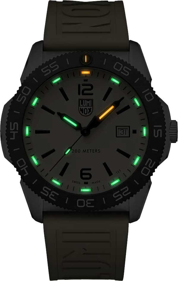 Мужские швейцарские наручные часы Luminox Pacific Diver XS.3125 — это идеальное сочетание стиля, точности и надежности, созданное для активных искателей приключений. Оснащенные высокоточным кварцевым механизмом, эти часы обеспечивают безупречное времяизмерение, что делает их незаменимыми в повседневной жизни. Циферблат этих часов защищен с помощью сапфирового стеклаСапфировое стеклоПрочный и надёжный материал из кристалла сапфира синтетического происхождения, характеризующийся особой твёрдостью и устойчивостью к царапинам и повреждениям. с антибликовым покрытиемАнтибликовое покрытиеСлой оксида металла в 0,13-0,3 микрон, благодаря которому стекло часов не бликует и не отражает свет. Антибликовое покрытие уменьшает отражение света в 10 раз, обеспечивая отличную читаемость показателей циферблата., которое славится своей устойчивостью к царапинам и внешним воздействиям, сохраняя при этом идеальный вид даже при интенсивном использовании. Корпус часов выполнен из стали, который придает часам современный и стильный вид. Стрелки часов, выполненные с LLTLLTLLT — это автономный механизм подсветки, основанный на использовании микроскопических газонаполненных элементов. Специальные герметичные капсулы из боросиликатного стекла, интегрированные в циферблат, генерируют свечение без необходимости подключения к внешним источникам энергии. Для их работы не требуется ни дополнительный свет, ни механическое воздействие (например, нажатие кнопки). Свечение возникает благодаря химическому процессу: реакция между тритием, заключенным в капсулах, и люминофорным покрытием создает стабильное автономное освещение. Технология обеспечивает энергетическую независимость и долговечность подсветки.-подсветкой, обеспечивают отличную читаемость в условиях низкой освещенности, позволяя вам без труда проверять время даже в темноте. Практичное окошко даты, расположенное в положении 3 часа, добавляет удобство в повседневной эксплуатации. С классом водозащиты в 200 метров, эти часы идеально подходят для любителей водных видов спорта. Они позволяют плавать, нырять и заниматься разнообразными активностями, не переживая о их безопасности. Каучуковый ремешок на раскладной застёжкеРаскладная застёжкаТакой тип застёжки используется только на браслетах из металла. Она никогда не раскрывается полностью, происходит разделение на 2 и более частей. Раскладывающая застёжка снизит вероятность потери часов к минимуму. обеспечивает комфортную и надежную посадку на запястье, добавляя нотку современности и легкости в ношении. Элегантный вращающийся безельБезельВнешний ободок, закрепляющий стекло. В спортивных часах так называется поворотное кольцо с делениями на циферблате, выполняет роль таймера – замеряет отрезки времени на шкале. Неподвижный безель – элемент декора. Однонаправленно вращающийся безель на дайверских часах позволяет фиксировать моменты погружения и выныривания на поверхность. из карбонаКарбонОт «carbon», «carbone» - углерод, углепластик - полимерный композиционный материал из переплетённых под определенным углом между собой нитей углеродного волокна, применяется для изготовления лёгких, но прочных деталей. В часах часто используют для украшения циферблатов и ремешков. Так же карбон используется в изготовлении корпусов. Такие корпуса облад
