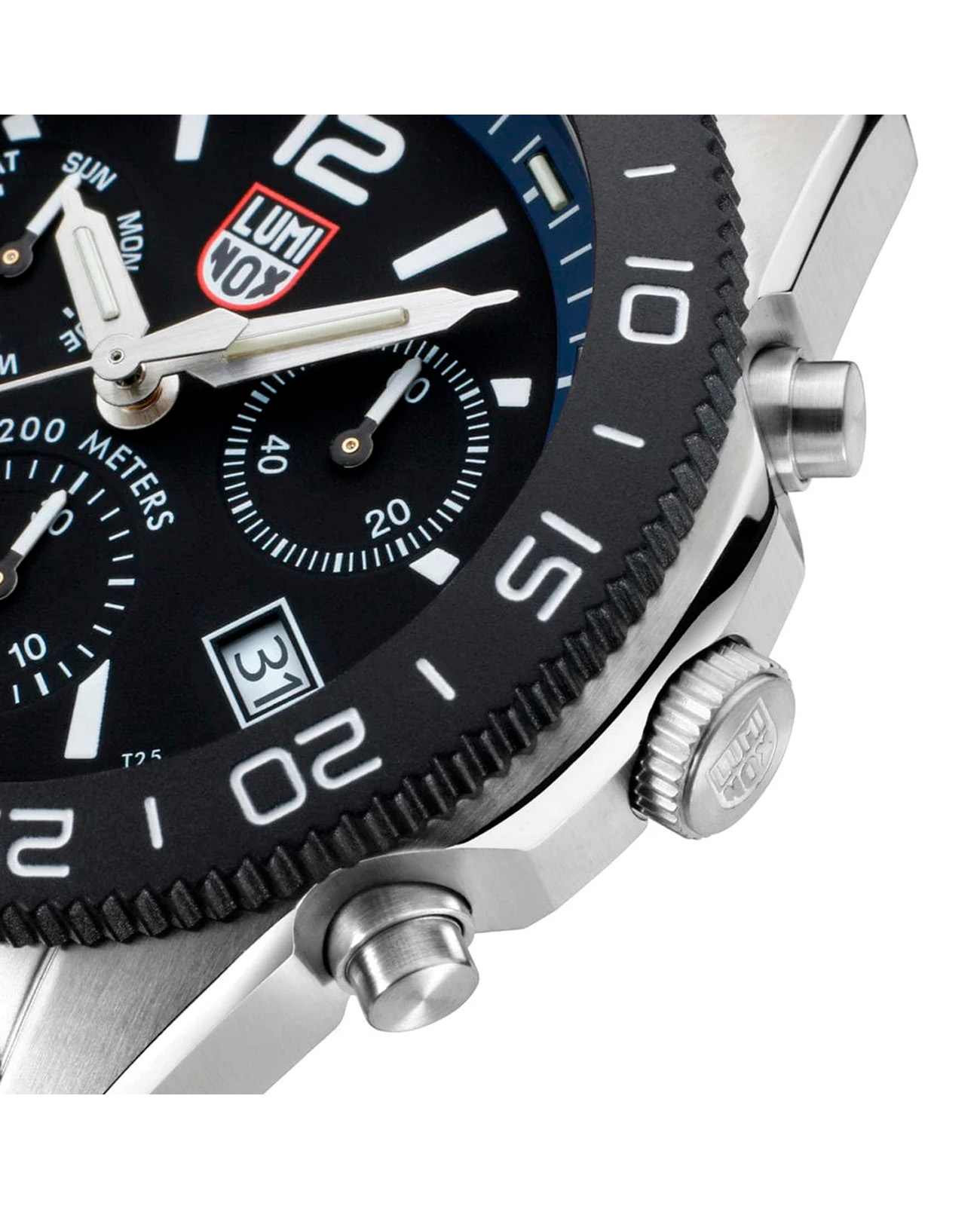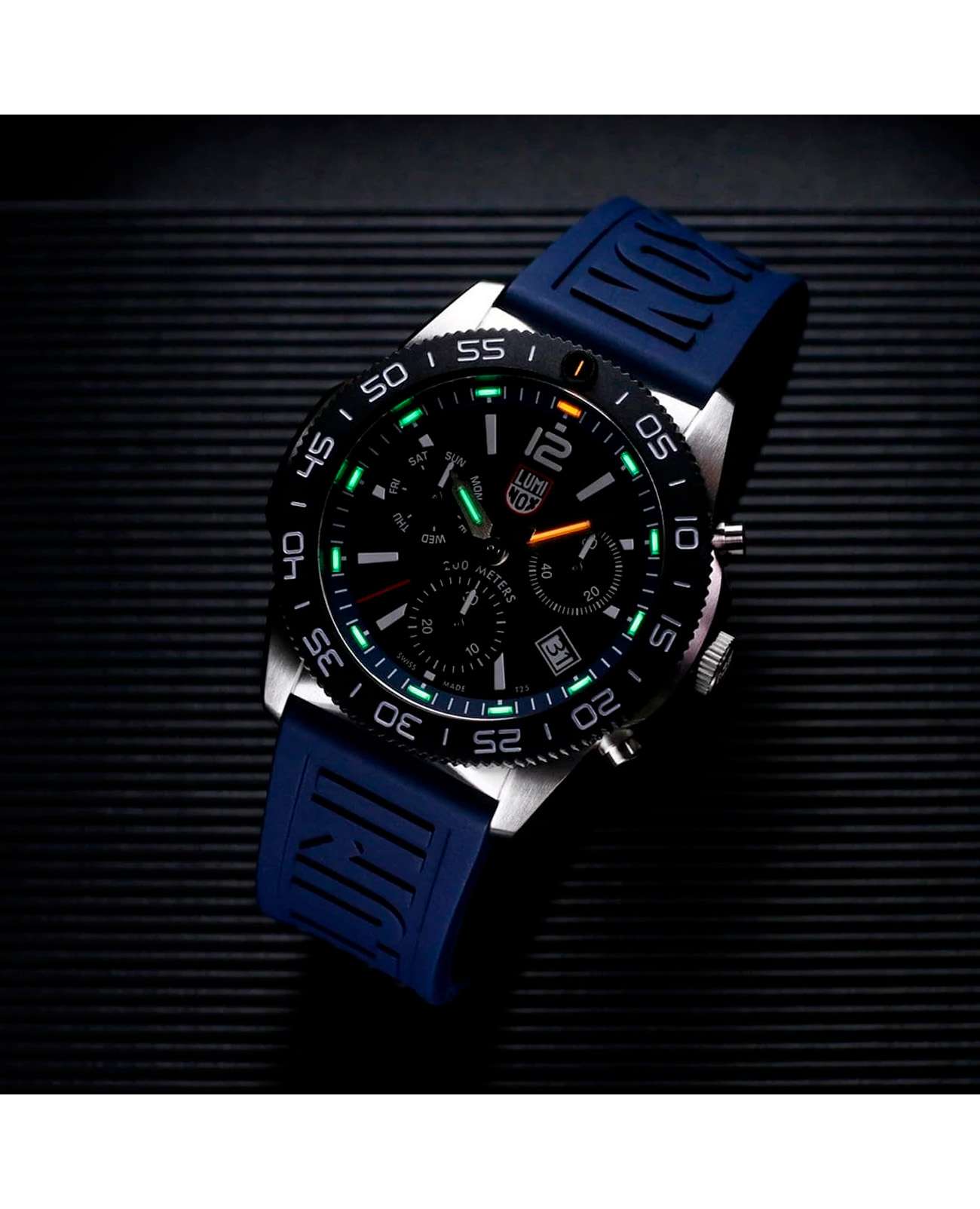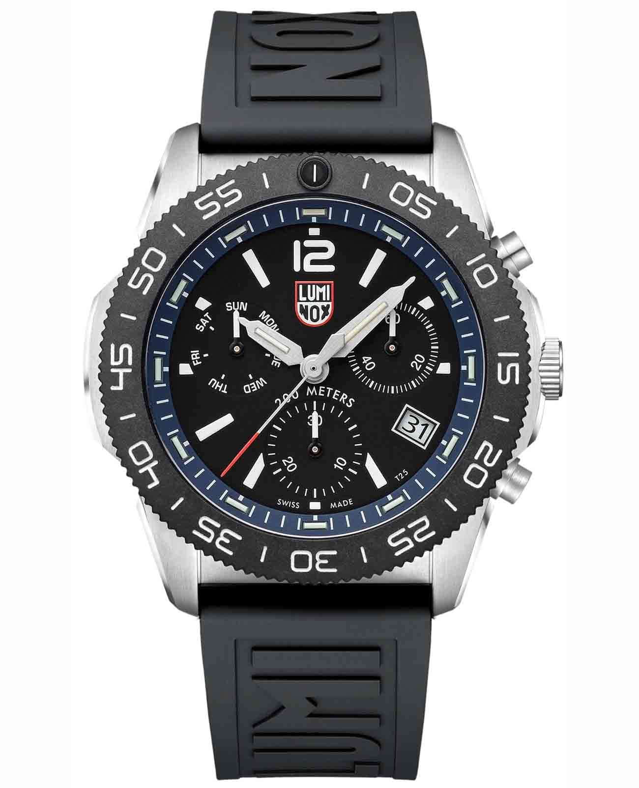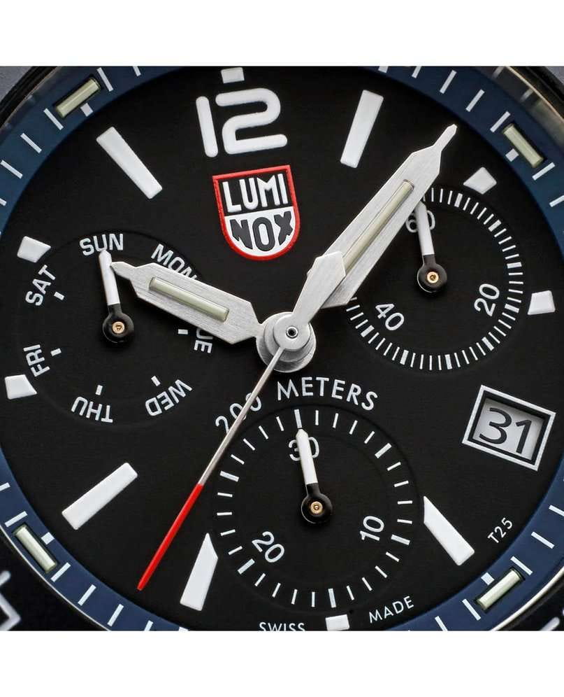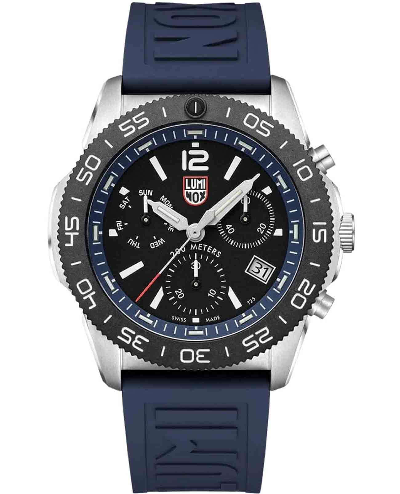 Мужские наручные часы-хронографХронографФункция позволяет измерять отрезки времени с особой точностью: часы, минуты, секунды. Верным признаком хронографа является наличие на циферблате 3 дополнительных окошек-счётчиков. Luminox XS.3143.SET из коллекции Pacific Diver сочетают в себе спортивный дизайн и надежность швейцарского качества . Модель обладает круглым корпусом диаметром 44 мм, изготовленным из нержавеющей стали, что обеспечивает высокую устойчивость к внешним воздействиям и долговечность . Циферблат черного цвета украшен контрастными метками и стрелками с люминесцентным покрытиемЛюминесцентное покрытиеПозволяет считывать показания времени в темноте. Производители наносят на стрелки, часовые индексы, безель или поверхность циферблата светонакопительный состав, дающий холодное свечение., гарантирующим постоянную видимость времени даже в условиях низкой освещенности благодаря системе LLTLLTLLT — это автономный механизм подсветки, основанный на использовании микроскопических газонаполненных элементов. Специальные герметичные капсулы из боросиликатного стекла, интегрированные в циферблат, генерируют свечение без необходимости подключения к внешним источникам энергии. Для их работы не требуется ни дополнительный свет, ни механическое воздействие (например, нажатие кнопки). Свечение возникает благодаря химическому процессу: реакция между тритием, заключенным в капсулах, и люминофорным покрытием создает стабильное автономное освещение. Технология обеспечивает энергетическую независимость и долговечность подсветки. (микрогазовые огни) . Часы оснащены кварцевым механизмом швейцарского производства Ronda 515, обеспечивающим точность хода ±15 секунд в месяц . Защиту циферблата обеспечивает прочное сапфировое стеклоСапфировое стеклоПрочный и надёжный материал из кристалла сапфира синтетического происхождения, характеризующийся особой твёрдостью и устойчивостью к царапинам и повреждениям. с антибликовым покрытиемАнтибликовое покрытиеСлой оксида металла в 0,13-0,3 микрон, благодаря которому стекло часов не бликует и не отражает свет. Антибликовое покрытие уменьшает отражение света в 10 раз, обеспечивая отличную читаемость показателей циферблата., устойчивое к царапинам и механическим повреждениям . Водонепроницаемость модели достигает 20 атмосфер (200 метров), что делает их подходящими для плавания и активного отдыха на воде, включая дайвинг . Модель также оснащена безелемБезельВнешний ободок, закрепляющий стекло. В спортивных часах так называется поворотное кольцо с делениями на циферблате, выполняет роль таймера – замеряет отрезки времени на шкале. Неподвижный безель – элемент декора. Однонаправленно вращающийся безель на дайверских часах позволяет фиксировать моменты погружения и выныривания на поверхность. с односторонним вращением, что добавляет функциональности при использовании в водных условиях . Ремешок выполнен из каучука, что обеспечивает комфортное ношение в течение дня и удобство в уходе . Дополнительно часы имеют окно даты в положении «3 часа», что делает их практичными для повседневного использования . Сочетание современных технологий, надежности и стильного дизайна делает Luminox XS.3143.SET идеальным выбором для ценителей качественных аксессуаров. В комплекте идет дополнительный черный каучуковый р