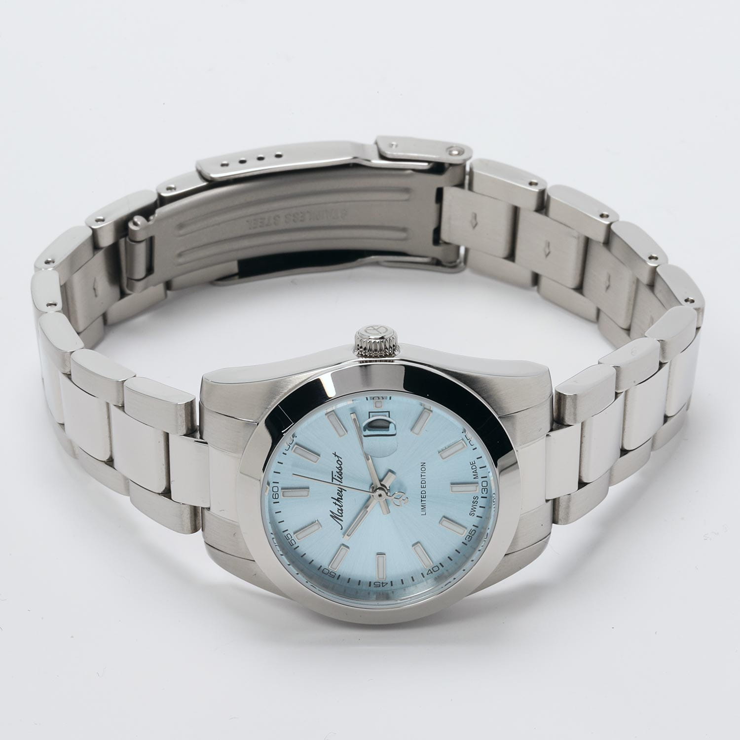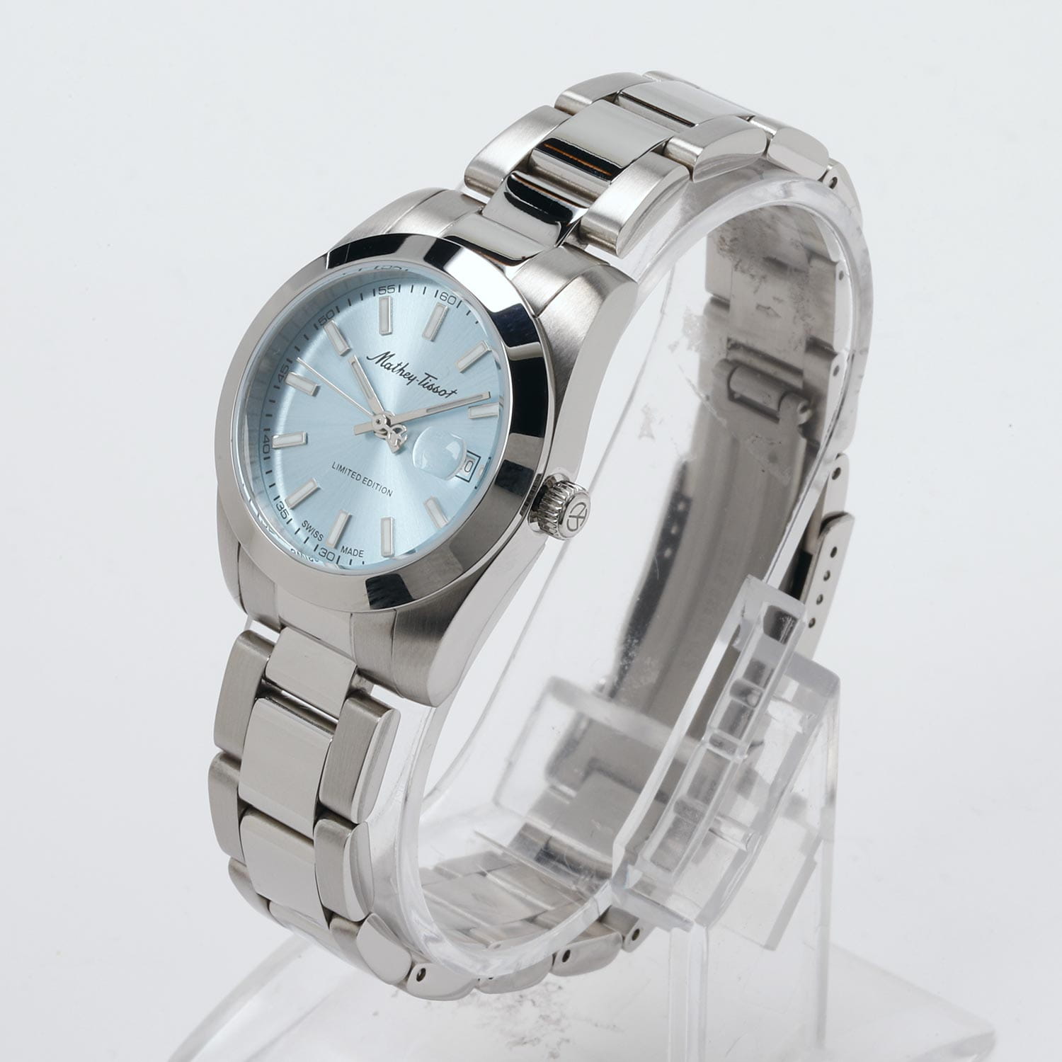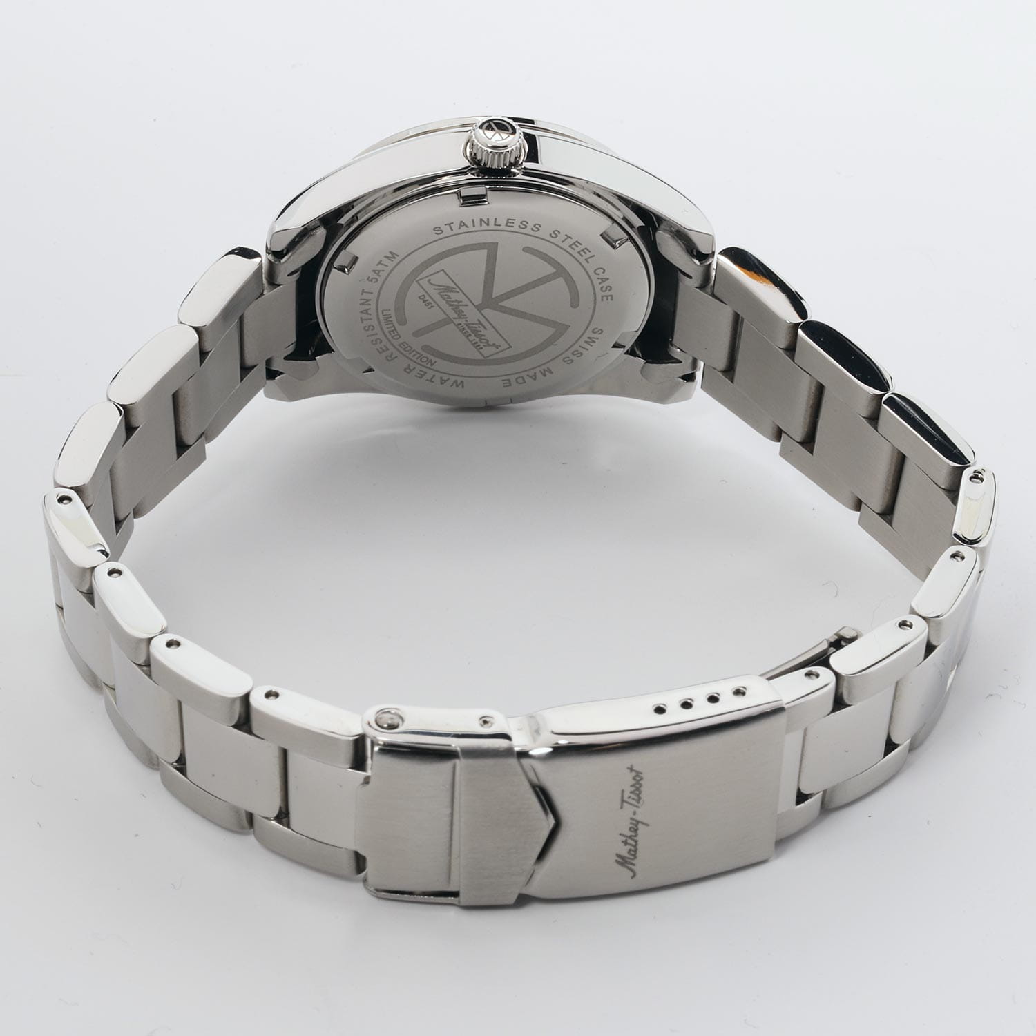 Женские кварцевые часы Mathey-Tissot Mathy D451BU — это стильное сочетание элегантности и современного дизайна. Лимитированная серия. Изящный корпус выполнен из нержавеющей стали, диаметром 32 мм, что придаст образу женственности и романтизма. Изысканный циферблат с метками в виде штрихов придает модели особый блеск. Циферблат защищен минеральным стекломМинеральное стеклоМинеральное стекло представляет собой искусственно выращенный минерал кварца. Такое стекло отличается особой устойчивостью к повреждениям и царапинам. Уступает по некоторым качествам сапфировому стеклу., обеспечивающий устойчивость к царапинам. Стрелки и метки с люминесцентным покрытиемЛюминесцентное покрытиеПозволяет считывать показания времени в темноте. Производители наносят на стрелки, часовые индексы, безель или поверхность циферблата светонакопительный состав, дающий холодное свечение.. Окошко даты находится в положении 3 часа. Часы оснащены надежным кварцевым механизмом. Стальной браслет на раскладной застёжке с фиксаторомРаскладная застёжкаТакой тип застёжки используется только на браслетах из металла. Она никогда не раскрывается полностью, происходит разделение на 2 и более частей. Раскладывающая застёжка снизит вероятность потери часов к минимуму., гарантирует комфортное и безопасное ношение. Класс водозащиты: 50 метров позволит защитить корпус от случайных брызг или капель дождя. Mathey-Tissot  — отличный выбор для тех, кто ценит утонченность и качество.