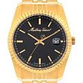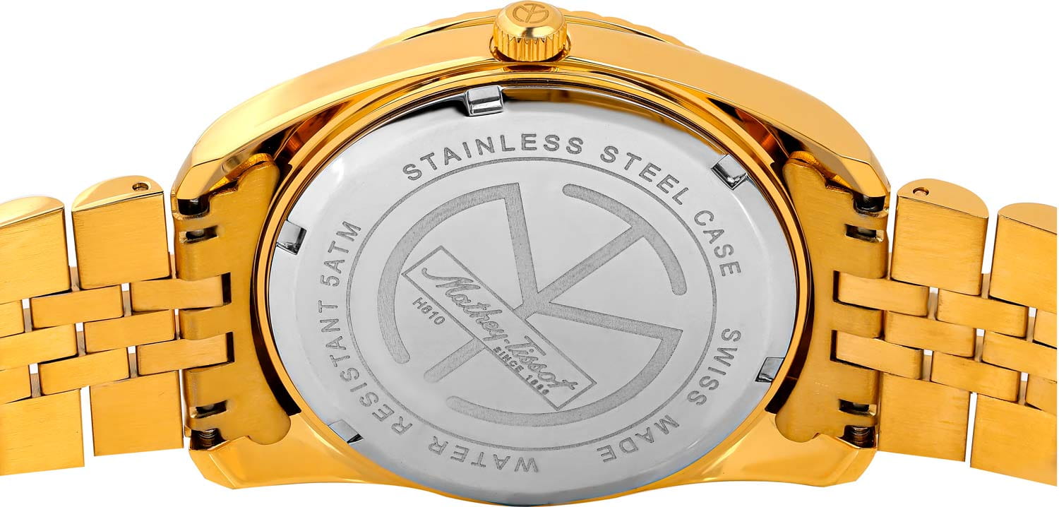 Мужские кварцевые часы Mathey-Tissot Rolly H810PN — это стильное сочетание элегантности и современного дизайна. Изящный корпус выполнен из нержавеющей стали с PVD-покрытиемPVDУльтратонкое покрытие наносится в технике вакуумного напыления, сочетает в себе нитрид титана особой прочности со слоем золота или оксида хрома. Несёт в себе декоративную или защитную функцию. золотистого цвета, диаметром 40 мм, что придаст образу элегантности и надежности. Изысканный циферблат с метками в виде штрихов придает модели особый блеск. Циферблат защищен минеральным стекломМинеральное стеклоМинеральное стекло представляет собой искусственно выращенный минерал кварца. Такое стекло отличается особой устойчивостью к повреждениям и царапинам. Уступает по некоторым качествам сапфировому стеклу., обеспечивающий устойчивость к царапинам. Стрелки и метки с люминесцентным покрытиемЛюминесцентное покрытиеПозволяет считывать показания времени в темноте. Производители наносят на стрелки, часовые индексы, безель или поверхность циферблата светонакопительный состав, дающий холодное свечение.. Окошко даты находится в положении 3 часа. Часы оснащены надежным кварцевым механизмом. Стальной браслет с PVD-покрытиемPVDУльтратонкое покрытие наносится в технике вакуумного напыления, сочетает в себе нитрид титана особой прочности со слоем золота или оксида хрома. Несёт в себе декоративную или защитную функцию. на раскладной застёжкеРаскладная застёжкаТакой тип застёжки используется только на браслетах из металла. Она никогда не раскрывается полностью, происходит разделение на 2 и более частей. Раскладывающая застёжка снизит вероятность потери часов к минимуму., гарантирует комфортное и безопасное ношение. Класс водозащиты: 50 метров позволит защитить корпус от случайных брызг или капель дождя. Mathey-Tissot  — отличный выбор для тех, кто ценит утонченность и качество.
