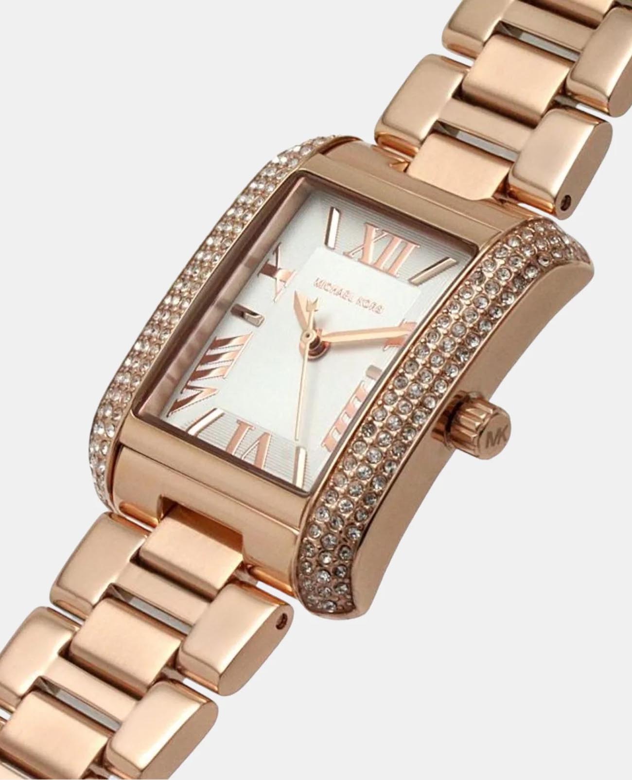 Женские американские наручные часы с минеральным стекломМинеральное стеклоМинеральное стекло представляет собой искусственно выращенный минерал кварца. Такое стекло отличается особой устойчивостью к повреждениям и царапинам. Уступает по некоторым качествам сапфировому стеклу. Michael Kors Emery MK4641, кварцевый механизм с высокой точностью. Минеральное стеклоМинеральное стеклоМинеральное стекло представляет собой искусственно выращенный минерал кварца. Такое стекло отличается особой устойчивостью к повреждениям и царапинам. Уступает по некоторым качествам сапфировому стеклу. устойчивое к появлению царапин, обладающее высокой прозрачностью. Корпус и браслет часов изготовлены из нержавеющей стали с PVD-покрытиемPVDУльтратонкое покрытие наносится в технике вакуумного напыления, сочетает в себе нитрид титана особой прочности со слоем золота или оксида хрома. Несёт в себе декоративную или защитную функцию.. БезельБезельВнешний ободок, закрепляющий стекло. В спортивных часах так называется поворотное кольцо с делениями на циферблате, выполняет роль таймера – замеряет отрезки времени на шкале. Неподвижный безель – элемент декора. Однонаправленно вращающийся безель на дайверских часах позволяет фиксировать моменты погружения и выныривания на поверхность. из нержавеющей стали украшен кристаллами. Класс водозащиты: 50 метров, позволит защитить корпус от случайных брызг или капель дождя. Стальной браслет на раскладной застёжкеРаскладная застёжкаТакой тип застёжки используется только на браслетах из металла. Она никогда не раскрывается полностью, происходит разделение на 2 и более частей. Раскладывающая застёжка снизит вероятность потери часов к минимуму..
