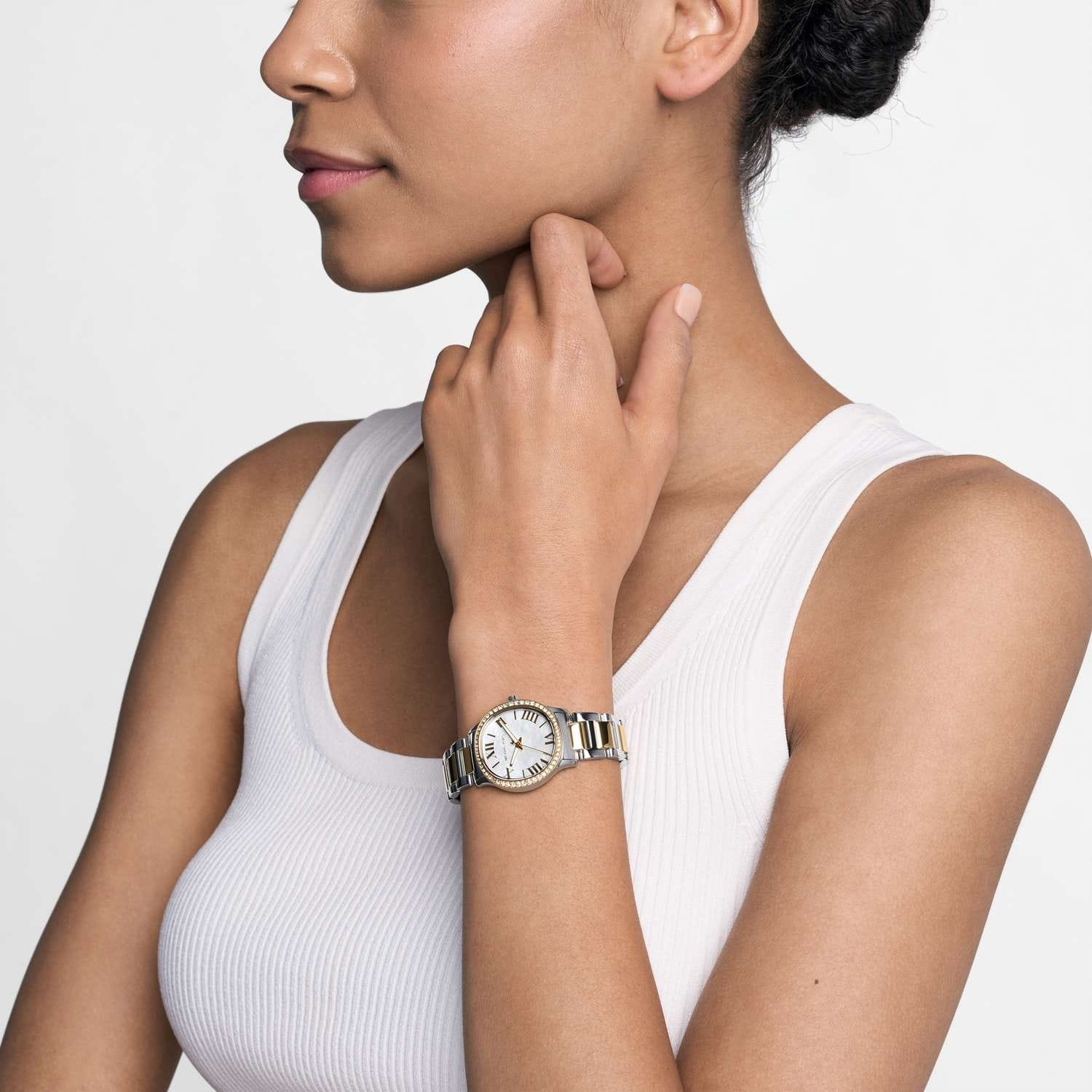 Женские американские часы Michael Kors SAGE MK4910 имеют кварцевый механизм с высокой точностью. Корпус часов изготовлен из нержавеющей стали серебристого цвета, диаметром 31 мм. Циферблат с метками в виде римских цифр защищен минеральным стекломМинеральное стеклоМинеральное стекло представляет собой искусственно выращенный минерал кварца. Такое стекло отличается особой устойчивостью к повреждениям и царапинам. Уступает по некоторым качествам сапфировому стеклу., что обеспечивает надежную защиту от царапин и повреждений. Неподвижный безельБезельВнешний ободок, закрепляющий стекло. В спортивных часах так называется поворотное кольцо с делениями на циферблате, выполняет роль таймера – замеряет отрезки времени на шкале. Неподвижный безель – элемент декора. Однонаправленно вращающийся безель на дайверских часах позволяет фиксировать моменты погружения и выныривания на поверхность. с PVD-покрытиемPVDУльтратонкое покрытие наносится в технике вакуумного напыления, сочетает в себе нитрид титана особой прочности со слоем золота или оксида хрома. Несёт в себе декоративную или защитную функцию. украшен кристаллами. Класс водозащиты: 50 метров позволит защитить корпус от случайных брызг или капель дождя. Стрелки с люминесцентным покрытиемЛюминесцентное покрытиеПозволяет считывать показания времени в темноте. Производители наносят на стрелки, часовые индексы, безель или поверхность циферблата светонакопительный состав, дающий холодное свечение.. Стальной браслет с частичным PVD-покрытиемPVDУльтратонкое покрытие наносится в технике вакуумного напыления, сочетает в себе нитрид титана особой прочности со слоем золота или оксида хрома. Несёт в себе декоративную или защитную функцию. на раскладной застёжкеРаскладная застёжкаТакой тип застёжки используется только на браслетах из металла. Она никогда не раскрывается полностью, происходит разделение на 2 и более частей. Раскладывающая застёжка снизит вероятность потери часов к минимуму. обеспечивает надежную фиксацию на запястье и легкость в надевании и снятии. Эти часы станут отличным дополнением к любому наряду, подчеркивая индивидуальность и стиль их обладательницы. Идеальный аксессуар, который придаст женскому образу завершенность и особый шарм.