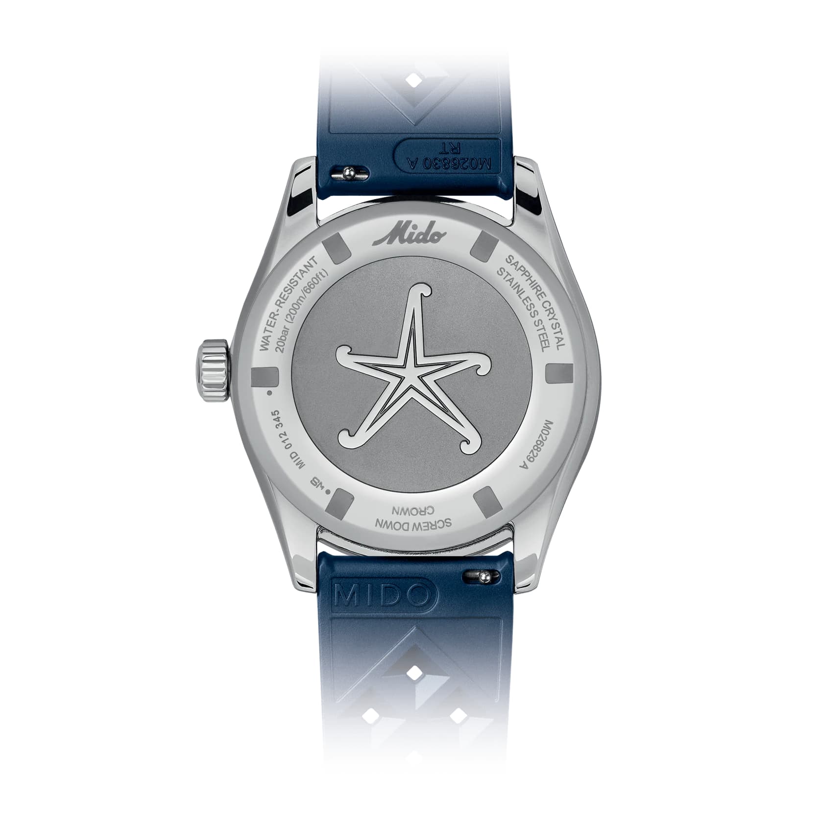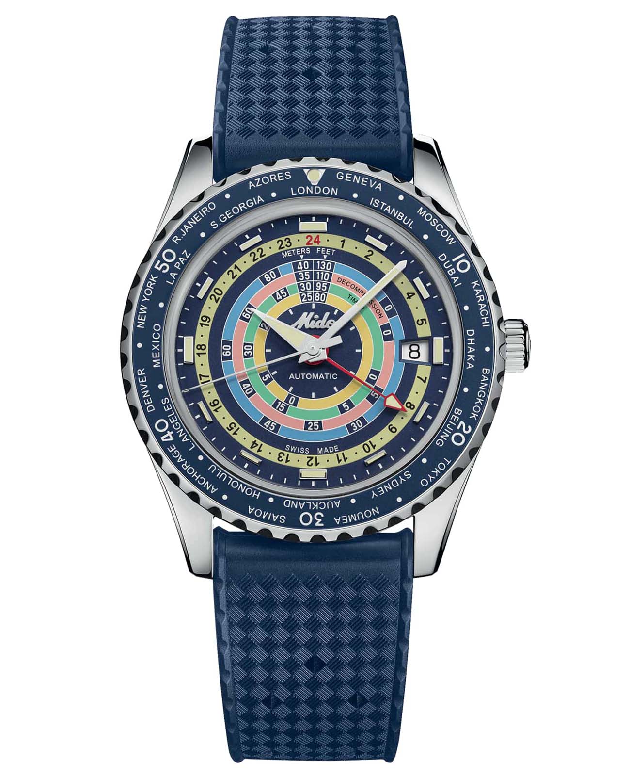 Часы MIDO Ocean Star Decompression Worldtimer (артикул M026.829.17.041.00) сочетают в себе винтажный дизайн и современные технологии, вдохновлённые оригинальной моделью 1960-х годов. Корпус диаметром 40,5 мм выполнен из нержавеющей стали с водозащитой до 20 бар (200 метров). Завинчивающаяся заводная головка и многоцветный циферблат с декомпрессионными шкалами, накладными часовыми метками, покрытыми Super-LumiNova®Люминесцентное покрытиеПозволяет считывать показания времени в темноте. Производители наносят на стрелки, часовые индексы, безель или поверхность циферблата светонакопительный состав, дающий холодное свечение., защищён сапфировым стекломСапфировое стеклоПрочный и надёжный материал из кристалла сапфира синтетического происхождения, характеризующийся особой твёрдостью и устойчивостью к царапинам и повреждениям. с антибликовым покрытием.