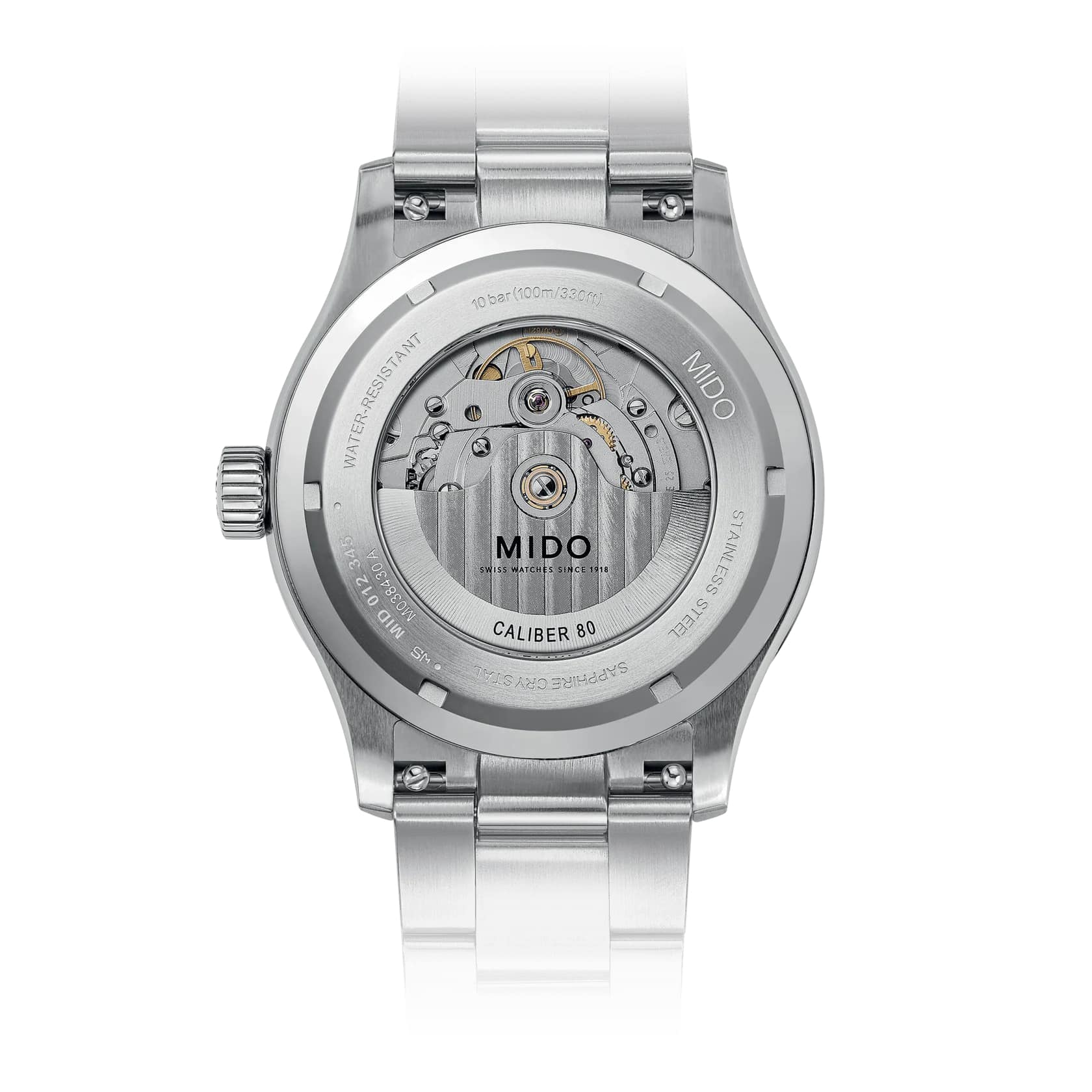 Вертикальная атласная отделка градиентного циферблата Multifort M напоминает о характерных чертах коллекции Côtes de Genève. Безупречное люминесцентное покрытиеЛюминесцентное покрытиеПозволяет считывать показания времени в темноте. Производители наносят на стрелки, часовые индексы, безель или поверхность циферблата светонакопительный состав, дающий холодное свечение. Super-LumiNova® создает контраст и читаемость на стрелках и круглых указателях. Легендарная надежность Multifort соответствует ритму знаменитого калибра 80. Запас хода до 80 часов обеспечивается Nivachron™Nivachron™Специально разработанный инновационный сплав Nivachron™ повышает устойчивость часов к воздействию магнитных полей. – революционного материала, обеспечивающего потрясающую точность. Mido предлагает Multifort M с системой смены ремня без инструментов, в стальном или текстильном исполнении на резиновой основе.