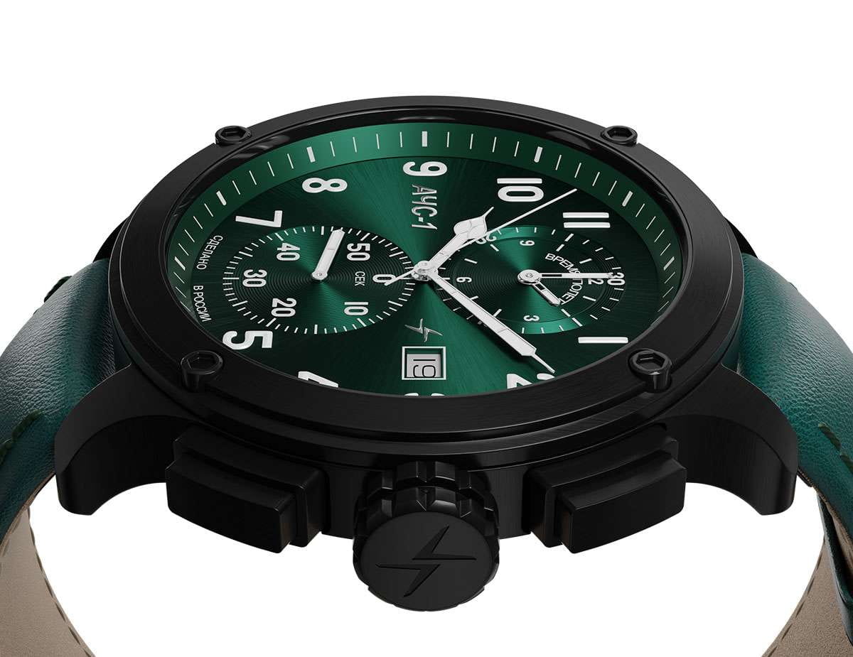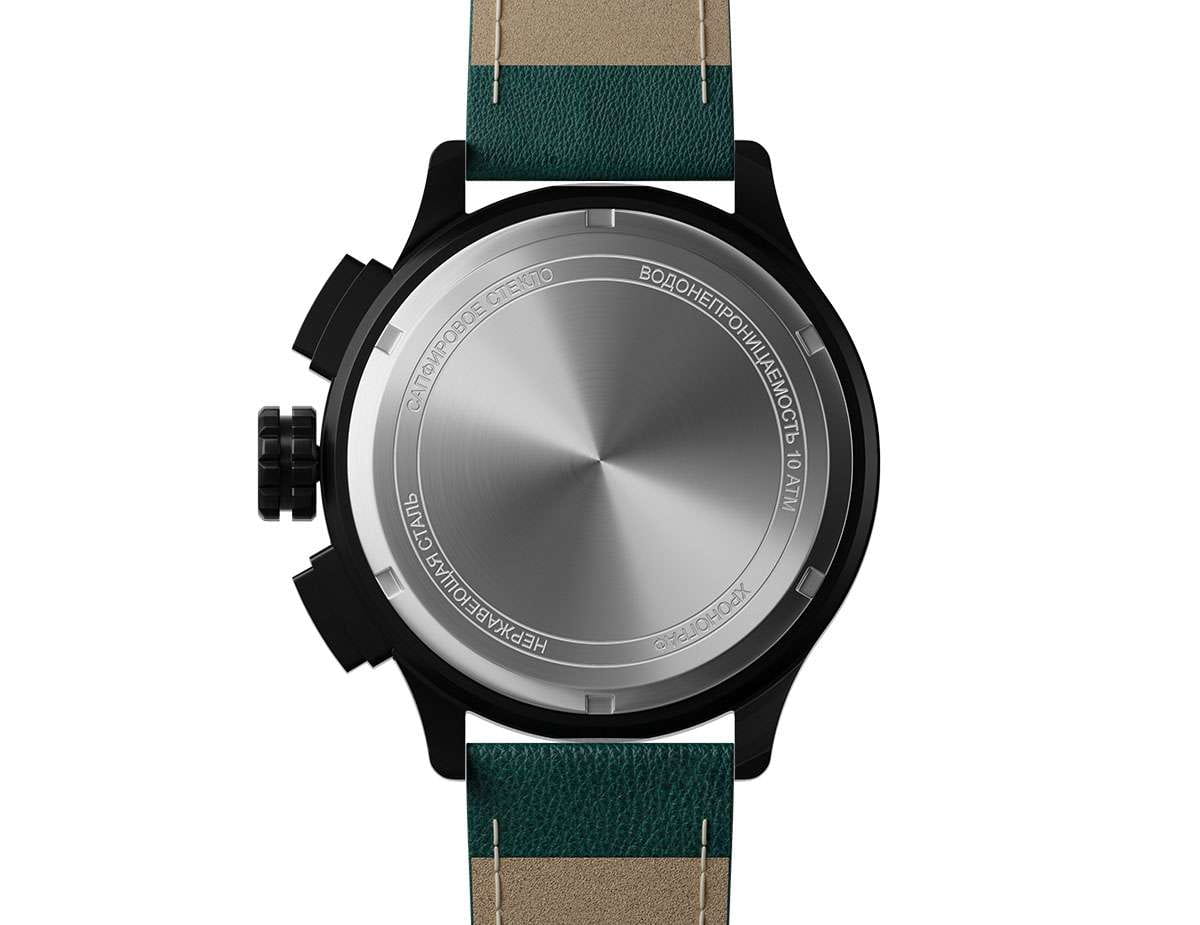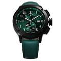 Мужские кварцевые часы — это стильный и функциональный аксессуар с хронографом. Корпус диаметром 44 мм выполнен из нержавеющей стали 316L с IP-покрытиемIP-покрытиеМетод ионного напыления. Демонстрирует повышенную устойчивость к истиранию, окислению и химическим веществам. Под воздействием высокого давления и температуры около 1500°C молекулы металла надёжно соединяются с частицами корпуса часов., включая безельБезельВнешний ободок, закрепляющий стекло. В спортивных часах так называется поворотное кольцо с делениями на циферблате, выполняет роль таймера – замеряет отрезки времени на шкале. Неподвижный безель – элемент декора. Однонаправленно вращающийся безель на дайверских часах позволяет фиксировать моменты погружения и выныривания на поверхность., кнопки и заводную головку. Циферблат зелёного цвета оформлен индексами и стрелками. Стрелки и метки с люминесцентным покрытиемЛюминесцентное покрытиеПозволяет считывать показания времени в темноте. Производители наносят на стрелки, часовые индексы, безель или поверхность циферблата светонакопительный состав, дающий холодное свечение. Super-LumiNova, обеспечивающим хорошую читаемость в темноте. Циферблат защищён сапфировым стекломСапфировое стеклоПрочный и надёжный материал из кристалла сапфира синтетического происхождения, характеризующийся особой твёрдостью и устойчивостью к царапинам и повреждениям.. Механизм — швейцарский кварцевый калибр Ronda 3520.D с функциями хронографаХронографФункция позволяет измерять отрезки времени с особой точностью: часы, минуты, секунды. Верным признаком хронографа является наличие на циферблате 3 дополнительных окошек-счётчиков. и секундомераСекундомерСекундоме́р — прибор, способный измерять интервалы времени с точностью до долей секунды.. Часы оснащены кожаным ремешком зелёного цвета с классической пряжкой. Водонепроницаемость 100 м позволяет использовать часы для плавания и повседневного ношения. Идеальный выбор для тех, кто ценит точность, качество и выразительный дизайн.