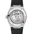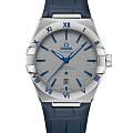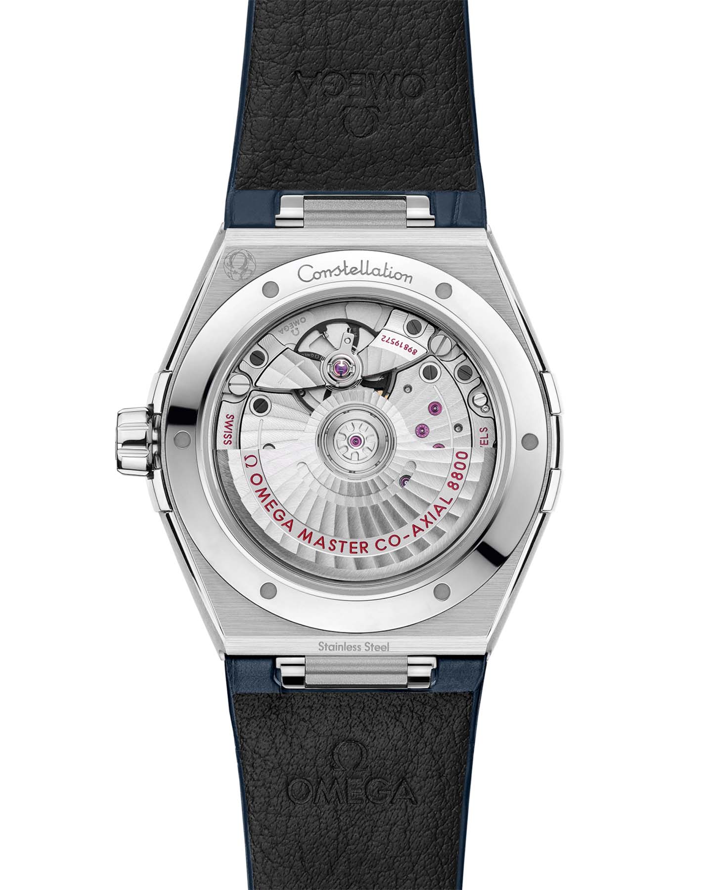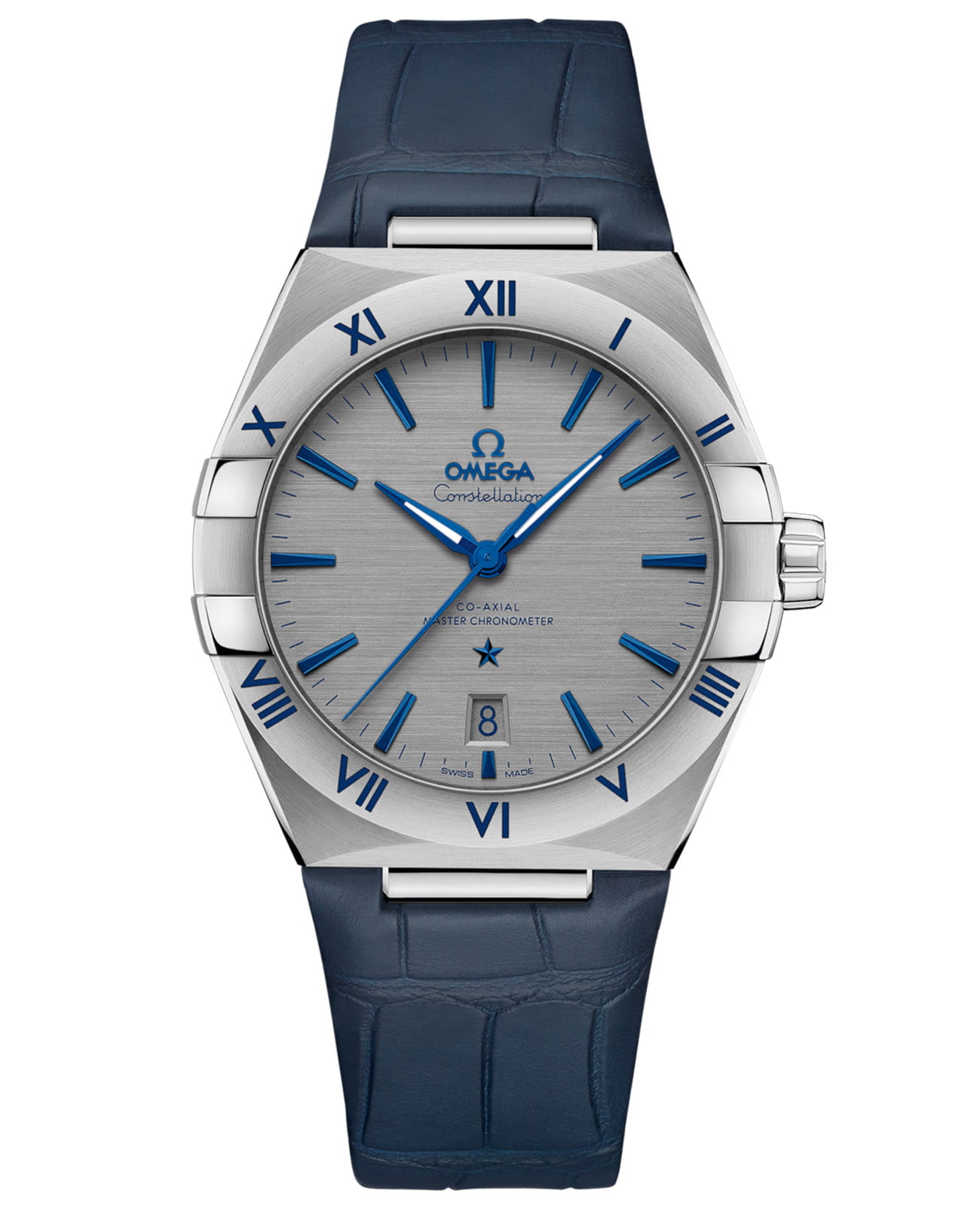 Драматичный и неизменный дизайн OMEGA Constellation характеризуется знаменитыми полумесяцами, а также «скобами» на боковой стороне корпуса. Эта 39-миллиметровая модель из нержавеющей стали оснащена безелемБезельВнешний ободок, закрепляющий стекло. В спортивных часах так называется поворотное кольцо с делениями на циферблате, выполняет роль таймера – замеряет отрезки времени на шкале. Неподвижный безель – элемент декора. Однонаправленно вращающийся безель на дайверских часах позволяет фиксировать моменты погружения и выныривания на поверхность. с воронеными римскими цифрами, глубоким горизонтально отшлифованным рутениево-серым циферблатом и окошком даты в положении «6 часов». Стрелки, логотип OMEGA, звезда Constellation и индексы окрашены в голубой цвет. Часы представлены на синем кожаном ремешке и оснащены коаксиальным хронометром OMEGA Master Chronometer Calibre 8800, который виден через куполообразное сапфировое стеклоСапфировое стеклоПрочный и надёжный материал из кристалла сапфира синтетического происхождения, характеризующийся особой твёрдостью и устойчивостью к царапинам и повреждениям., устойчивое к царапинам.
