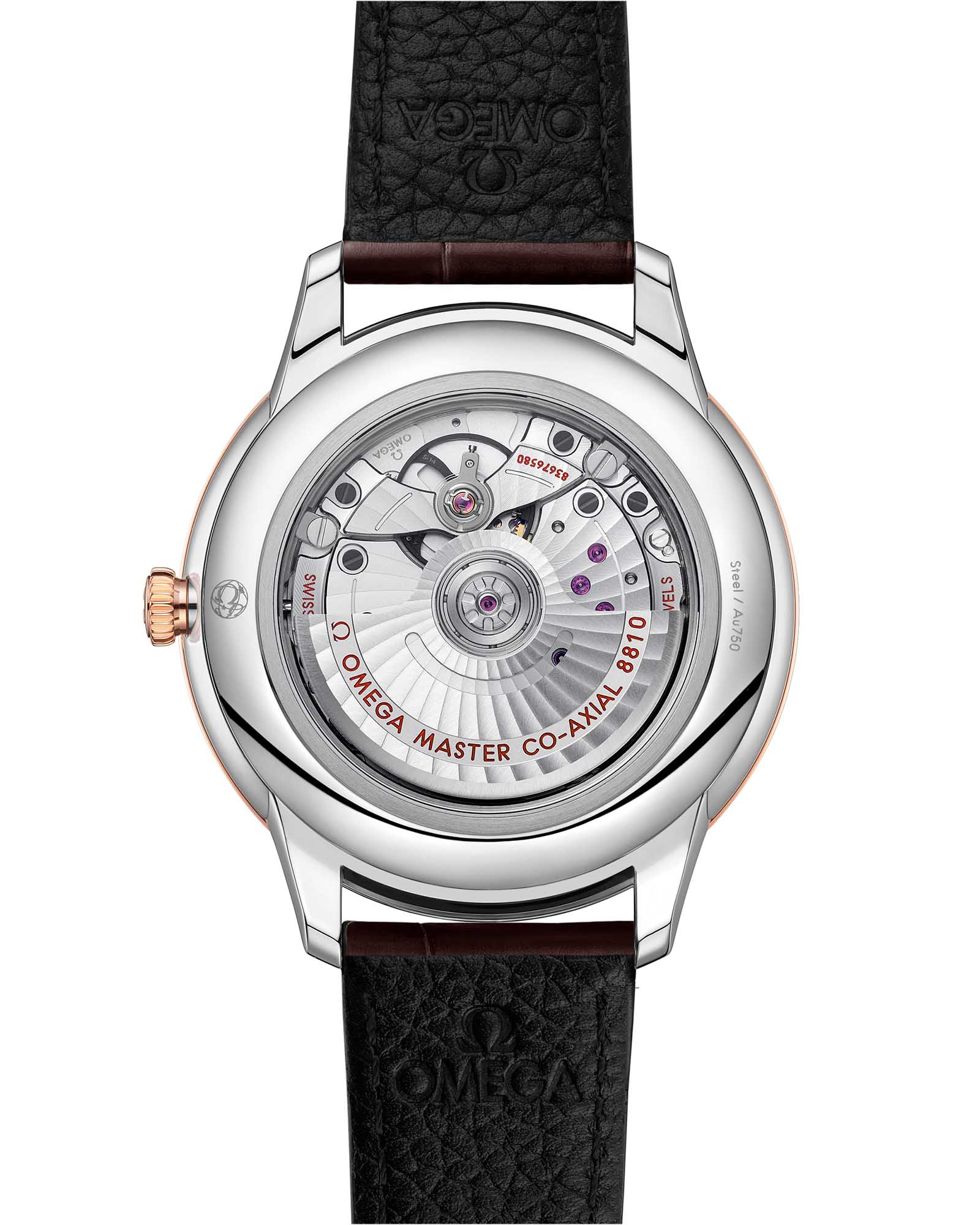 270-градусный индикатор запаса хода расположен в положении "6 часов". Он имеет двухслойную конструкцию в форме полумесяца, состоящую из нижней пластины с изящной контрастной отделкой, выполненной в одной цветовой гамме, и верхней пластины с 4-я секторальными прорезями. Изделие с лаконичным дизайном дополнено окошком указателя даты в положении «6 часов», счетчиком малой секундной стрелки в положении «9 часов» и минутной шкалой в стиле «железная дорога» на внешнем секторе. Часы с сертификатом Master Chronometer представлены с кожаным ремешком коричневого цвета. Модель оснащена калибром OMEGA Master Co-Axial 8810, который виден сквозь устойчивое к царапинам сапфировое стеклоСапфировое стеклоПрочный и надёжный материал из кристалла сапфира синтетического происхождения, характеризующийся особой твёрдостью и устойчивостью к царапинам и повреждениям. задней крышки корпуса.