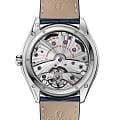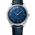 De Ville Trésor — современная интерпретация легендарной коллекции 1949 года, где традиции встречаются с инновациями. 40-мм корпус из нержавеющей стали с бриллиантовым безелемБезельВнешний ободок, закрепляющий стекло. В спортивных часах так называется поворотное кольцо с делениями на циферблате, выполняет роль таймера – замеряет отрезки времени на шкале. Неподвижный безель – элемент декора. Однонаправленно вращающийся безель на дайверских часах позволяет фиксировать моменты погружения и выныривания на поверхность. и синим кожаным ремешком воплощает изысканную простоту. Выпуклый синий циферблат с изящным узором украшен стрелками и индексами из  белого золота18-каратное золотоОбозначение по каратной системе пробирования, оно показывает, сколько драгоценного металла содержится в изделии. 18 карат - в составе 75% чистого золота, соответствует 750 пробе.