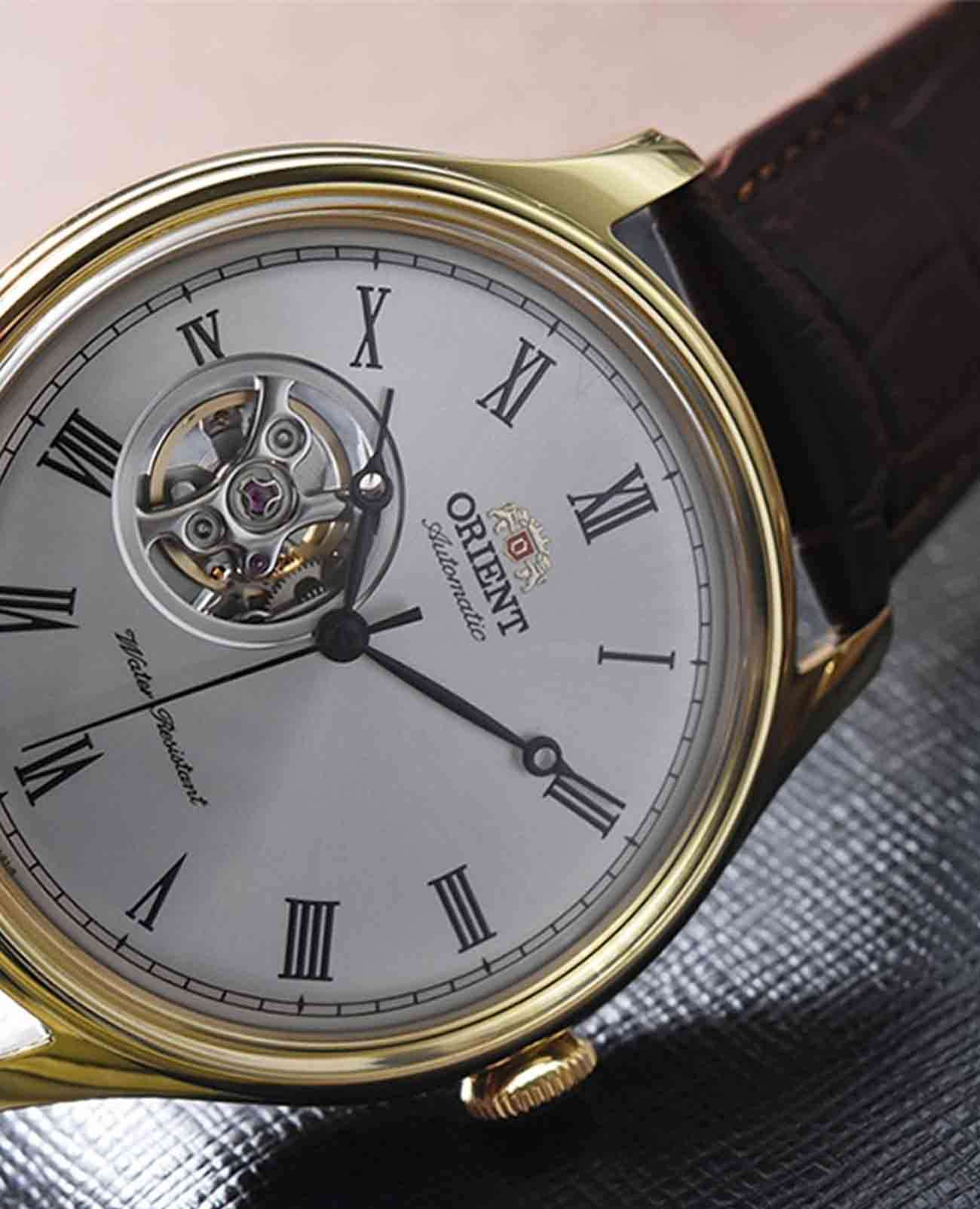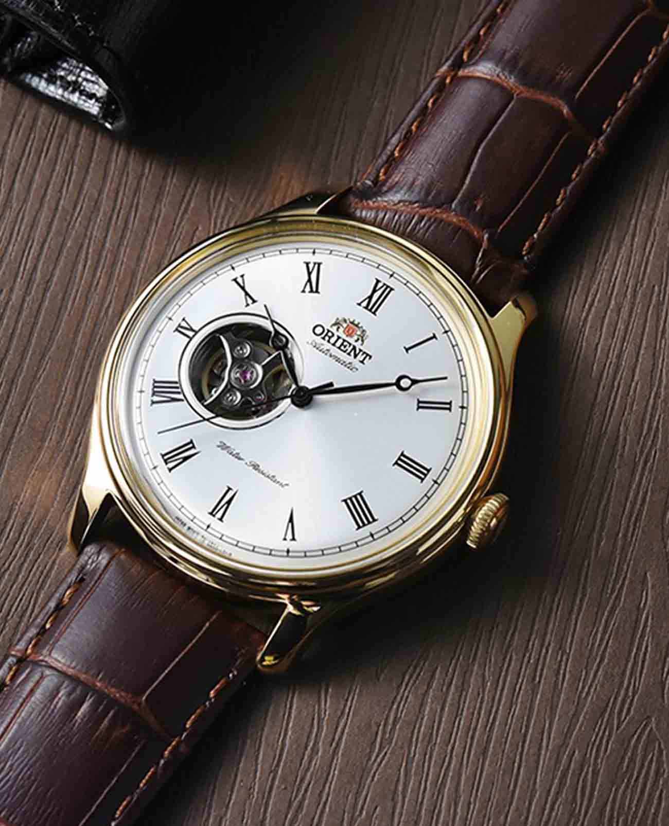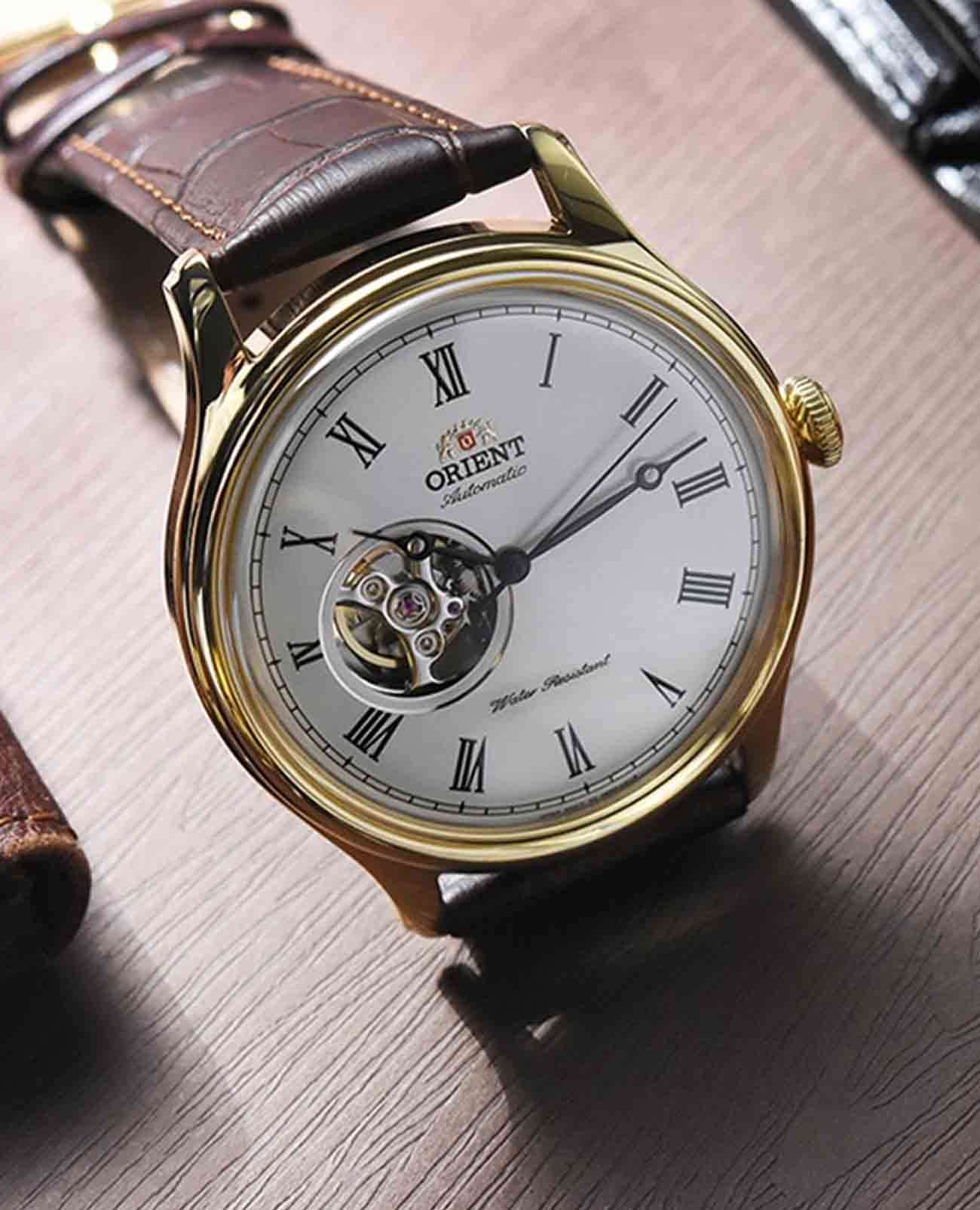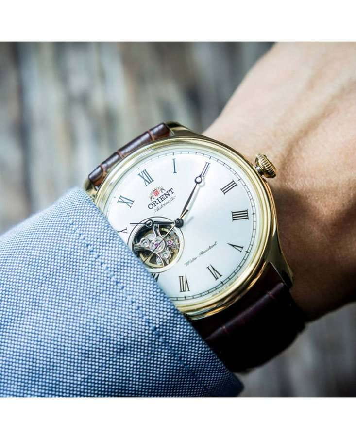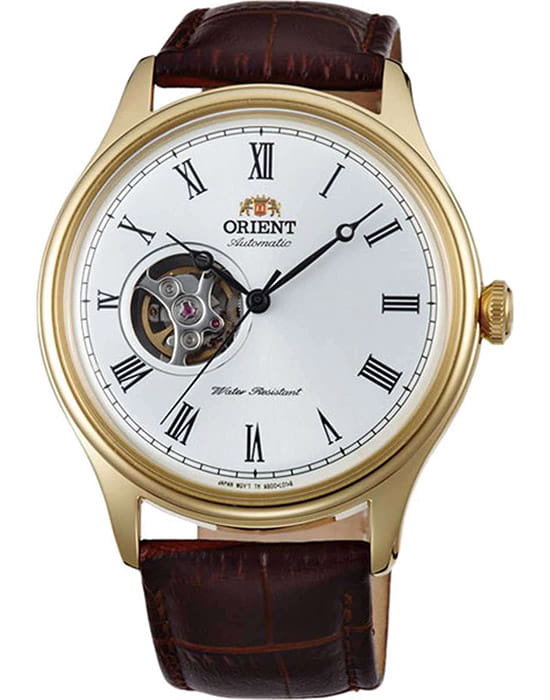 Orient Classic Open Heart AG00002W — это изысканные часы, сочетающие элегантный классический стиль с надежной механикой. Корпус диаметром 43 мм выполнен из нержавеющей стали с PVD-покрытиемPVDУльтратонкое покрытие наносится в технике вакуумного напыления, сочетает в себе нитрид титана особой прочности со слоем золота или оксида хрома. Несёт в себе декоративную или защитную функцию. розового цвета, что придаёт модели элегантный и утончённый вид. Белый циферблат украшен римскими цифрами и чёрными стрелками, обеспечивающими чёткую читаемость. Окошко "Open Heart" на отметке 9 часов позволяет наблюдать за работой механизма. Защитное минеральное стеклоМинеральное стеклоМинеральное стекло представляет собой искусственно выращенный минерал кварца. Такое стекло отличается особой устойчивостью к повреждениям и царапинам. Уступает по некоторым качествам сапфировому стеклу. с выпуклой формой добавляет часам винтажную эстетику. Внутри установлен автоматический механизм Orient калибра F6T22 с функцией ручного подзавода и стоп-секунды, обеспечивающий точность хода и запас энергии до 40 часов. Модель укомплектована коричневым кожаным ремешком с тиснением под крокодила, а классическая застёжка гарантирует удобную фиксацию на запястье. Водонепроницаемость 50 метров защищает часы от брызг и кратковременного контакта с водой, делая их отличным выбором для повседневного использования.