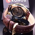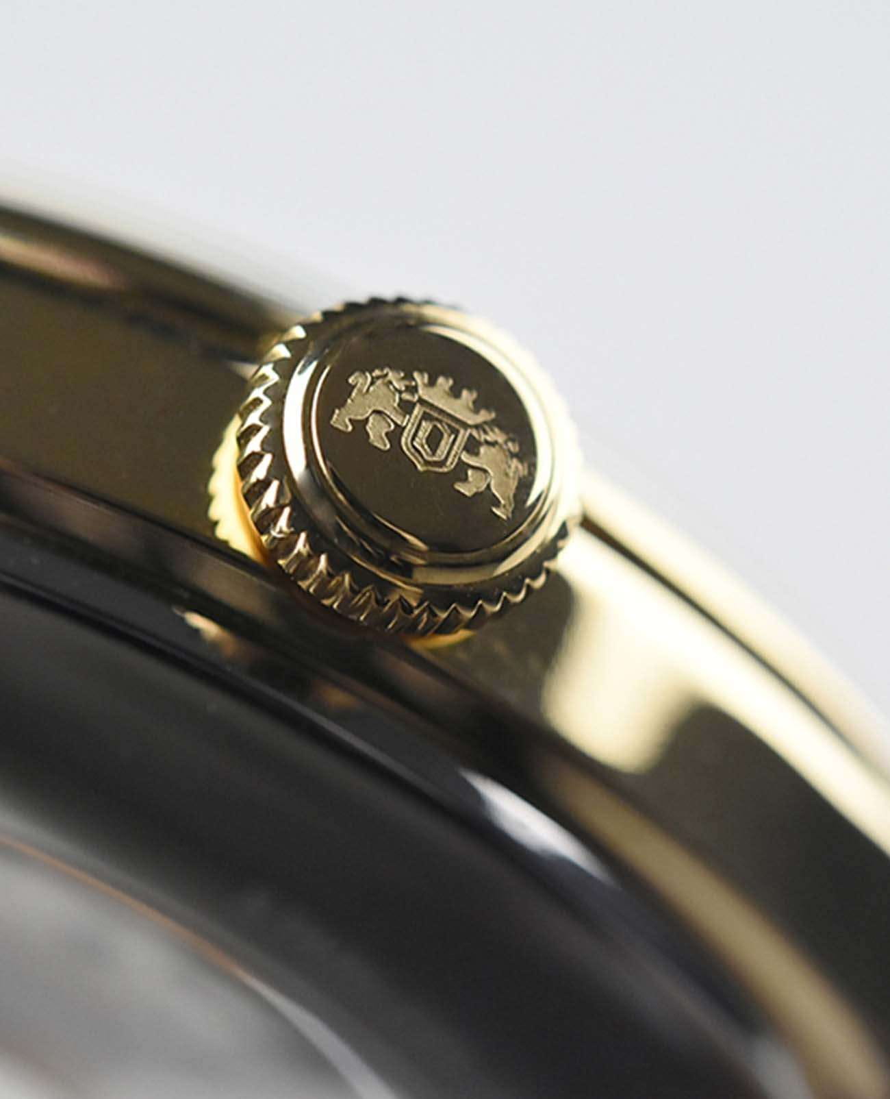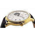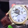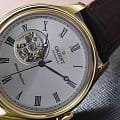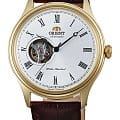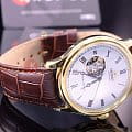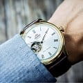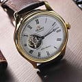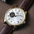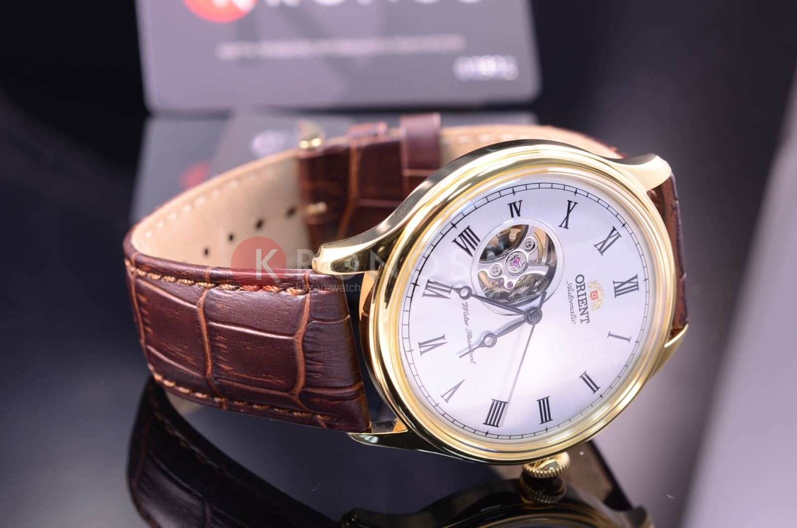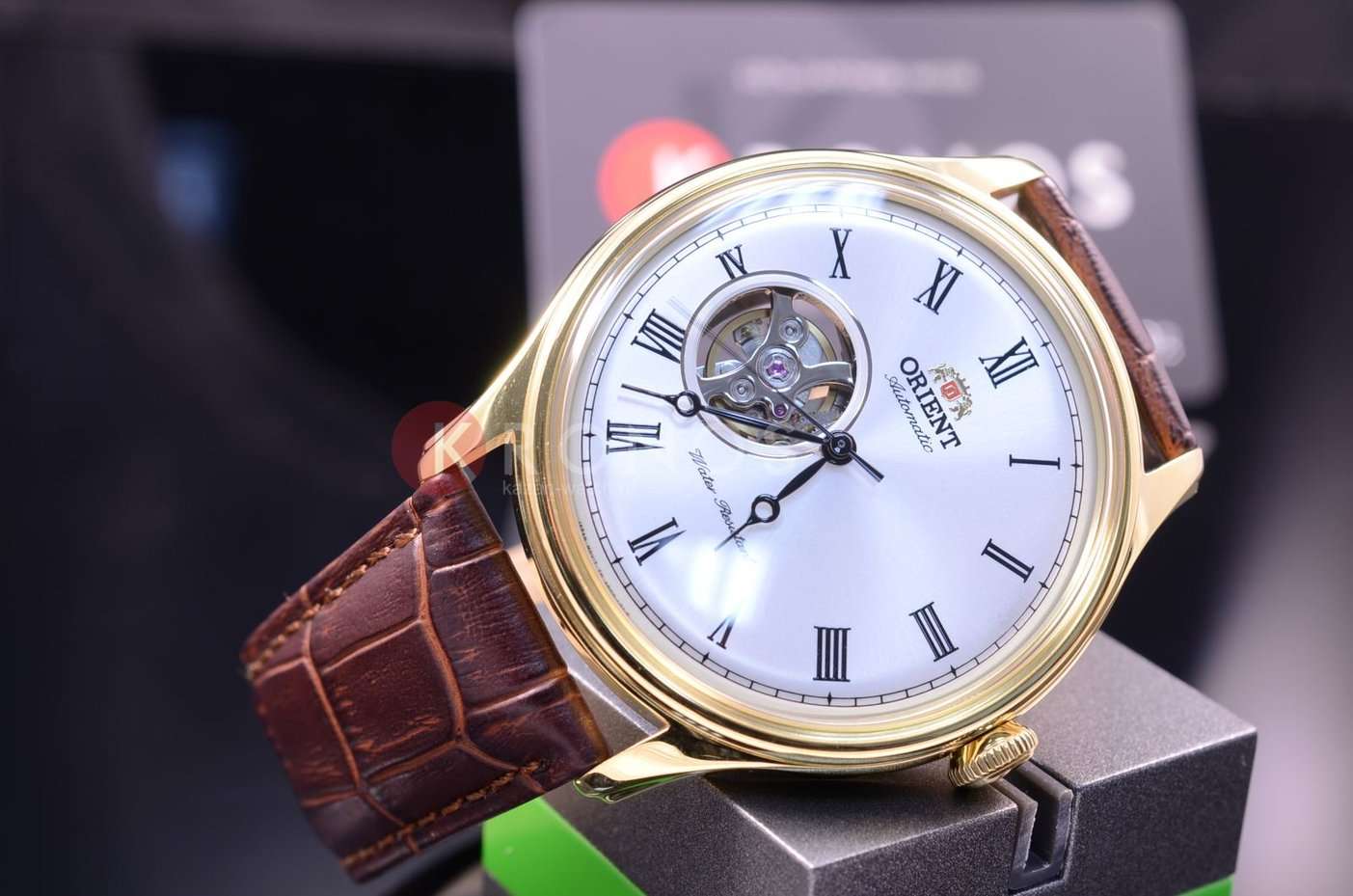 Orient Classic Open Heart AG00002W — это изысканные часы, сочетающие элегантный классический стиль с надежной механикой. Корпус диаметром 43 мм выполнен из нержавеющей стали с PVD-покрытиемPVDУльтратонкое покрытие наносится в технике вакуумного напыления, сочетает в себе нитрид титана особой прочности со слоем золота или оксида хрома. Несёт в себе декоративную или защитную функцию. розового цвета, что придаёт модели элегантный и утончённый вид. Белый циферблат украшен римскими цифрами и чёрными стрелками, обеспечивающими чёткую читаемость. Окошко "Open Heart" на отметке 9 часов позволяет наблюдать за работой механизма. Защитное минеральное стеклоМинеральное стеклоМинеральное стекло представляет собой искусственно выращенный минерал кварца. Такое стекло отличается особой устойчивостью к повреждениям и царапинам. Уступает по некоторым качествам сапфировому стеклу. с выпуклой формой добавляет часам винтажную эстетику. Внутри установлен автоматический механизм Orient калибра F6T22 с функцией ручного подзавода и стоп-секунды, обеспечивающий точность хода и запас энергии до 40 часов. Модель укомплектована коричневым кожаным ремешком с тиснением под крокодила, а классическая застёжка гарантирует удобную фиксацию на запястье. Водонепроницаемость 50 метров защищает часы от брызг и кратковременного контакта с водой, делая их отличным выбором для повседневного использования.