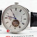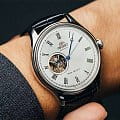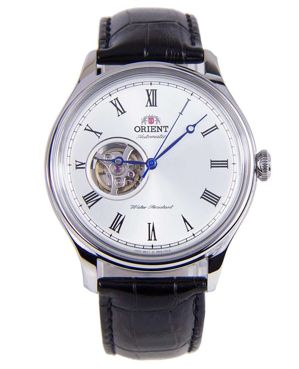 Orient Classic Open Heart AG00003W — изысканные классические часы, сочетающие элегантный стиль и высокую точность механики. Корпус диаметром 43 мм выполнен из нержавеющей стали с полированной отделкой, что придаёт модели благородный и утончённый вид. Белый циферблат с солнечным узором украшен римскими цифрами и изящными синими стрелками в стиле «бреге», обеспечивая превосходную читаемость. Окошко «Open Heart» на отметке 9 часов позволяет наблюдать за работой механизма, придавая модели сложность и индивидуальность. Защитное минеральное стеклоМинеральное стеклоМинеральное стекло представляет собой искусственно выращенный минерал кварца. Такое стекло отличается особой устойчивостью к повреждениям и царапинам. Уступает по некоторым качествам сапфировому стеклу. с выпуклой формой усиливает классический облик часов и защищает их от повреждений. Внутри установлен автоматический механизм Orient калибра F6T22 с возможностью ручного подзавода и функцией стоп-секунды, обеспечивающий точность хода и запас энергии до 40 часов. Модель комплектуется чёрным кожаным ремешком с тиснением под крокодила, а классическая застёжка гарантирует удобную фиксацию на запястье. Водонепроницаемость 50 метров защищает часы от брызг и кратковременного контакта с водой, делая их отличным выбором для повседневного использования.