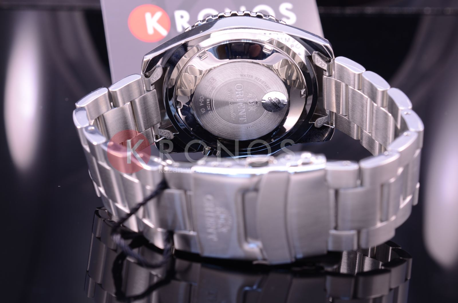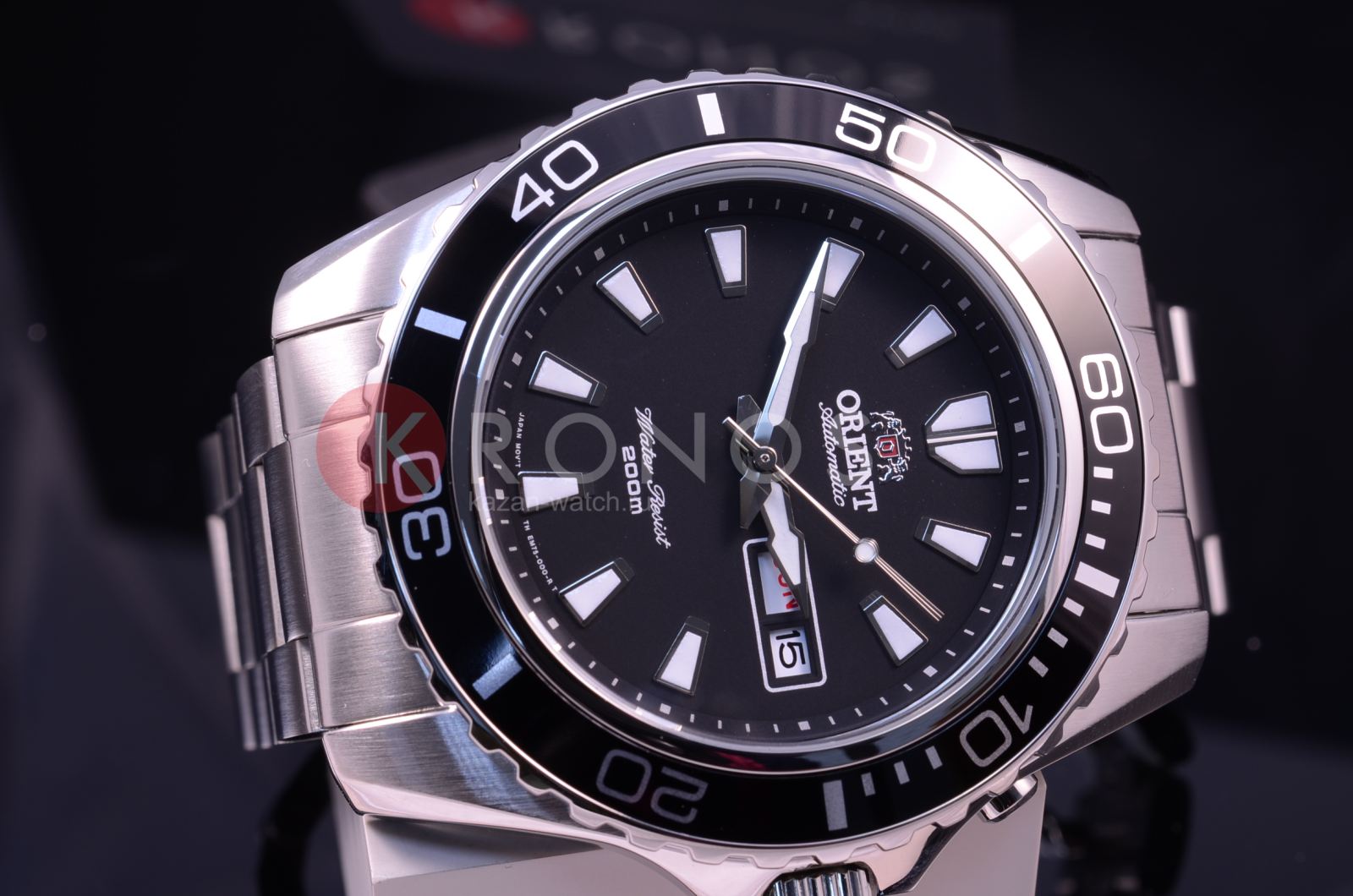 Чёрный циферблат с крупной индикацией времени не имеет лишних деталей. Японский автоматический калибр Orient 46943 имеет запас хода на 40 часов. Завинчивающаяся задняя крышка и заводная головка усиливают водостойкость в 200 метров. люминесцентная подсветкаЛюминесцентное покрытиеПозволяет считывать показания времени в темноте. Производители наносят на стрелки, часовые индексы, безель или поверхность циферблата светонакопительный состав, дающий холодное свечение. позволяет просматривать время и в темноте. На позиции 3 часов – окошко даты и дня недели.
