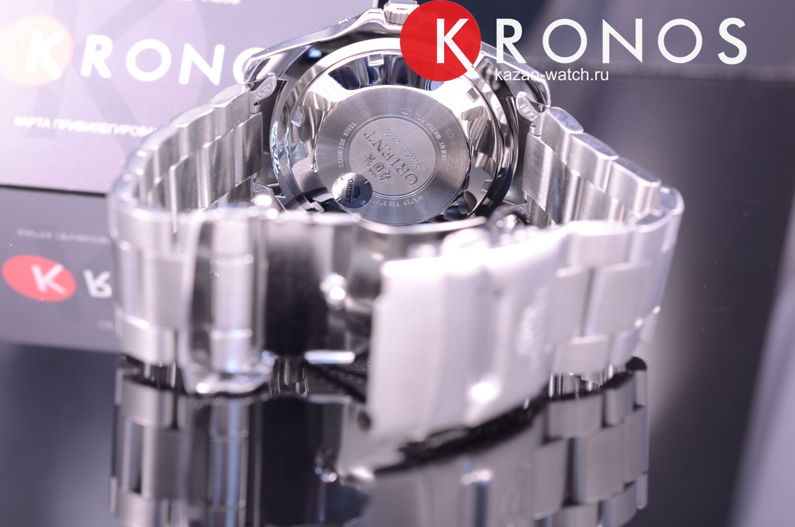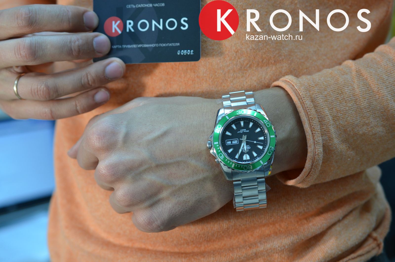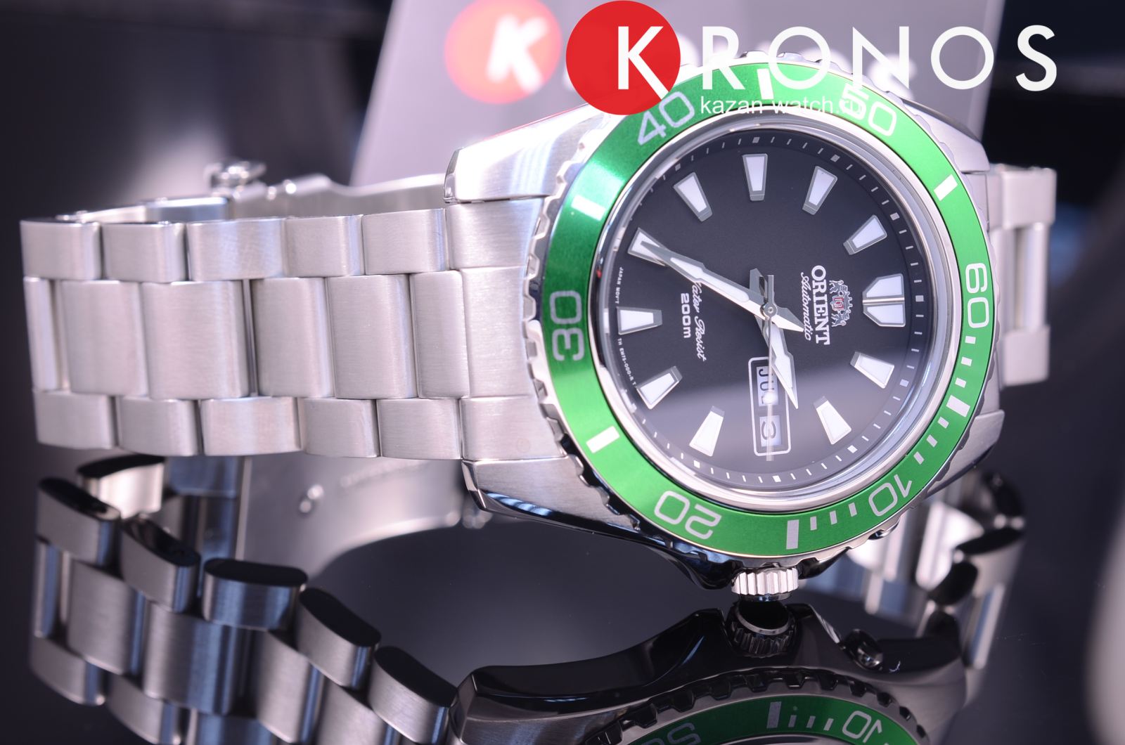 Чёрный циферблат с зелёным безелемБезельВнешний ободок, закрепляющий стекло. В спортивных часах так называется поворотное кольцо с делениями на циферблате, выполняет роль таймера – замеряет отрезки времени на шкале. Неподвижный безель – элемент декора. Однонаправленно вращающийся безель на дайверских часах позволяет фиксировать моменты погружения и выныривания на поверхность. не имеет лишних деталей. Японский автоматический калибр Orient 46943 имеет запас хода на 40 часов. Завинчивающаяся задняя крышка и заводная головка усиливают водостойкость в 200 метров. люминесцентная подсветкаЛюминесцентное покрытиеПозволяет считывать показания времени в темноте. Производители наносят на стрелки, часовые индексы, безель или поверхность циферблата светонакопительный состав, дающий холодное свечение. позволяет просматривать время и в темноте. На позиции 3 часов – окошко даты и дня недели.