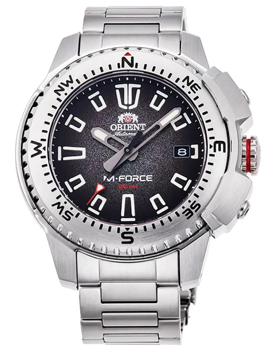 Мужские механические японские наручные часы с автоподзаводом Orient M-Force RA-AC0N01B10B. Сапфировое стеклоСапфировое стеклоПрочный и надёжный материал из кристалла сапфира синтетического происхождения, характеризующийся особой твёрдостью и устойчивостью к царапинам и повреждениям. устойчивое к появлению царапин, обладающее высокой прозрачностью. Класс водозащиты: 200 метров, позволит плавать, нырять и заниматься другими водными видами спорта. Корпус часов изготовлен из нержавеющей стали. Поворотный безельБезельВнешний ободок, закрепляющий стекло. В спортивных часах так называется поворотное кольцо с делениями на циферблате, выполняет роль таймера – замеряет отрезки времени на шкале. Неподвижный безель – элемент декора. Однонаправленно вращающийся безель на дайверских часах позволяет фиксировать моменты погружения и выныривания на поверхность. из нержавеющей стали. Стальной браслет на раскладной застёжкеРаскладная застёжкаТакой тип застёжки используется только на браслетах из металла. Она никогда не раскрывается полностью, происходит разделение на 2 и более частей. Раскладывающая застёжка снизит вероятность потери часов к минимуму..