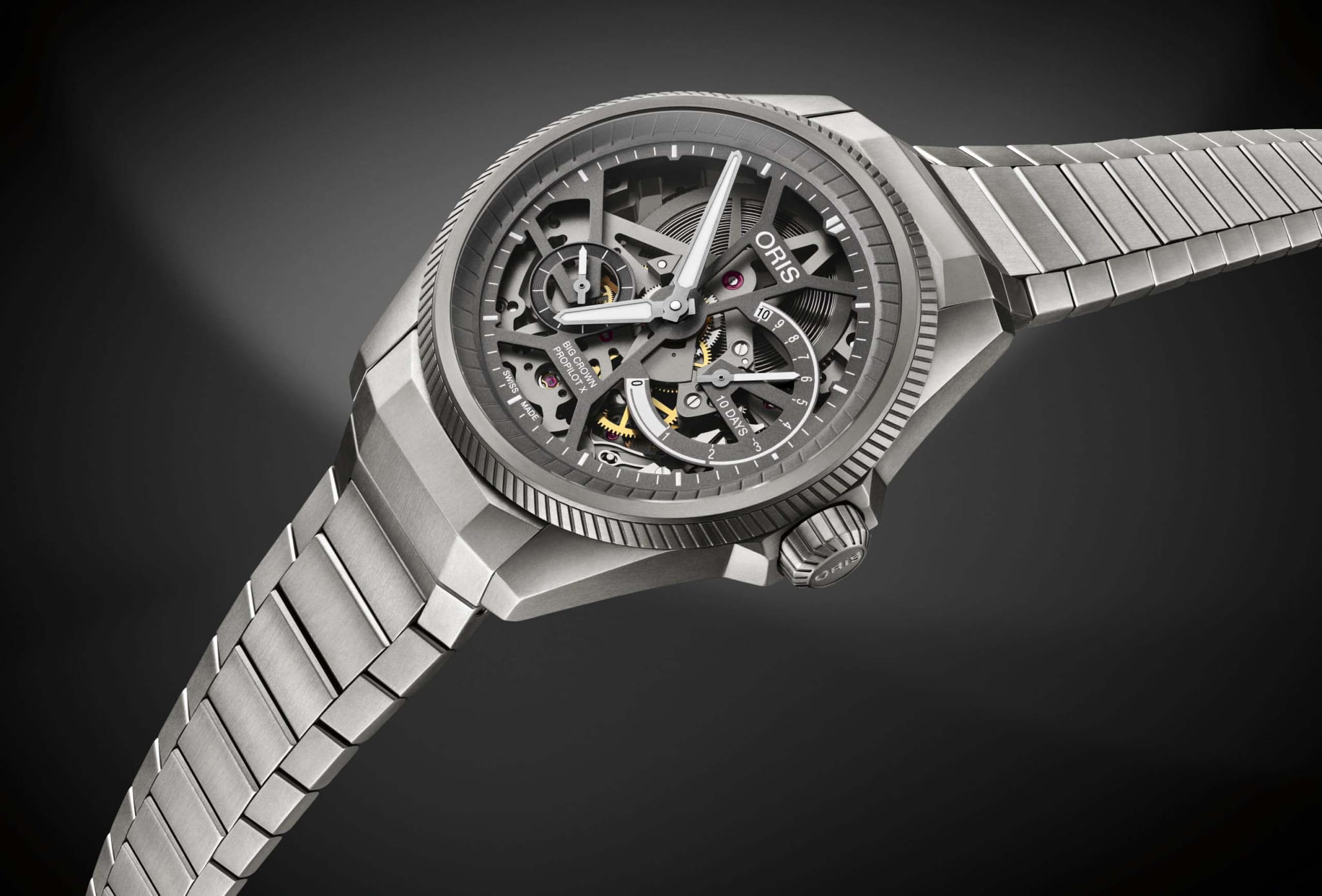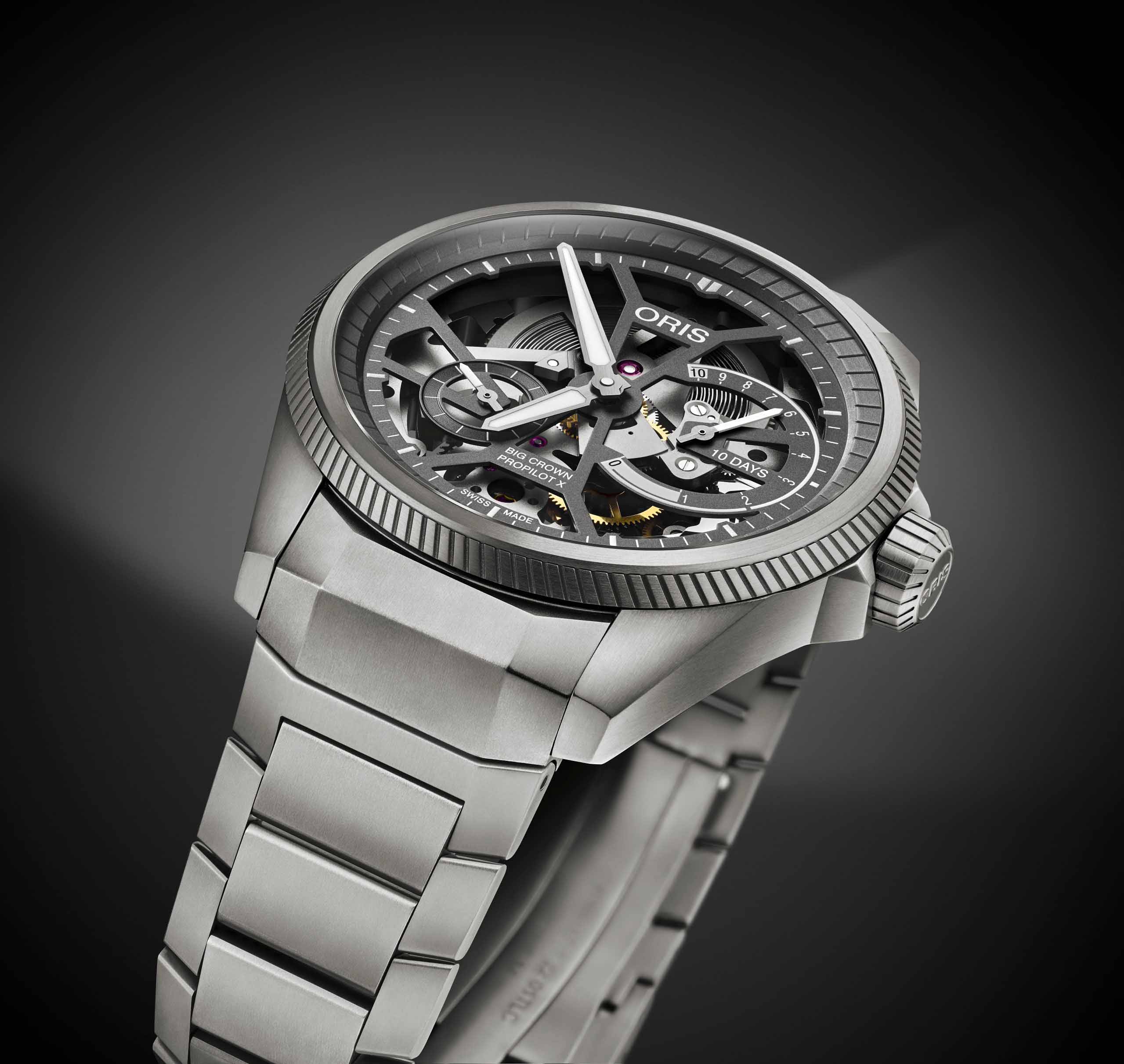 Откройте для себя ProPilot X Calibre 115, архитектурную красоту с титановым корпусом и браслетом, скелетонизированным циферблатом и 10-дневным запасом хода - характеристики, которые объединяет вечная радость независимого швейцарского механического часового дела. ProPilot X Calibre 115, шедевр современного часового искусства, в титановом корпусе 44 мм. В них установлен завораживающий Calibre 115 - скелетонизированная версия 10-дневного калибра с ручным заводом, нелинейным индикатором запаса хода и малой секундной стрелкой.