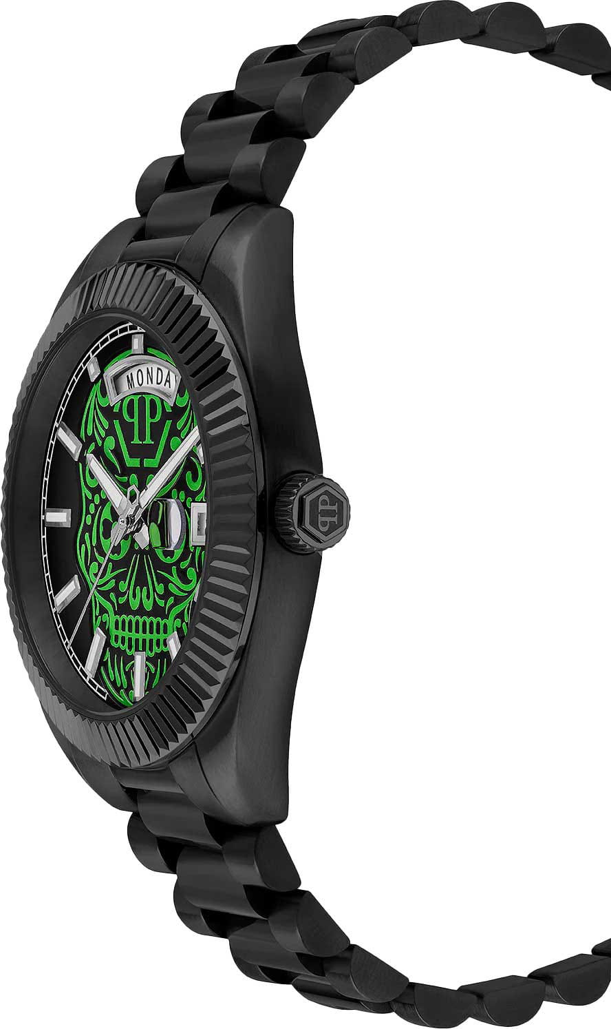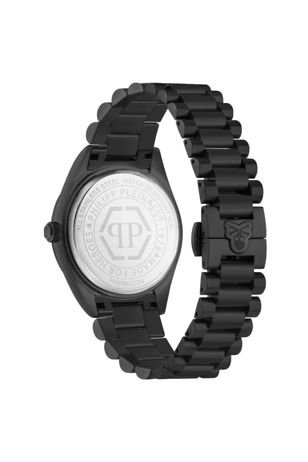 Мужские кварцевые часы Philipp Plein Date Superlative Gent PWPNA0724, кварцевый механизм с высокой точностью. Класс водозащиты: 50 метров, позволит защитить корпус от случайных брызг или капель дождя. Корпус и браслет часов изготовлены из стали. Прочное минеральное стеклоМинеральное стеклоМинеральное стекло представляет собой искусственно выращенный минерал кварца. Такое стекло отличается особой устойчивостью к повреждениям и царапинам. Уступает по некоторым качествам сапфировому стеклу. устойчивое к мелким механическим повреждениям. Браслет дополняет застёжка-бабочка с кнопкамиЗастёжка "бабочка"Такой вид застёжки дополняется предохранителями, помогающими избежать случайного раскрытия браслета. Обладают изящным исполнением. .