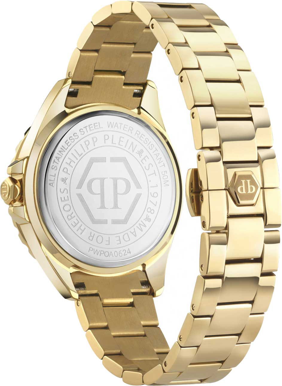 Женские часы Philipp Plein PWPOA0624 с надежным кварцевым механизмом. Корпус часов изготовлен из стали с IP-покрытиемIP-покрытиеМетод ионного напыления. Демонстрирует повышенную устойчивость к истиранию, окислению и химическим веществам. Под воздействием высокого давления и температуры около 1500°C молекулы металла надёжно соединяются с частицами корпуса часов.. Минеральное стеклоМинеральное стеклоМинеральное стекло представляет собой искусственно выращенный минерал кварца. Такое стекло отличается особой устойчивостью к повреждениям и царапинам. Уступает по некоторым качествам сапфировому стеклу. устойчивое к мелким механическим повреждениям. Влагозащита: 50 метров, позволит плавать, нырять и заниматься другими водными видами спорта. Стрелки и метки с люминесцентным покрытиемЛюминесцентное покрытиеПозволяет считывать показания времени в темноте. Производители наносят на стрелки, часовые индексы, безель или поверхность циферблата светонакопительный состав, дающий холодное свечение..