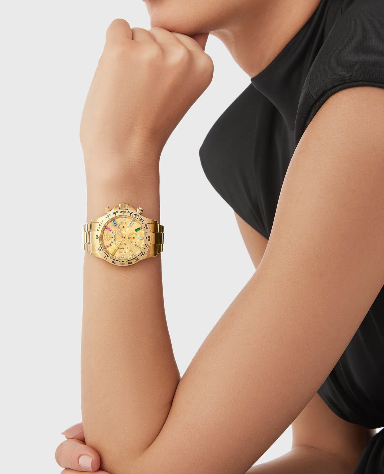 Яркие женские часы-хронографХронографФункция позволяет измерять отрезки времени с особой точностью: часы, минуты, секунды. Верным признаком хронографа является наличие на циферблате 3 дополнительных окошек-счётчиков. с секундомеромСекундомерСекундоме́р — прибор, способный измерять интервалы времени с точностью до долей секунды. Philipp Plein Nobile Lady PWSBA0223, кварцевый механизм с высокой точностью. 12 и 24-часовой формат времени. Класс водозащиты: 50 метров, позволит защитить корпус от случайных брызг или капель дождя. Корпус и браслет часов изготовлены из стали с IP-покрытиемIP-покрытиеМетод ионного напыления. Демонстрирует повышенную устойчивость к истиранию, окислению и химическим веществам. Под воздействием высокого давления и температуры около 1500°C молекулы металла надёжно соединяются с частицами корпуса часов.. Стрелки с люминесцентным покрытиемЛюминесцентное покрытиеПозволяет считывать показания времени в темноте. Производители наносят на стрелки, часовые индексы, безель или поверхность циферблата светонакопительный состав, дающий холодное свечение.. Стальной браслет на застёжке-бабочке с кнопкамиЗастёжка "бабочка"Такой вид застёжки дополняется предохранителями, помогающими избежать случайного раскрытия браслета. Обладают изящным исполнением. . Циферблат инкрустирован кристаллами Preciosa.
