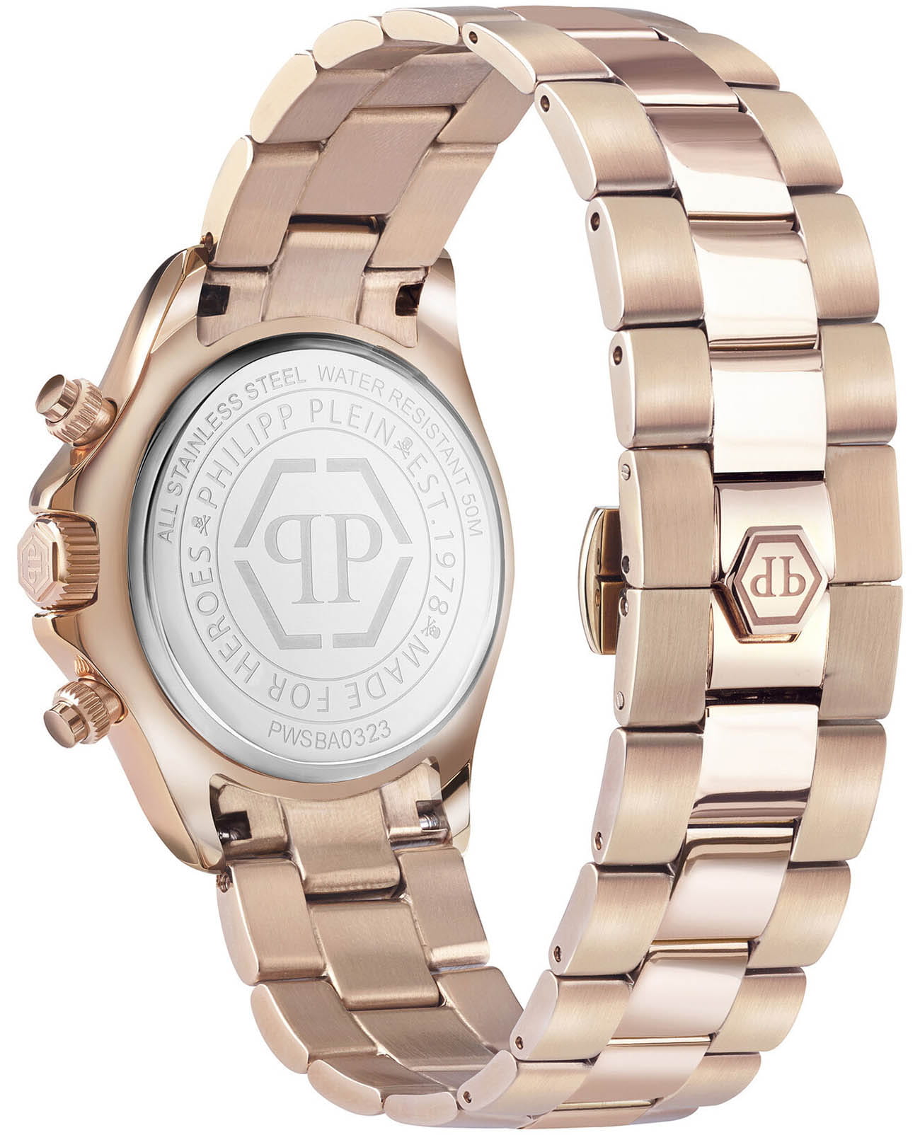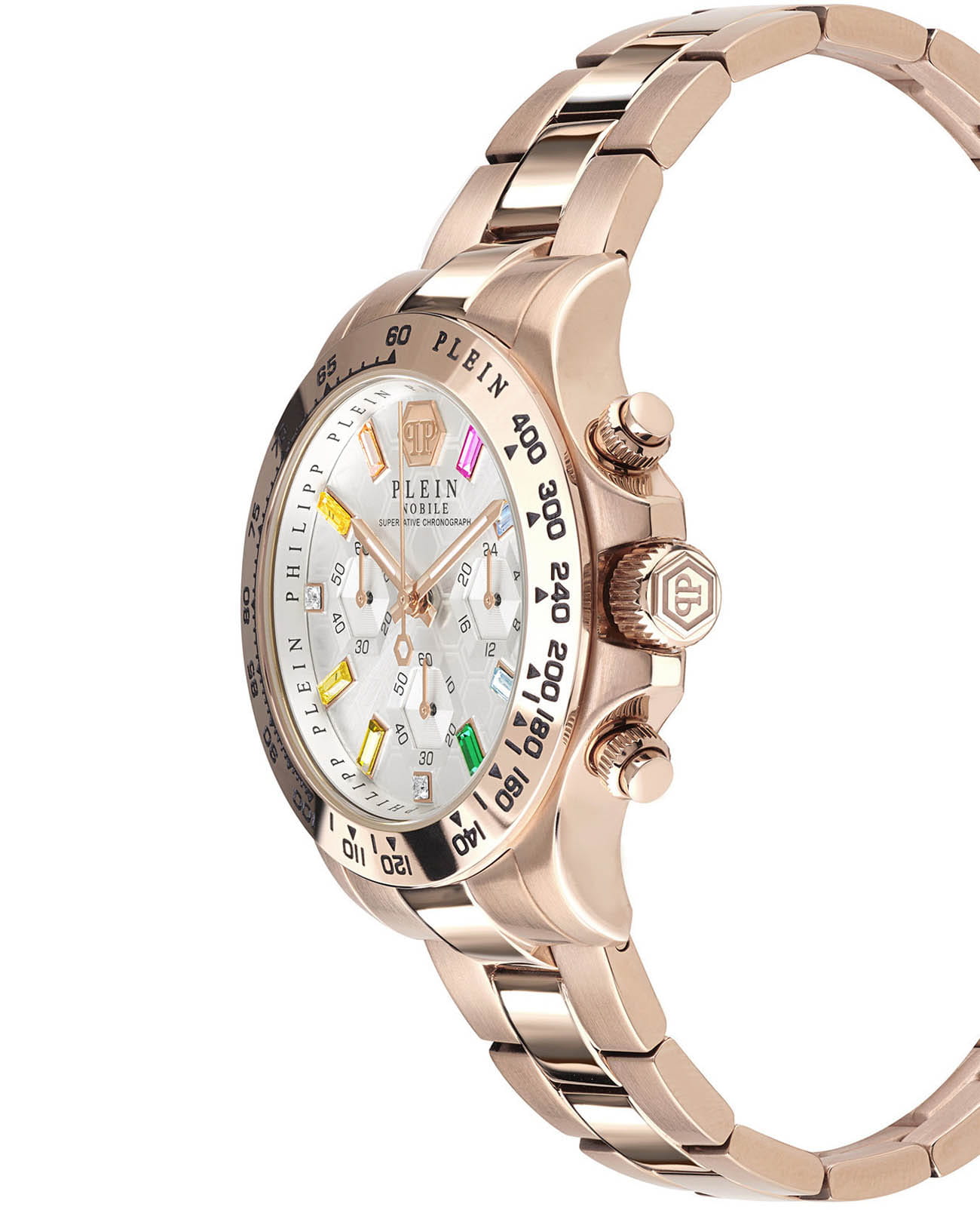 Яркие женские часы-хронографХронографФункция позволяет измерять отрезки времени с особой точностью: часы, минуты, секунды. Верным признаком хронографа является наличие на циферблате 3 дополнительных окошек-счётчиков. с секундомеромСекундомерСекундоме́р — прибор, способный измерять интервалы времени с точностью до долей секунды. Philipp Plein Nobile Lady PWSBA0323, кварцевый механизм с высокой точностью. 12 и 24-часовой формат времени. Класс водозащиты: 50 метров, позволит защитить корпус от случайных брызг или капель дождя. Корпус и браслет часов изготовлены из стали с IP-покрытиемIP-покрытиеМетод ионного напыления. Демонстрирует повышенную устойчивость к истиранию, окислению и химическим веществам. Под воздействием высокого давления и температуры около 1500°C молекулы металла надёжно соединяются с частицами корпуса часов.. Стрелки с люминесцентным покрытиемЛюминесцентное покрытиеПозволяет считывать показания времени в темноте. Производители наносят на стрелки, часовые индексы, безель или поверхность циферблата светонакопительный состав, дающий холодное свечение.. Стальной браслет на застёжке-бабочке с кнопкамиЗастёжка "бабочка"Такой вид застёжки дополняется предохранителями, помогающими избежать случайного раскрытия браслета. Обладают изящным исполнением. . Циферблат инкрустирован кристаллами Preciosa.