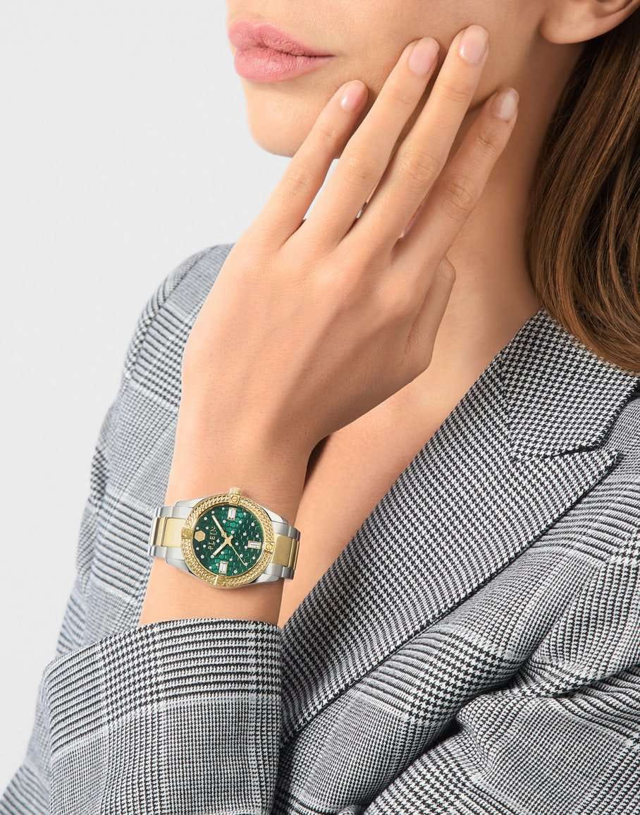 Женские кварцевые часы Philipp Plein Plein Icon Chain PW1FA0325 — это стильное сочетание элегантности и современного дизайна. Изящный корпус выполнен из нержавеющей стали, диаметром 36 мм, что придаст образу женственности и романтизма. Изысканный циферблат с метками в виде штрихов придает модели особый блеск. Циферблат защищен минеральным стекломМинеральное стеклоМинеральное стекло представляет собой искусственно выращенный минерал кварца. Такое стекло отличается особой устойчивостью к повреждениям и царапинам. Уступает по некоторым качествам сапфировому стеклу., обеспечивающий устойчивость к царапинам и украшен кристаллами. Стрелки с люминесцентным покрытиемЛюминесцентное покрытиеПозволяет считывать показания времени в темноте. Производители наносят на стрелки, часовые индексы, безель или поверхность циферблата светонакопительный состав, дающий холодное свечение.. БезельБезельВнешний ободок, закрепляющий стекло. В спортивных часах так называется поворотное кольцо с делениями на циферблате, выполняет роль таймера – замеряет отрезки времени на шкале. Неподвижный безель – элемент декора. Однонаправленно вращающийся безель на дайверских часах позволяет фиксировать моменты погружения и выныривания на поверхность. с PVD-покрытиемPVDУльтратонкое покрытие наносится в технике вакуумного напыления, сочетает в себе нитрид титана особой прочности со слоем золота или оксида хрома. Несёт в себе декоративную или защитную функцию. золотистого цвета. Часы оснащены надежным кварцевым механизмом. Стальной браслет с частичным PVD-покрытиемPVDУльтратонкое покрытие наносится в технике вакуумного напыления, сочетает в себе нитрид титана особой прочности со слоем золота или оксида хрома. Несёт в себе декоративную или защитную функцию. на застёжке-бабочкеЗастёжка "бабочка"Такой вид застёжки дополняется предохранителями, помогающими избежать случайного раскрытия браслета. Обладают изящным исполнением. , гарантирует комфортное и безопасное ношение. Класс водозащиты: 50 метров позволит защитить корпус от случайных брызг или капель дождя. Phlipp Plein — отличный выбор для тех, кто ценит яркость и качество.