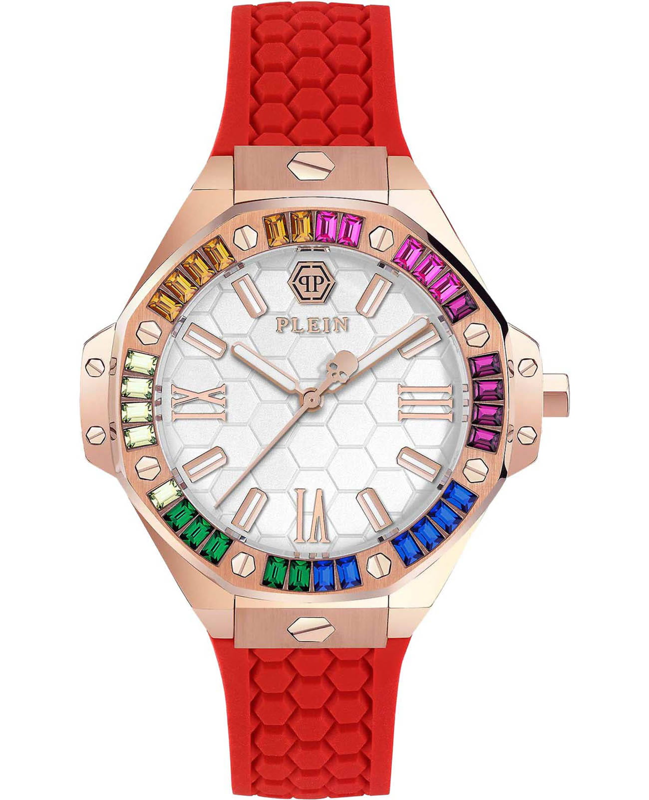 Philipp Plein Plein Lady Royal PWBDA0524 — стильные женские часы, сочетающие элегантный дизайн и функциональность. Корпус диаметром 39 мм выполнен из нержавеющей стали с розовым PVD-покрытиемPVDУльтратонкое покрытие наносится в технике вакуумного напыления, сочетает в себе нитрид титана особой прочности со слоем золота или оксида хрома. Несёт в себе декоративную или защитную функцию., что придаёт часам роскошный вид. Минеральное стеклоМинеральное стеклоМинеральное стекло представляет собой искусственно выращенный минерал кварца. Такое стекло отличается особой устойчивостью к повреждениям и царапинам. Уступает по некоторым качествам сапфировому стеклу. защищает циферблат от царапин, сохраняя его безупречный внешний вид. Циферблат инкрустирован кристаллами. Серебристый циферблат с шестиугольной текстурой подчёркивает фирменный стиль бренда. Часы оснащены кварцевым механизмом, который гарантирует точность хода. Водозащита до 5 ATM (50 метров) делает часы подходящими для повседневного использования. Ремешок из красного силикона обеспечивает комфортное ношение и надёжную фиксацию благодаря классической застёжке. Ширина ремешка 16 мм гармонично дополняет корпус, завершая стильный и современный образ.