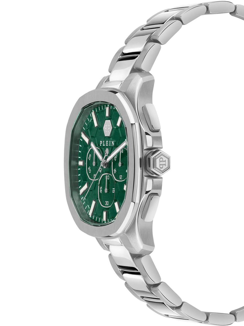 Яркие мужские часы-хронографХронографФункция позволяет измерять отрезки времени с особой точностью: часы, минуты, секунды. Верным признаком хронографа является наличие на циферблате 3 дополнительных окошек-счётчиков. с секундомеромСекундомерСекундоме́р — прибор, способный измерять интервалы времени с точностью до долей секунды. Philipp Plein PWSAA0223, кварцевый механизм с высокой точностью. Класс водозащиты: 50 метров, позволит защитить корпус от случайных брызг или капель дождя. Корпус часов изготовлен из стали. Стрелки и метки с люминесцентным покрытиемЛюминесцентное покрытиеПозволяет считывать показания времени в темноте. Производители наносят на стрелки, часовые индексы, безель или поверхность циферблата светонакопительный состав, дающий холодное свечение.. Застёжка бабочка с кнопкамиЗастёжка "бабочка"Такой вид застёжки дополняется предохранителями, помогающими избежать случайного раскрытия браслета. Обладают изящным исполнением.