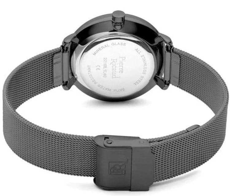 Женские кварцевые часы с минеральным стекломМинеральное стеклоМинеральное стекло представляет собой искусственно выращенный минерал кварца. Такое стекло отличается особой устойчивостью к повреждениям и царапинам. Уступает по некоторым качествам сапфировому стеклу. Pierre Ricaud P22168.S116Q, кварцевый механизм с высокой точностью. Класс водозащиты: 50 метров, позволит защитить корпус от случайных брызг или капель дождя. Корпус часов изготовлен из стали с IP-покрытиемIP-покрытиеМетод ионного напыления. Демонстрирует повышенную устойчивость к истиранию, окислению и химическим веществам. Под воздействием высокого давления и температуры около 1500°C молекулы металла надёжно соединяются с частицами корпуса часов.. Стальной браслет на раскладной застёжкеРаскладная застёжкаТакой тип застёжки используется только на браслетах из металла. Она никогда не раскрывается полностью, происходит разделение на 2 и более частей. Раскладывающая застёжка снизит вероятность потери часов к минимуму. с IP-покрытиемIP-покрытиеМетод ионного напыления. Демонстрирует повышенную устойчивость к истиранию, окислению и химическим веществам. Под воздействием высокого давления и температуры около 1500°C молекулы металла надёжно соединяются с частицами корпуса часов..