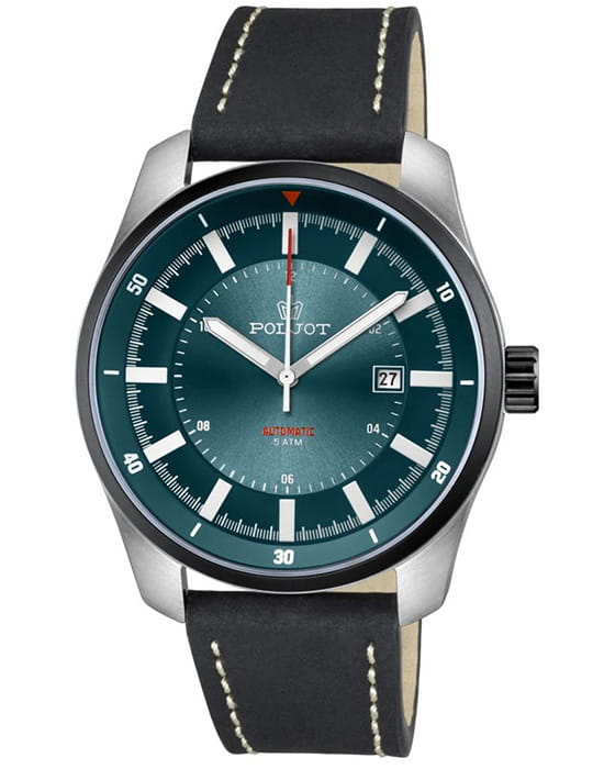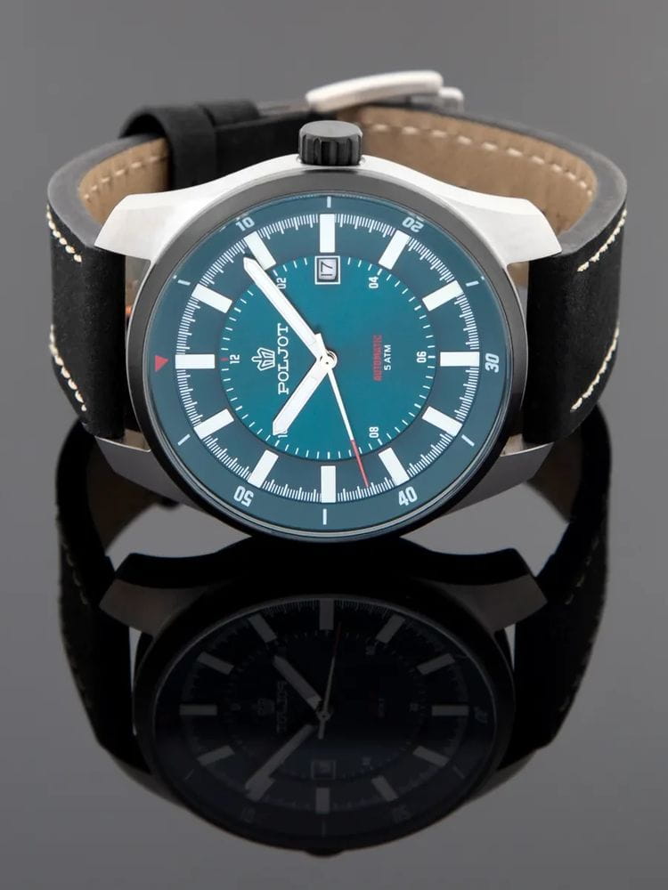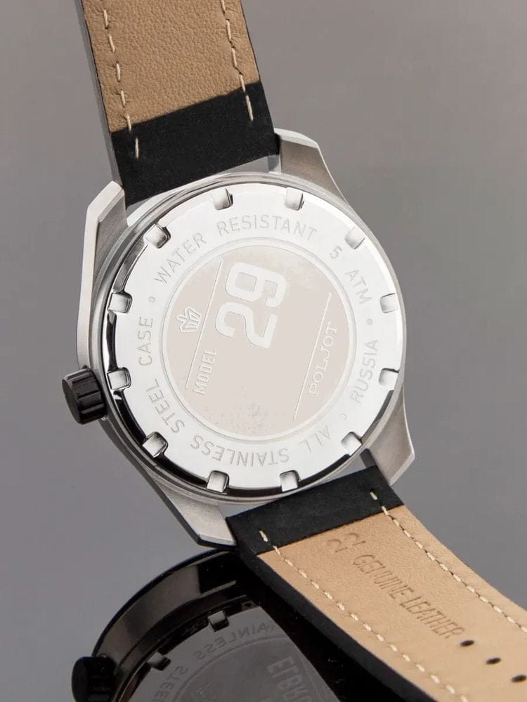 Poljot 8215.291233 — современные механические часы с автоподзаводом, воплощающие дух надёжности и динамичного стиля. Корпус из нержавеющей стали гармонично сочетается с насыщенным циферблатом, украшенным радиальным узором, а контрастные акценты придают модели выразительность и спортивный характер. БезельБезельВнешний ободок, закрепляющий стекло. В спортивных часах так называется поворотное кольцо с делениями на циферблате, выполняет роль таймера – замеряет отрезки времени на шкале. Неподвижный безель – элемент декора. Однонаправленно вращающийся безель на дайверских часах позволяет фиксировать моменты погружения и выныривания на поверхность. с PVD-покрытиемPVDУльтратонкое покрытие наносится в технике вакуумного напыления, сочетает в себе нитрид титана особой прочности со слоем золота или оксида хрома. Несёт в себе декоративную или защитную функцию.. В основе конструкции — проверенный японский калибр Miyota 8215, обеспечивающий точный ход и плавное движение стрелок. Метки и стрелки с люминесцентным покрытиемЛюминесцентное покрытиеПозволяет считывать показания времени в темноте. Производители наносят на стрелки, часовые индексы, безель или поверхность циферблата светонакопительный состав, дающий холодное свечение. обеспечивают отличную читаемость даже в условиях слабого освещения. Окно даты, подчеркивая симметрию дизайна. Прочное минеральное стеклоМинеральное стеклоМинеральное стекло представляет собой искусственно выращенный минерал кварца. Такое стекло отличается особой устойчивостью к повреждениям и царапинам. Уступает по некоторым качествам сапфировому стеклу. надёжно защищает циферблат, а ремешок из натуральной кожи с контрастной строчкой придаёт модели уют и стиль. Poljot — универсальные часы для мужчины, ценящего механическую точность и уверенный, сдержанный стиль в каждой детали.