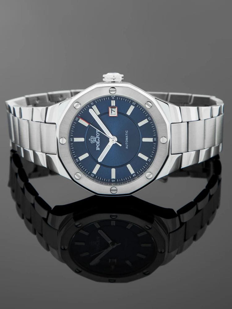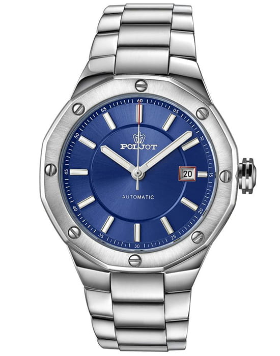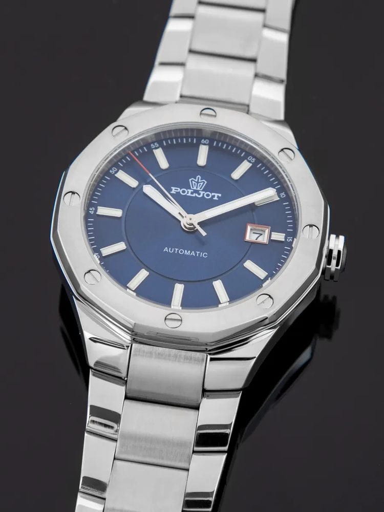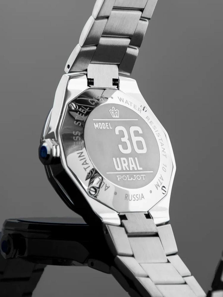 Poljot Ural 8215.361246Б — стильные механические часы с автоподзаводом, сочетающие брутальный характер и современную элегантность. Корпус выполнен из нержавеющей стали, что придаёт модели монолитность и прочность, а глубокий циферблат подчеркивает премиальный облик. Стальной браслет на застёжке-бабочке с кнопкамиЗастёжка "бабочка"Такой вид застёжки дополняется предохранителями, помогающими избежать случайного раскрытия браслета. Обладают изящным исполнением. . Внутри установлен надёжный японский механизм Miyota 8215, обеспечивающий точный ход и плавную работу стрелок. Широкие метки и стрелки с люминесцентным покрытиемЛюминесцентное покрытиеПозволяет считывать показания времени в темноте. Производители наносят на стрелки, часовые индексы, безель или поверхность циферблата светонакопительный состав, дающий холодное свечение. гарантируют превосходную читаемость в любое время суток, а окно даты добавляет удобства. Прочное минеральное стеклоМинеральное стеклоМинеральное стекло представляет собой искусственно выращенный минерал кварца. Такое стекло отличается особой устойчивостью к повреждениям и царапинам. Уступает по некоторым качествам сапфировому стеклу. защищает циферблат от повреждений, а водонепроницаемость до 10 бар делает часы надёжным спутником как в деловом, так и активном образе жизни. Poljot Ural — воплощение силы, точности и мужского стиля, созданное для тех, кто ценит механику и уверенность в каждой детали.