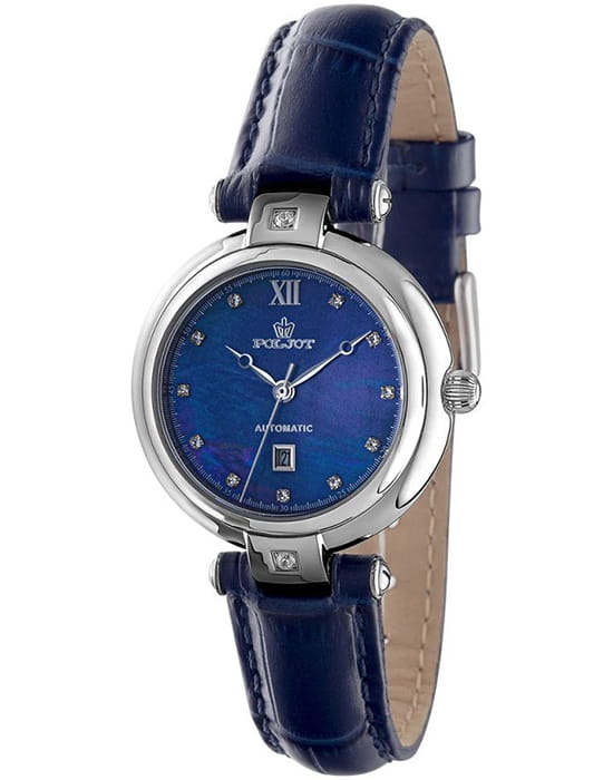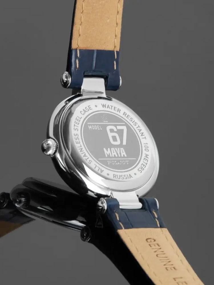 Poljot Maya NH05.671012 — утончённые женские механические часы с автоподзаводом, в которых классическая элегантность сочетается с современным характером. Корпус из нержавеющей стали подчёркивает изящество формы, а глубокий синий циферблат, украшенный кристаллами вместо меток, придаёт модели благородное сияние. Римская цифра XII и аккуратное окно даты на позиции «6 часов» сохраняют баланс и утончённость дизайна. Механизм NH05 SEIKO (Япония) обеспечивает плавный ход стрелок и надёжную работу. Прочное минеральное стеклоМинеральное стеклоМинеральное стекло представляет собой искусственно выращенный минерал кварца. Такое стекло отличается особой устойчивостью к повреждениям и царапинам. Уступает по некоторым качествам сапфировому стеклу. защищает циферблат от повреждений, а ремешок из натуральной кожи тёмно-синего цвета гарантирует комфорт и элегантное прилегание. Poljot — воплощение женственности, точности и утончённого вкуса, созданное для тех, кто ценит механику в изысканном исполнении.
