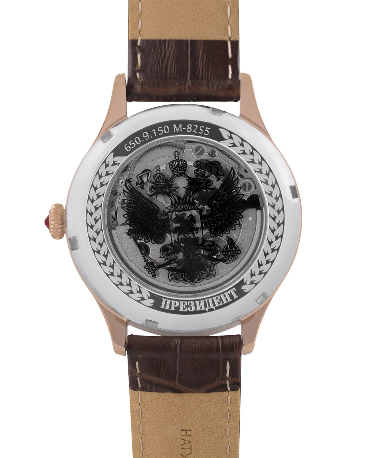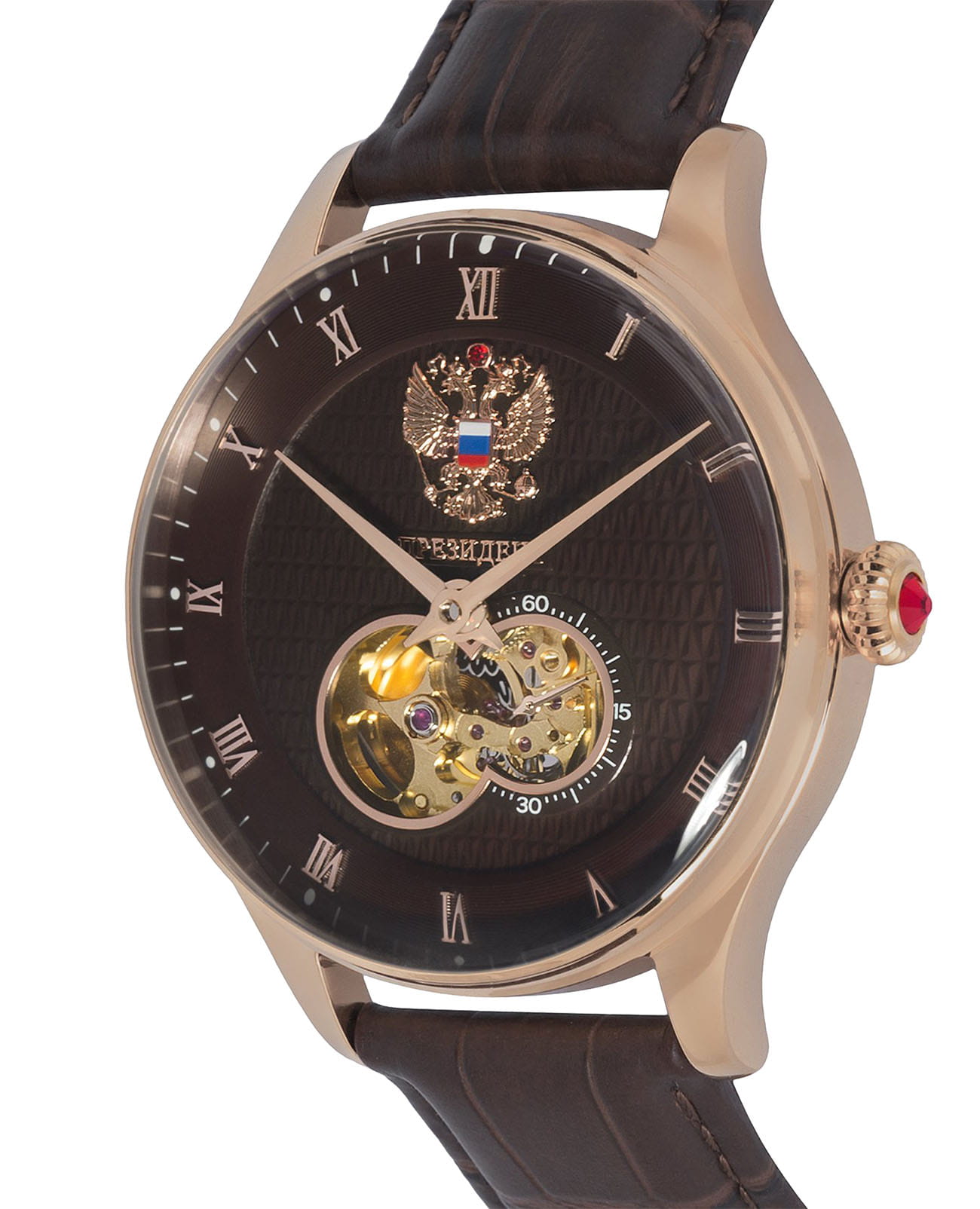 Мужские часы из коллекции «Президент» — это классический аксессуар, сочетающий в себе элегантность и надёжность. Модель выполнена в круглой форме с корпусом диаметром 42,5 мм и толщиной 16,3 мм, защищённым минеральным стекломМинеральное стеклоМинеральное стекло представляет собой искусственно выращенный минерал кварца. Такое стекло отличается особой устойчивостью к повреждениям и царапинам. Уступает по некоторым качествам сапфировому стеклу., устойчивым к мелким повреждениям. Браслет коричневого цвета изготовлен из натуральной кожи и дополнен стандартной застёжкой, что делает его удобным и практичным для повседневного использования. Часы оснащены механизмом с автоподзаводом, обеспечивающим точность хода и минимальное обслуживание. Прозрачная задняя крышка украшена изображением Герба России, что подчёркивает национальную принадлежность и уникальность модели. Водонепроницаемость позволяет использовать модель в повседневных условиях — при мытье рук или под лёгким дождём. Эти часы станут универсальным аксессуаром для тех, кто ценит сочетание стиля, качества и символики — идеальный выбор для уверенных в себе мужчин, следящих за своим имиджем и предпочитающих выделяться.