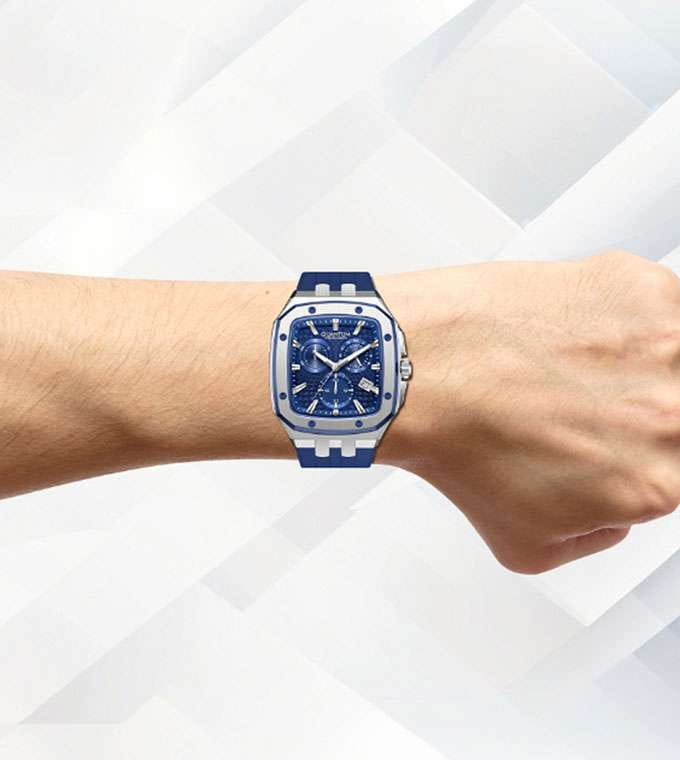 Мужские кварцевые часы Quantum из коллекции Hunter — крупные прямоугольные часы с ярким синим акцентом и функциональным хронографом. Корпус прямоугольный, из нержавеющей стали, размером 44 мм. БезельБезельВнешний ободок, закрепляющий стекло. В спортивных часах так называется поворотное кольцо с делениями на циферблате, выполняет роль таймера – замеряет отрезки времени на шкале. Неподвижный безель – элемент декора. Однонаправленно вращающийся безель на дайверских часах позволяет фиксировать моменты погружения и выныривания на поверхность. из нержавеющей стали с частичным PVD-покрытиемPVDУльтратонкое покрытие наносится в технике вакуумного напыления, сочетает в себе нитрид титана особой прочности со слоем золота или оксида хрома. Несёт в себе декоративную или защитную функцию.. Циферблат — синий с функциями хронографаХронографФункция позволяет измерять отрезки времени с особой точностью: часы, минуты, секунды. Верным признаком хронографа является наличие на циферблате 3 дополнительных окошек-счётчиков. и окошком даты. Стекло — минеральноеМинеральное стеклоМинеральное стекло представляет собой искусственно выращенный минерал кварца. Такое стекло отличается особой устойчивостью к повреждениям и царапинам. Уступает по некоторым качествам сапфировому стеклу. с антибликовым покрытием. Механизм — японский кварцевый Seiko. Водонепроницаемость 100 м. Ремешок — синий силиконовый на стандартной застёжке. Идеальный выбор для тех, кто ценит турецкий дизайн и спортивный стиль.