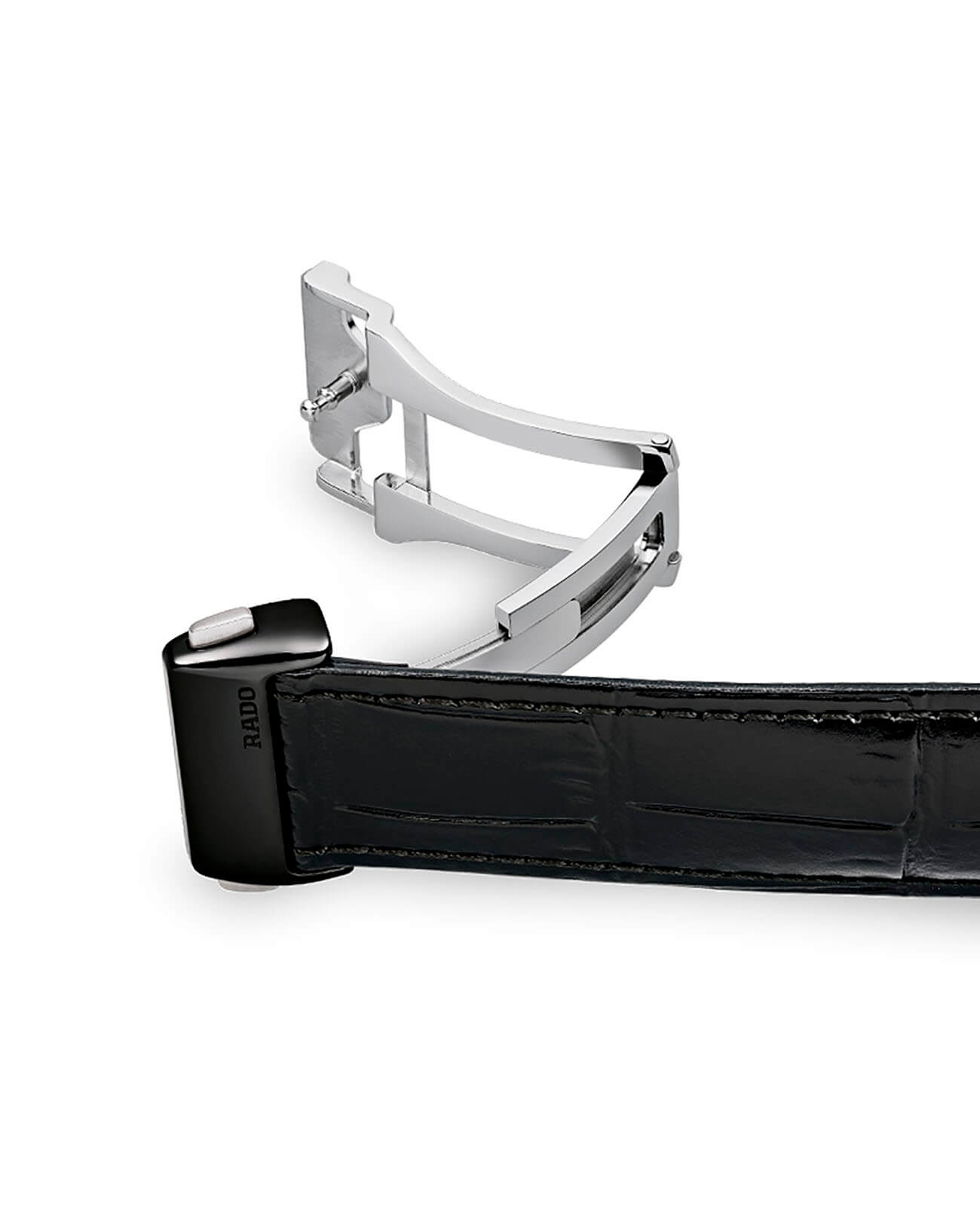 Оригинальный циферблат называют совершенством линий и лаконичности, необычное исполнение которого никого не оставляет равнодушным. Индикация времени занимает не всё пространство, секундный счётчик вынесен отдельно, серединка оставлена прозрачной. Наручные часы оснащаются автоматическим механизмом ETA 2899-S2 с запасом хода 42 часа, украшенным традиционным узором «женевские волны». Скелетонизированная задняя крышка. Антибликовое покрытие сапфирового стекла. Корпус и безельБезельВнешний ободок, закрепляющий стекло. В спортивных часах так называется поворотное кольцо с делениями на циферблате, выполняет роль таймера – замеряет отрезки времени на шкале. Неподвижный безель – элемент декора. Однонаправленно вращающийся безель на дайверских часах позволяет фиксировать моменты погружения и выныривания на поверхность. из высокотехнологичной керамикиВысокотехнологичная керамикаИнновационный запатентованный Rado материал с гладкой или матовой поверхностью. Керамика за счёт кристаллической структуры обладает повышенной устойчивостью от возникновения царапин. Материал способен принимать температуру тела человека, обеспечивая невероятный комфорт при ношении.. Ремешок из натуральной кожи. Апертура даты. Диаметр корпуса: 43 мм.