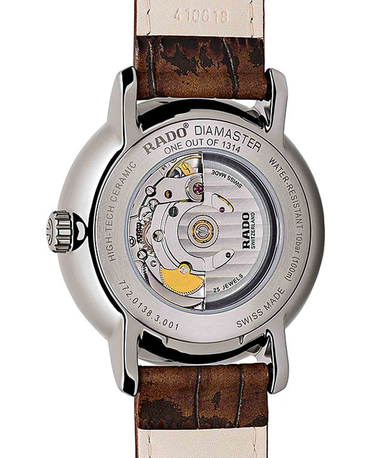 Мужские швейцарские механические часы-хронометр с автоподзаводом Rado Coupole R14138706. Сапфировое стеклоСапфировое стеклоПрочный и надёжный материал из кристалла сапфира синтетического происхождения, характеризующийся особой твёрдостью и устойчивостью к царапинам и повреждениям. устойчивое к мелким механическим повреждениям. Корпус часов изготовлен из высокотехнологичной керамикиВысокотехнологичная керамикаИнновационный запатентованный Rado материал с гладкой или матовой поверхностью. Керамика за счёт кристаллической структуры обладает повышенной устойчивостью от возникновения царапин. Материал способен принимать температуру тела человека, обеспечивая невероятный комфорт при ношении.. Циферблат украшен бриллиантами. Окошко даты находится в положении 6 часов. Класс водозащиты: 100 метров, позволит плавать, нырять и заниматься другими водными видами спорта. Кожаный ремешок на раскладной застёжкеРаскладная застёжкаТакой тип застёжки используется только на браслетах из металла. Она никогда не раскрывается полностью, происходит разделение на 2 и более частей. Раскладывающая застёжка снизит вероятность потери часов к минимуму..